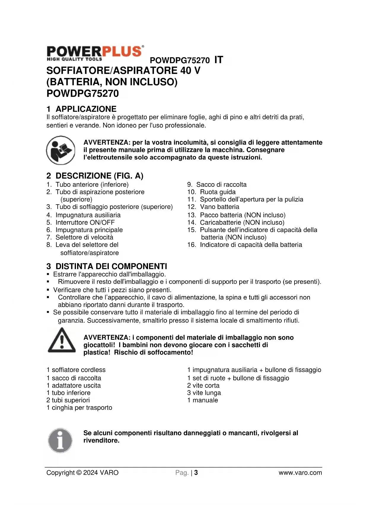 Con la presente, VARO – Vic. Van Rompuy N.V. – Joseph Van Instraat 9 – B2500 Lier, Belgio, dichiara unicamente che Descrizione dell’apparecchio: Soffiatore/Aspiratore 40 V Marchio: PowerPlus Numero articolo: POWDPG75270 è conforme ai requisiti essenziali e alle altre disposizioni pertinenti stabilite dalle Direttive/Regolamenti Europee in base all’applicazione delle norme europee armonizzate. Qualsiasi modifica effettuata sul prodotto rende nulla questa dichiarazione. Direttive/Regolamenti europee (inclusi eventuali emendamenti fino alla data della firma): 2011/65/EU 2006/42/EC 2014/30/EU 2000/14/EC Annex V LwA Measured 99 dB(A) Guaranteed 106 dB(A) Norme europee armonizzate (inclusi eventuali emendamenti fino alla data della firma): EN60335-1 : 2012 EN50636-2-100 : 2014 EN55014-1 : 2021 EN55014-2 : 2021 Depositario della documentazione tecnica: Philippe Vankerkhove, VARO – Vic. Van Rompuy N.V. Il sottoscritto agisce in nome e per conto del CEO della società, Ludo Mertens Certification Manager 05/12/2023, Lier - BelgiumPOWDPG75270 PT Copyright © 2024 VARO Página | 1 www.varo.com 1 APLICAÇÃO.................................................................................... 3