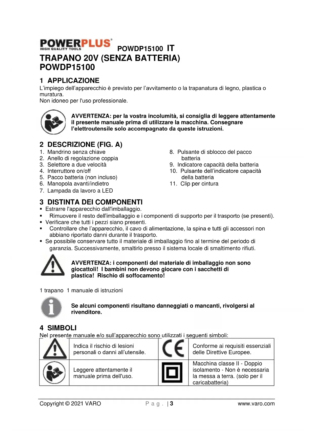 Macchina classe II - Doppio isolamento - Non è necessaria la messa a terra. (solo per il caricabatteria)POWDP15100 IT Copyright © 2021 VARO P a g . | 4 www.varo.com