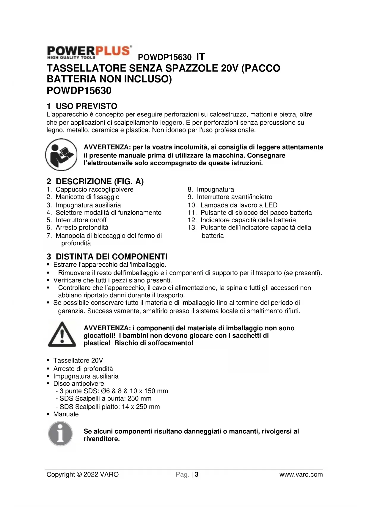 - Proteggere gli occhi e le persone vicine da particelle espulse o da schegge. Indossare il casco protettivo! Usare degli schermi!POWDP15630 IT Copyright © 2022 VARO Pag. | 7 www.varo.com