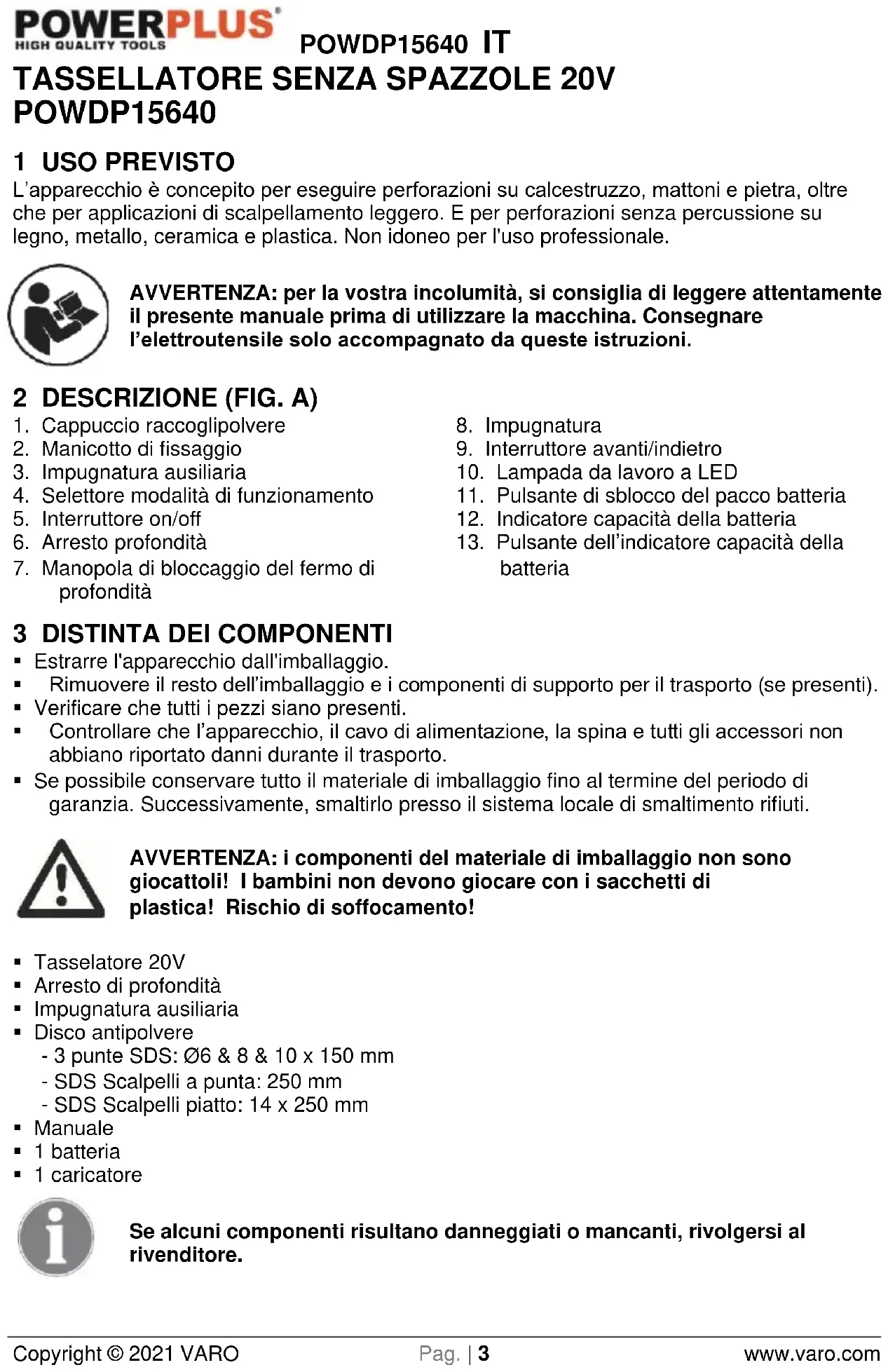 AVVERTENZA: per la vostra incolumità, si consiglia di leggere attendamente il presente manuale prima di utilizzato la macchina. Consegnare l'eletttroutensile solo accompagnato da queste istruzioni.