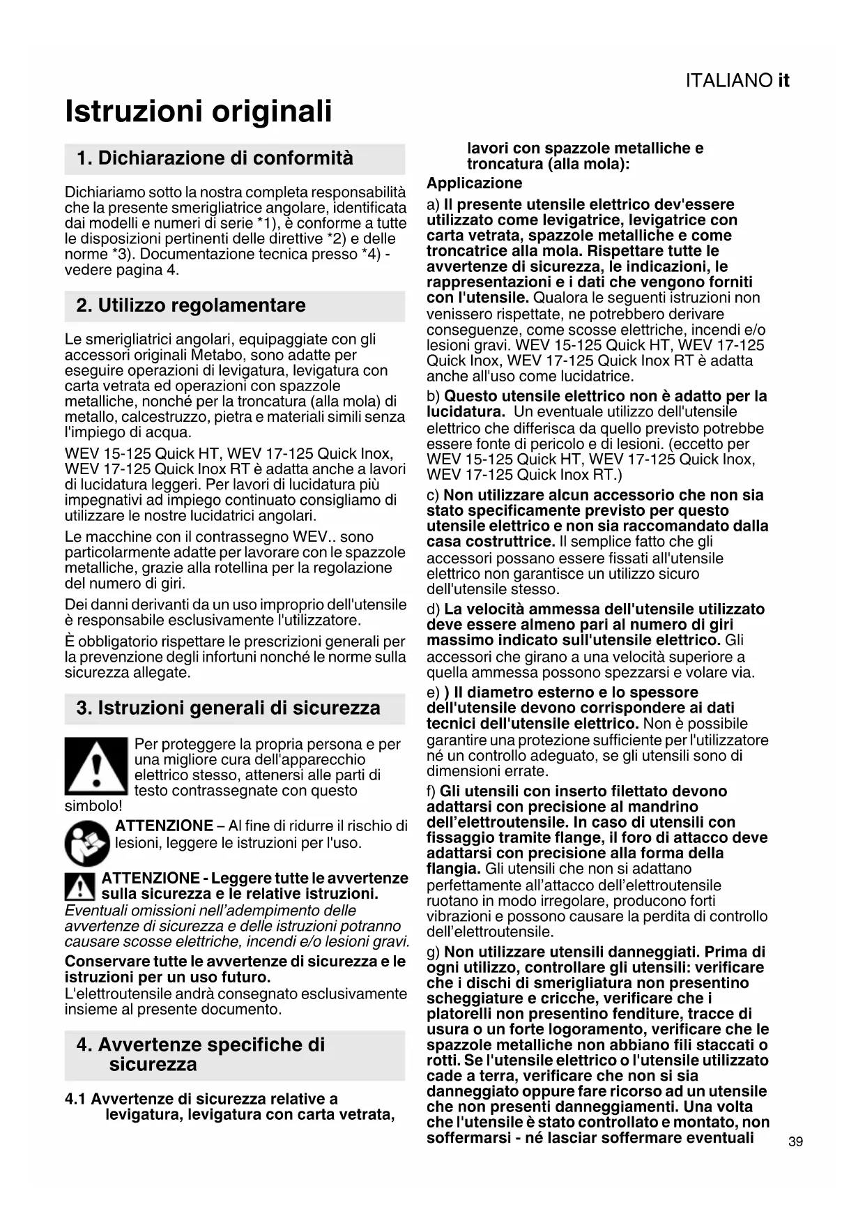 Istruzioni originali Dichiariamo sotto la nostra completa responsabilità che la presente smerigliatrice angolare, identificata dai modelli e numeri di serie *1), è conforme a tutte le disposizioni pertinenti delle direttive *2) e delle norme *3). Documentazione tecnica presso *4) - vedere pagina 4. Le smerigliatrici angolari, equipaggiate con gli accessori originali Metabo, sono adatte per eseguire operazioni di levigatura, levigatura con carta vetrata ed operazioni con spazzole metalliche, nonché per la troncatura (alla mola) di metallo, calcestruzzo, pietra e materiali simili senza l'impiego di acqua. WEV 15-125 Quick HT, WEV 17-125 Quick Inox, WEV 17-125 Quick Inox RT è adatta anche a lavori di lucidatura leggeri. Per lavori di lucidatura più impegnativi ad impiego continuato consigliamo di utilizzare le nostre lucidatrici angolari. Le macchine con il contrassegno WEV.. sono particolarmente adatte per lavorare con le spazzole metalliche, grazie alla rotellina per la regolazione del numero di giri. Dei danni derivanti da un uso improprio dell'utensile è responsabile esclusivamente l'utilizzatore. È obbligatorio rispettare le prescrizioni generali per la prevenzione degli infortuni nonché le norme sulla sicurezza allegate. Per proteggere la propria persona e per una migliore cura dell'apparecchio elettrico stesso, attenersi alle parti di testo contrassegnate con questo simbolo! ATTENZIONE – Al fine di ridurre il rischio di lesioni, leggere le istruzioni per l'uso. ATTENZIONE - Leggere tutte le avvertenze sulla sicurezza e le relative istruzioni. Eventuali omissioni nell’adempimento delle avvertenze di sicurezza e delle istruzioni potranno causare scosse elettriche, incendi e/o lesioni gravi. Conservare tutte le avvertenze di sicurezza e le istruzioni per un uso futuro. L'elettroutensile andrà consegnato esclusivamente insieme al presente documento.