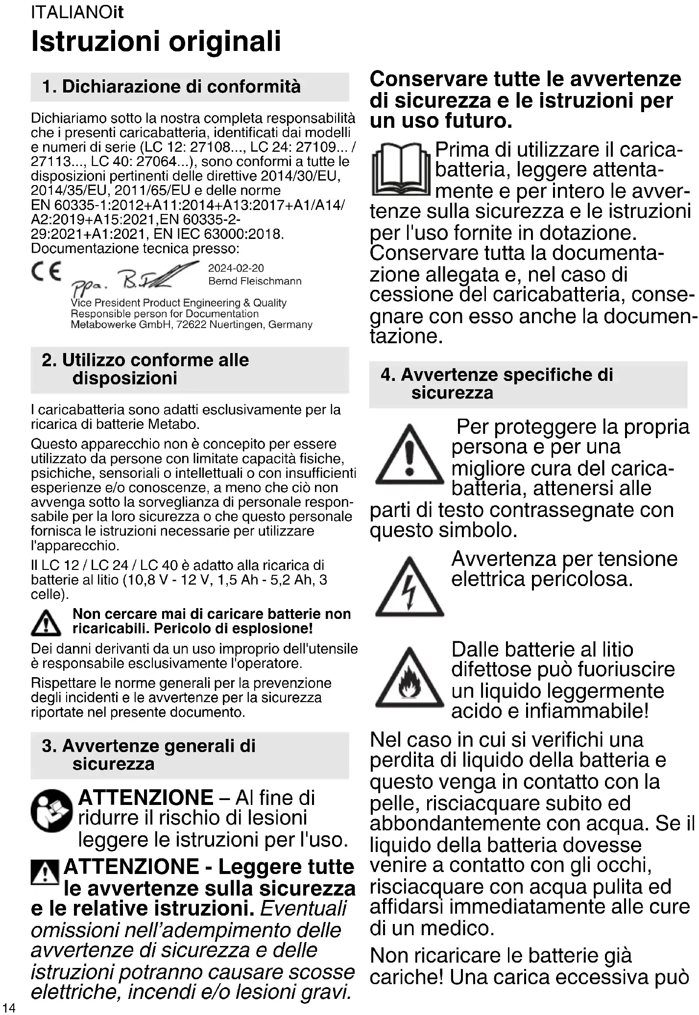 sicurezza 2024-02-20 Bernd FleischmannVice President Product Engineering & QualityResponsible person for Documentation Metabowerke GmbH, 72622 Nuertingen, Germany