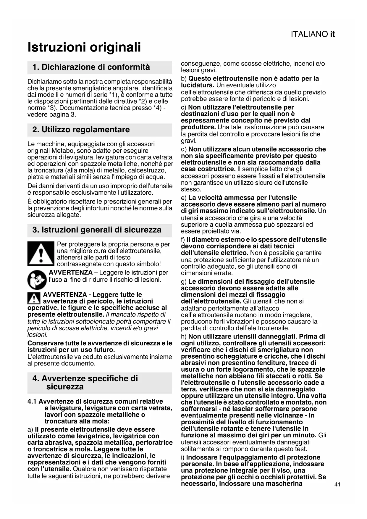 4.1 Avvertenze di sicurezza comuni relative a levigatura, levigatura con carta vetrata, lavori con spazzole metalliche o troncatura alla mola: