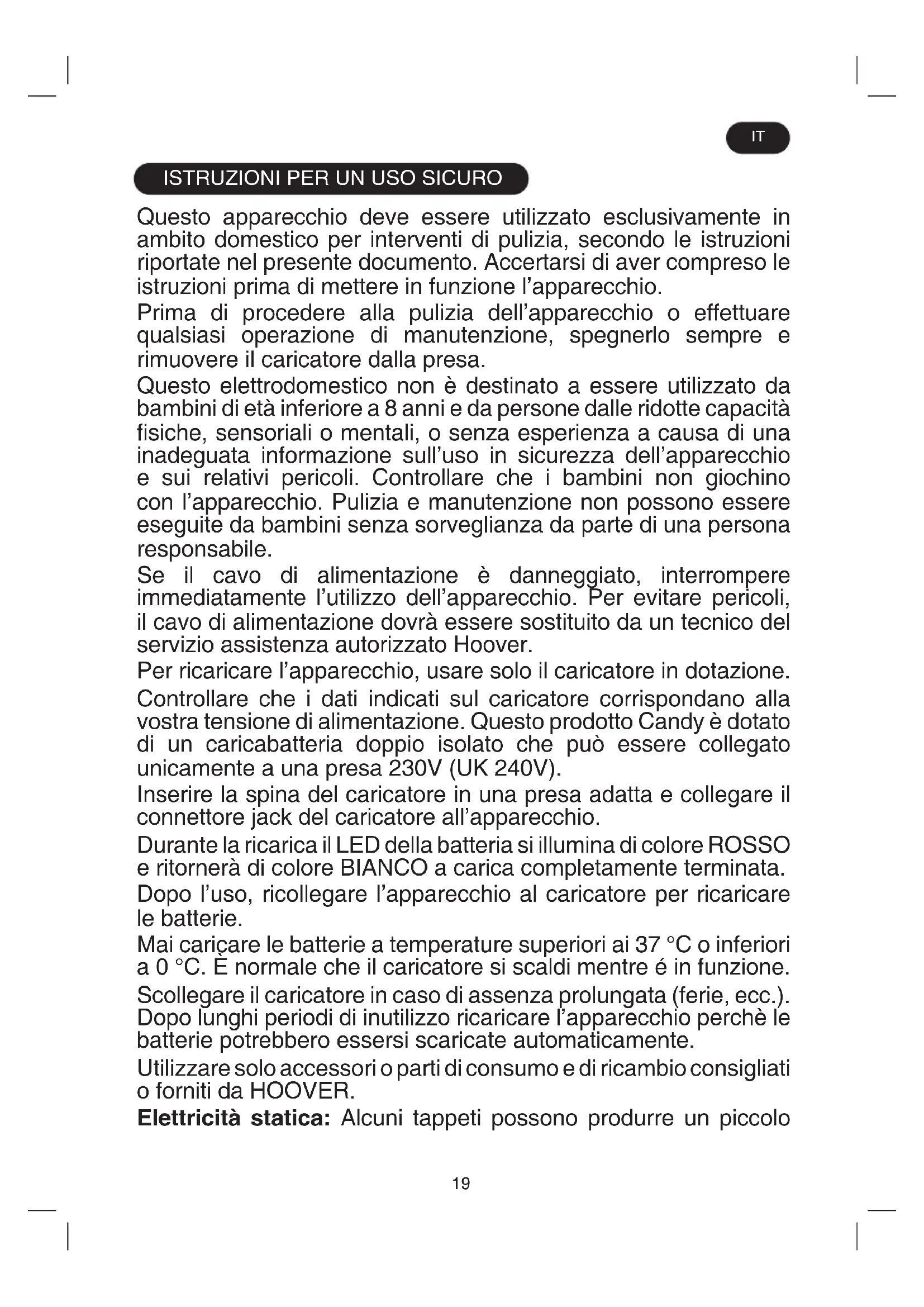 Questo apparecchio deve essere utilizzato esclusivamente in ambito domestico per interventi di pulizia, secondo le istruzioni riportate nel presente documento. Accertarsi di aver compreso le istruzioni prima di mettere in funzione l’apparecchio. Prima di procedere alla pulizia dell’apparecchio o effettuare qualsiasi operazione di manutenzione, spegnerlo sempre e rimuovere il caricatore dalla presa. Questo elettrodomestico non è destinato a essere utilizzato da bambini di età inferiore a 8 anni e da persone dalle ridotte capacità fisiche, sensoriali o mentali, o senza esperienza a causa di una inadeguata informazione sull’uso in sicurezza dell’apparecchio e sui relativi pericoli. Controllare che i bambini non giochino con l’apparecchio. Pulizia e manutenzione non possono essere eseguite da bambini senza sorveglianza da parte di una persona responsabile. Se il cavo di alimentazione è danneggiato, interrompere immediatamente l’utilizzo dell’apparecchio. Per evitare pericoli, il cavo di alimentazione dovrà essere sostituito da un tecnico del servizio assistenza autorizzato Hoover. Per ricaricare l’apparecchio, usare solo il caricatore in dotazione. Controllare che i dati indicati sul caricatore corrispondano alla vostra tensione di alimentazione. Questo prodotto Candy è dotato di un caricabatteria doppio isolato che può essere collegato unicamente a una presa 230V (UK 240V). Inserire la spina del caricatore in una presa adatta e collegare il connettore jack del caricatore all’apparecchio. Durante la ricarica il LED della batteria si illumina di colore ROSSO e ritornerà di colore BIANCO a carica completamente terminata. Dopo l’uso, ricollegare l’apparecchio al caricatore per ricaricare le batterie. Mai caricare le batterie a temperature superiori ai 37 °C o inferiori a 0 °C. È normale che il caricatore si scaldi mentre é in funzione. Scollegare il caricatore in caso di assenza prolungata (ferie, ecc.). Dopo lunghi periodi di inutilizzo ricaricare l’apparecchio perchè le batterie potrebbero essersi scaricate automaticamente. Utilizzare solo accessori o parti di consumo e di ricambio consigliati o forniti da HOOVER. Elettricità statica: Alcuni tappeti possono produrre un piccolo IT20 accumulo di elettricità statica. Le cariche di elettricità statica non sono pericolose per la salute. Tenere le mani, i piedi, i capi di abbigliamento non attillati e i capelli lontani dalle spazzole rotanti. Non scollegare il caricatore tirando il cavo. Non utilizzare l’apparecchio all’aperto, su superfici bagnate o per aspirare liquidi. Non aspirare oggetti solidi o appuntiti, fiammiferi, ceneri calde, mozziconi di sigaretta o similari. Non vaporizzare o aspirare liquidi infiammabili, detergenti, bombolette o i loro vapori. Non calpestare il cavo di alimentazione durante l’utilizzo dell’apparecchio o scollegare la spina dalla presa tirando il cavo di alimentazione. Non continuare a utilizzare l’apparecchio o il caricatore in caso di presunto guasto. Non utilizzare l’apparecchio per l’igiene della persona o degli animali. Non sostituire le batterie con batterie non ricaricabili. Assistenza Hoover: per garantire un funzionamento sempre sicuro ed efficiente dell’apparecchiatura, si consiglia di fare eseguire eventuali interventi di assistenza o di riparazione dai tecnici del servizio assistenza autorizzato Hoover. Disposizioni sullo smaltimento dell’apparecchio Se l’apparecchio è da smaltire, le batterie devono prima essere rimosse. Rimuovere la batteria solo quando l’apparecchio è scollegato dalla rete di alimentazione. Smaltire le batterie in sicurezza. Far funzionare l’apparecchio fino al suo arresto ed assicurarsi che le batterie siano completamente scariche. Le batterie usate devono essere riposte in un centro di riciclaggio e non smaltite con i rifiuti domestici. Per rimuovere le batterie, si prega di contattare il Centro Servizi per Assistenza Clienti Hoover o procedere in base alle seguenti istruzioni. IMPORTANTE: Scaricare sempre completamente le batterie prima della rimozione. Far funzionare l’apparecchio finché le batterie non sono completamente scariche. Rimuovere il connettore jack per la ricarica dall’apparecchio. Premere il pulsante di rilascio per far scorrerre la batteria ed estrarla. NOTA: Se si riscontrano difficoltà a smantellare l’unità o per informazioni più dettagliate sul trattamento, recupero e riciclaggio di questo apparecchio, si prega di contattare l’ufficio comunale per il servizio smaltimento rifiuti.