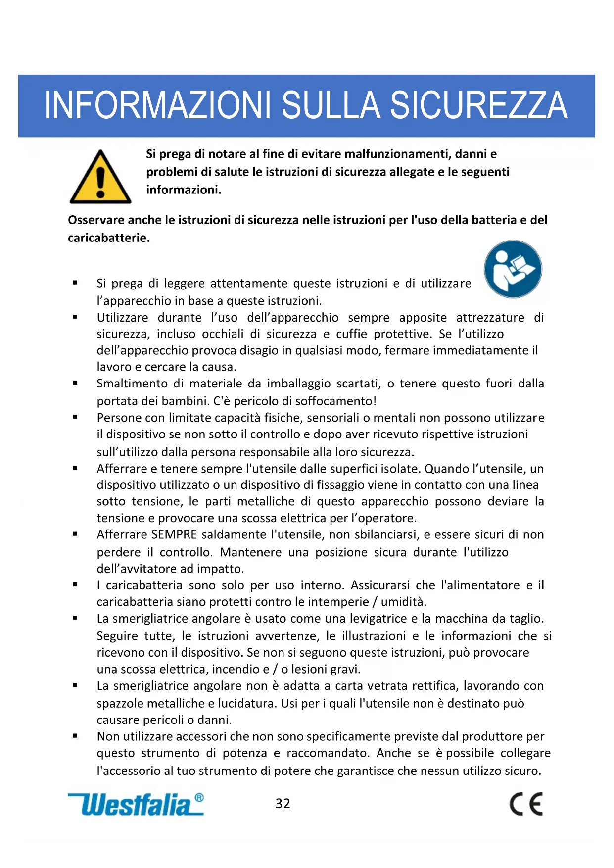 Batteries n'appartiennent pas à la poubelle. Vous pouvez le charger de nouveau à nous Envoyer ou livrer dans les magasins locaux ou des points de collecte des piles.32 Si prega di notare al fine di evitare malfunzionamenti, danni e problemi di salute le istruzioni di sicurezza allegate e le seguenti informazioni. Osservare anche le istruzioni di sicurezza nelle istruzioni per l'uso della batteria e del caricabatterie.