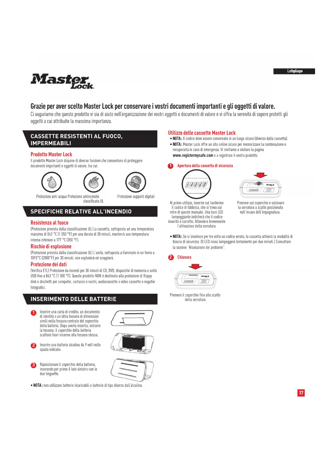 Grazie per aver scelto Master Lock per conservare i vostri documenti importanti e gli oggetti di valore.