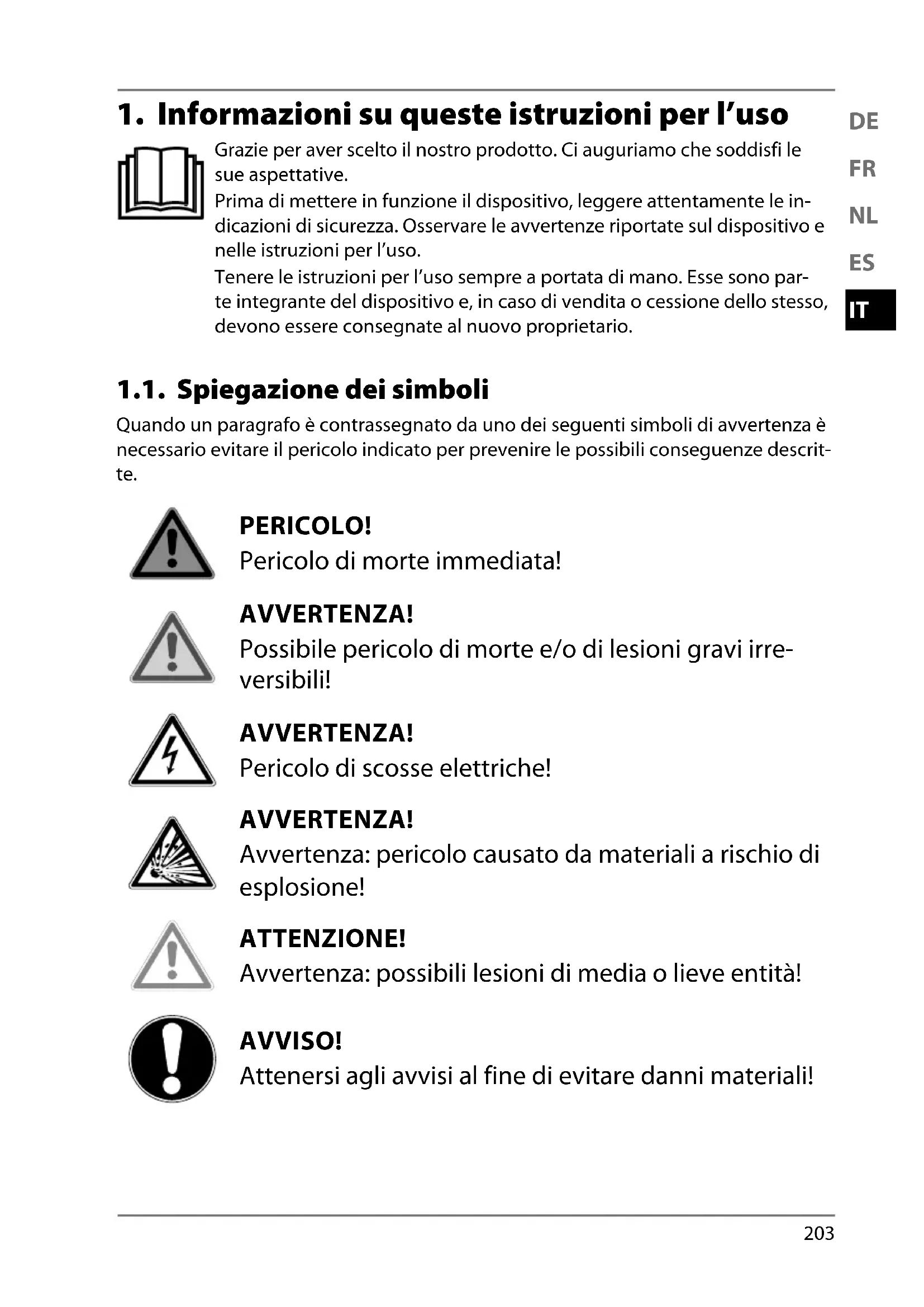Grazie per aver scelto il nostro prodotto. Ci auguriamo che soddisfi le sue aspettative. Prima di mettere in funzione il dispositivo, leggere attentamente le in- dicazioni di sicurezza. Osservare le avvertenze riportate sul dispositivo e nelle istruzioni per l’uso. Tenere le istruzioni per l’uso sempre a portata di mano. Esse sono par- te integrante del dispositivo e, in caso di vendita o cessione dello stesso, devono essere consegnate al nuovo proprietario. 1.1. Spiegazione dei simboli Quando un paragrafo è contrassegnato da uno dei seguenti simboli di avvertenza è necessario evitare il pericolo indicato per prevenire le possibili conseguenze descrit- te. PERICOLO! Pericolo di morte immediata! AVVERTENZA! Possibile pericolo di morte e/o di lesioni gravi irre- versibili! AVVERTENZA! Pericolo di scosse elettriche! AVVERTENZA! Avvertenza: pericolo causato da materiali a rischio di esplosione! ATTENZIONE! Avvertenza: possibili lesioni di media o lieve entità! AVVISO! Attenersi agli avvisi al fine di evitare danni materiali!204 Ulteriori informazioni sull’utilizzo del dispositivo! AVVISO! Attenersi agli avvisi contenuti nelle istruzioni per l’uso!