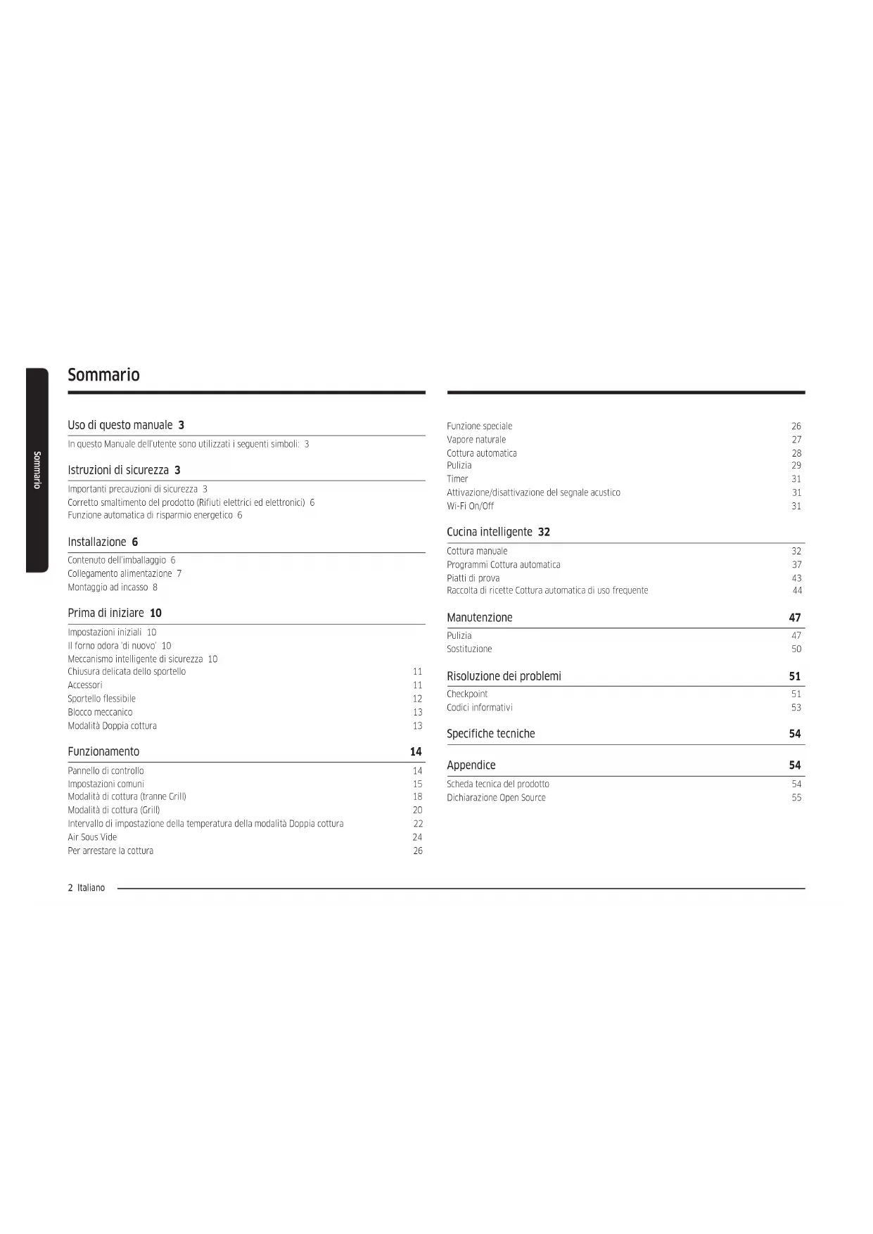 - (opłata według taryfy operatora) http://www.samsung.com/pl/support/ ROMANIA 0800872678 - Apel gratuit *8000 - Apel tarifat în reţea www.samsung.com/ro/support SERBIA 011 321 6899 www.samsung.com/rs/support SLOVAKIA 0800 - SAMSUNG (0800-726 786) www.samsung.com/sk/support LITHUANIA 8-800-77777 www.samsung.com/lt/support LATVIA 8000-7267 www.samsung.com/lv/support ESTONIA 800-7267 www.samsung.com/ee/support SLOVENIA 080 697 267 (brezplačna številka) www.samsung.com/si/support KOSOVO 038 40 30 90 www.samsung.com/support DG68-01413C-01Forno da incasso Manuale dell’utente e di installazione NV7B441**** / NV7B442**** / NV7B443**** / NV7B444**** / NV7B445**** / NV7B441**C* / NV7B442**C* / NV7B444**C* / NV7B451**** / NV7B452**** / NV7B453**** / NV7B454**** / NV7B455****2 Italiano Sommario Sommario Uso di questo manuale 3 In questo Manuale dell’utente sono utilizzati i seguenti simboli: 3 Istruzioni di sicurezza 3 Importanti precauzioni di sicurezza 3 Corretto smaltimento del prodotto (Rifiuti elettrici ed elettronici) 6 Funzione automatica di risparmio energetico 6 Installazione 6 Contenuto dell’imballaggio 6 Collegamento alimentazione 7 Montaggio ad incasso 8 Prima di iniziare 10 Impostazioni iniziali 10 Il forno odora ’di nuovo’ 10 Meccanismo intelligente di sicurezza 10 Chiusura delicata dello sportello 11 Accessori 11 Sportello flessibile 12 Blocco meccanico 13 Modalità Doppia cottura 13 Funzionamento 14 Pannello di controllo 14 Impostazioni comuni 15 Modalità di cottura (tranne Grill) 18 Modalità di cottura (Grill) 20 Intervallo di impostazione della temperatura della modalità Doppia cottura 22 Air Sous Vide 24 Per arrestare la cottura 26 Funzione speciale 26 Vapore naturale 27 Cottura automatica 28 Pulizia 29 Timer 31 Attivazione/disattivazione del segnale acustico 31 Wi-Fi On/Off 31 Cucina intelligente 32 Cottura manuale 32 Programmi Cottura automatica 37 Piatti di prova 43 Raccolta di ricette Cottura automatica di uso frequente 44 Manutenzione 47 Pulizia 47 Sostituzione 50 Risoluzione dei problemi 51 Checkpoint 51 Codici informativi 53 Specifiche tecniche 54 Appendice 54 Scheda tecnica del prodotto 54 Dichiarazione Open Source 55Italiano 3 Uso di questo manuale Istruzioni di sicurezza L’installazione del forno deve essere effettuata esclusivamente da un elettricista qualificato. L’installatore è responsabile del collegamento elettrico dell’apparecchio in base alle normative relative alla sicurezza. Importanti precauzioni di sicurezza AVVERTENZA L’apparecchio non è inteso per l’uso da parte di persone (bambini inclusi) con ridotte capacità fisiche, sensoriali o mentali, inesperte o prive di una adeguata conoscenza, a meno che una persona responsabile per la loro sicurezza fornisca loro una corretta supervisione e istruzione all’uso. Sorvegliare i bambini affinché non giochino con l’apparecchio. Il sistema di sconnessione deve essere incorporato nel cablaggio secondo quanto previsto dalle normative vigenti. Questo apparecchio deve poter essere scollegato dall’alimentazione una volta installato. La disconnessione è ottenibile permettendo il libero accesso alla spina del cavo di alimentazione o incorporando un interruttore nel cablaggio seguendo le specifiche di cablaggio. Se il cavo di alimentazione è danneggiato, richiederne la sostituzione al produttore, a un tecnico dell’assistenza o un tecnico specializzato al fine di evitare potenziali pericoli. Uso di questo manuale Grazie per aver acquistato un Forno da incasso SAMSUNG. Questo manuale contiene informazioni importanti per la vostra sicurezza e istruzioni per un uso e una manutenzione corretti del vostro prodotto. Si prega di leggere completamente questo Manuale dell’utente prima di utilizzare il prodotto e di conservare questa documentazione per future esigenze. In questo Manuale dell’utente sono utilizzati i seguenti simboli: AVVERTENZA Pericoli o pratiche non sicure che possono causare lesioni personali gravi e/o danni materiali. ATTENZIONE Pericoli o pratiche non sicure che possono causare lesioni personali e/o danni materiali. NOTA Consigli, raccomandazioni e informazioni utili per un uso corretto del prodotto.4 Italiano Istruzioni di sicurezza Istruzioni di sicurezza Tra i metodi di fissaggio non è previsto l’uso di adesivi in quanto non sono considerati un metodo di fissaggio affidabile. Questo apparecchio può essere utilizzato da bambini di età superiore agli 8 anni e da persone con ridotte capacità fisiche, sensoriali o mentali o senza esperienza o conoscenza del prodotto solo sotto la supervisione di una persona responsabile o nel caso in cui abbiano ricevuto informazioni specifiche sull’uso sicuro dell’apparecchio e ne abbiano compreso i rischi ad esso associati. Non consentire ai bambini di giocare con l’apparecchio. La pulizia e la manutenzione dell’apparecchio non devono essere eseguite da bambini senza la supervisione di un adulto. Tenere il prodotto e il cavo di alimentazione lontano dalla portata di bambini di età inferiore a 8 anni. Durante l’uso questo prodotto diventa bollente. Prestare attenzione a non toccare gli elementi riscaldanti all’interno del forno. AVVERTENZA: Le parti accessibili diventano bollenti durante l’uso. Tenere i bambini lontani dal prodotto. Per pulire lo sportello del forno non utilizzare prodotti abrasivi o raschietti di metallo; potrebbero graffiare la superficie e ciò potrebbe mandare in frantumi il vetro. Se il dispositivo è dotato di una funzione di pulizia automatica, l’eventuale condensa deve essere rimossa prima di procedere con la pulizia e tutti gli strumenti devono essere estratti dal forno durante la fase di emissione del vapore o di pulizia automatica. La funzione di pulizia dipende dal modello. Se questo apparecchio è dotato di una funzione di pulizia automatica, durante lo svolgimento di tale funzione le superfici potrebbero diventare molto più calde del normale e pertanto si consiglia di tenere i bambin