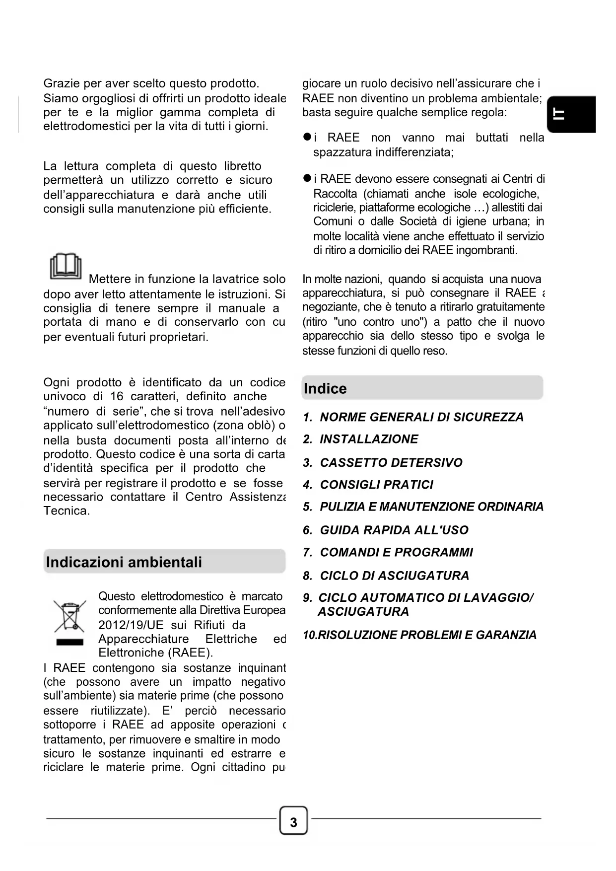 Grazie per aver scelto questo prodotto. Siamo orgogliosi di offrirti un prodotto ideale per te e la miglior gamma completa di elettrodomestici per la vita di tutti i giorni. La lettura completa di questo libretto permetterà un utilizzo corretto e sicuro dell’apparecchiatura e darà anche utili consigli sulla manutenzione più efficiente. Mettere in funzione la lavatrice solo dopo aver letto attentamente le istruzioni. Si consiglia di tenere sempre il manuale a portata di mano e di conservarlo con cura per eventuali futuri proprietari. Ogni prodotto è identificato da un codice univoco di 16 caratteri, definito anche “numero di serie”, che si trova nell’adesivo applicato sull’elettrodomestico (zona oblò) o nella busta documenti posta all’interno del prodotto. Questo codice è una sorta di carta d’identità specifica per il prodotto che servirà per registrare il prodotto e se fosse necessario contattare il Centro Assistenza Tecnica.