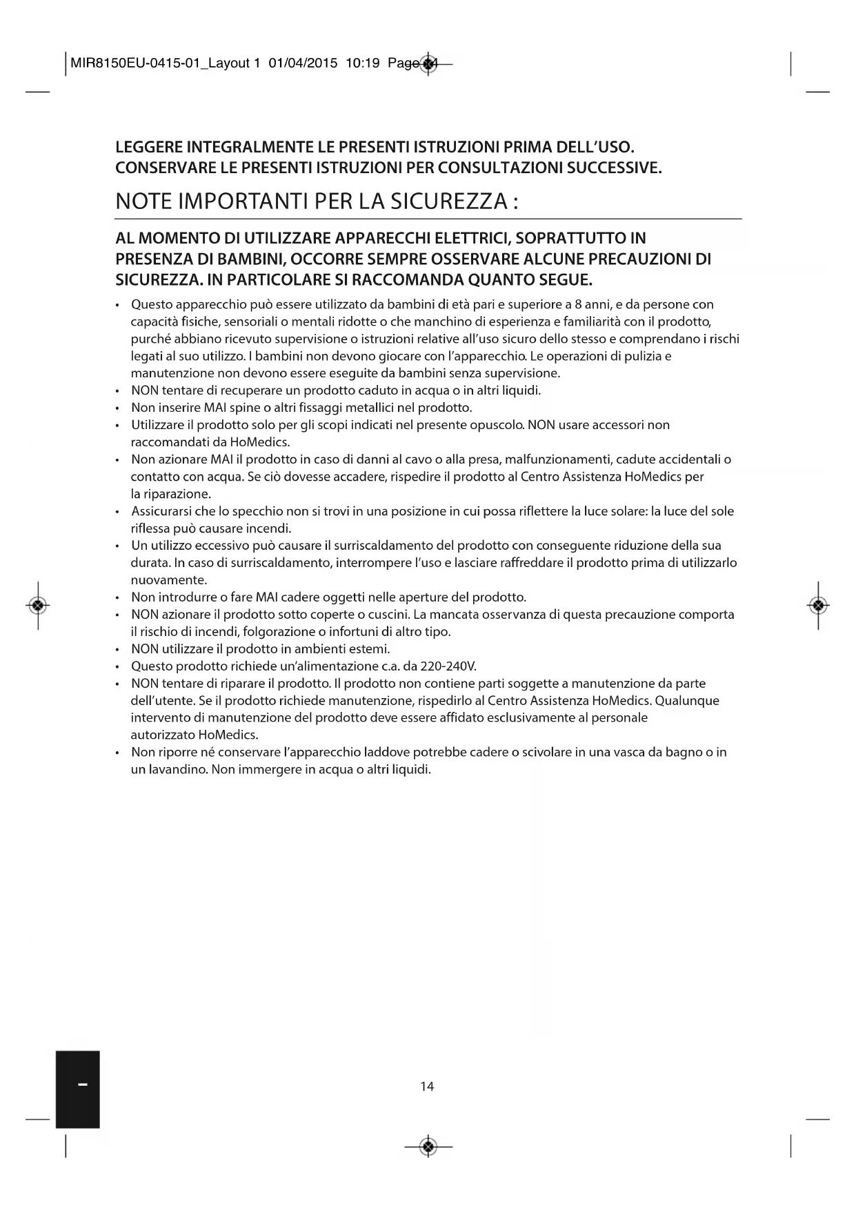 - Non riporre né conservare l’apparecchio laddove potrebbe cadere o scivolare in una vasca da bagno o in un lavandino. Non immergere in acqua o altri liquidi. MIR8150EU-0415-01_Layout 1 01/04/2015 10:19 Page 1415