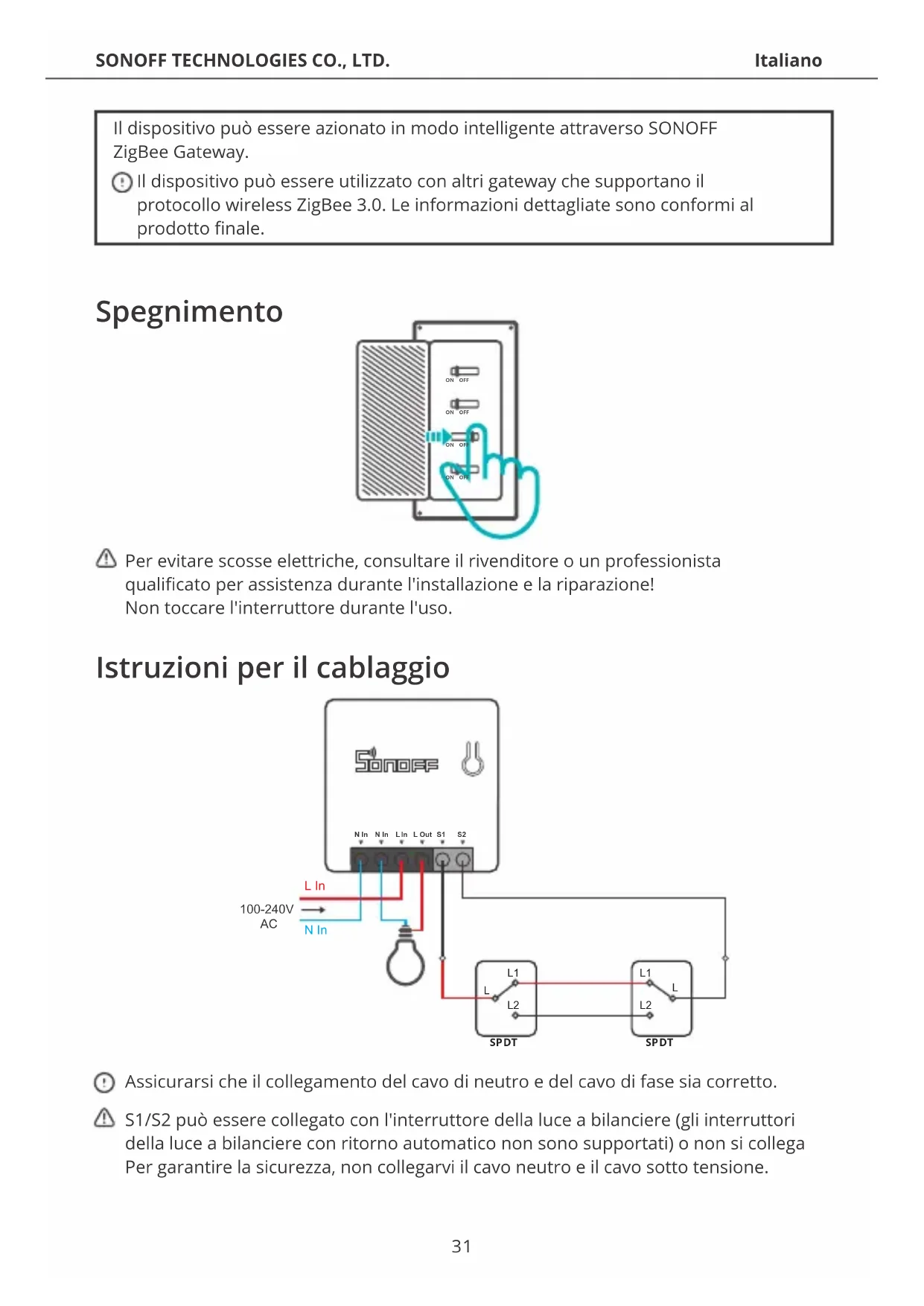 SPDT Italiano Il dispositivo può essere azionato in modo intelligente attraverso SONOFF ZigBee Gateway. Il dispositivo può essere utilizzato con altri gateway che supportano il protocollo wireless ZigBee 3.0. Le informazioni dettagliate sono conformi al prodotto finale. Spegnimento Per evitare scosse elettriche, consultare il rivenditore o un professionista qualificato per assistenza durante l'installazione e la riparazione! Non toccare l'interruttore durante l'uso. Istruzioni per il cablaggio Assicurarsi che il collegamento del cavo di neutro e del cavo di fase sia corretto. S1/S2 può essere collegato con l'interruttore della luce a bilanciere (gli interruttori della luce a bilanciere con ritorno automatico non sono supportati) o non si collega Per garantire la sicurezza, non collegarvi il cavo neutro e il cavo sotto tensione. 31Amazon Alexa