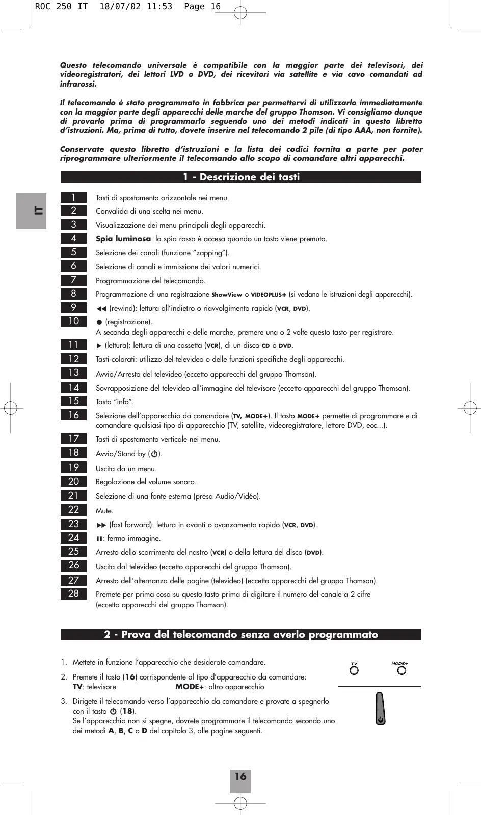Wenn die Taste B (18) nach einem ersten Druck innerhalb von einer Sekunde nochmals gedrückt und dieser zweite Tastendruck mehr als 2 Sekunden dauert, versendet die Fernbedienung nacheinander den OFF Code für alle Betriebsarten. ROC 250 IT 18/07/02 11:53 Page 16 Questo telecomando universale è compatibile con la maggior parte dei televisori, dei videoregistratori, dei lettori LVD o DVD, dei ricevitori via satellite e via cavo comandati ad infrarossi. Il telecomando è stato programmato in fabbrica per permettervi di utilizzarlo immediatamente con la maggior parte degli apparecchi delle marche del gruppo Thomson. Vi consigliamo dunque di provarlo prima di programmarlo seguendo uno dei metodi indicati in questo libretto d’istruzioni. Ma, prima di tutto, dovete inserire nel telecomando 2 pile (di tipo AAA, non fornite). Conservate questo libretto d’istruzioni e la lista dei codici fornita a parte per poter riprogrammare ulteriormente il telecomando allo scopo di comandare altri apparecchi.