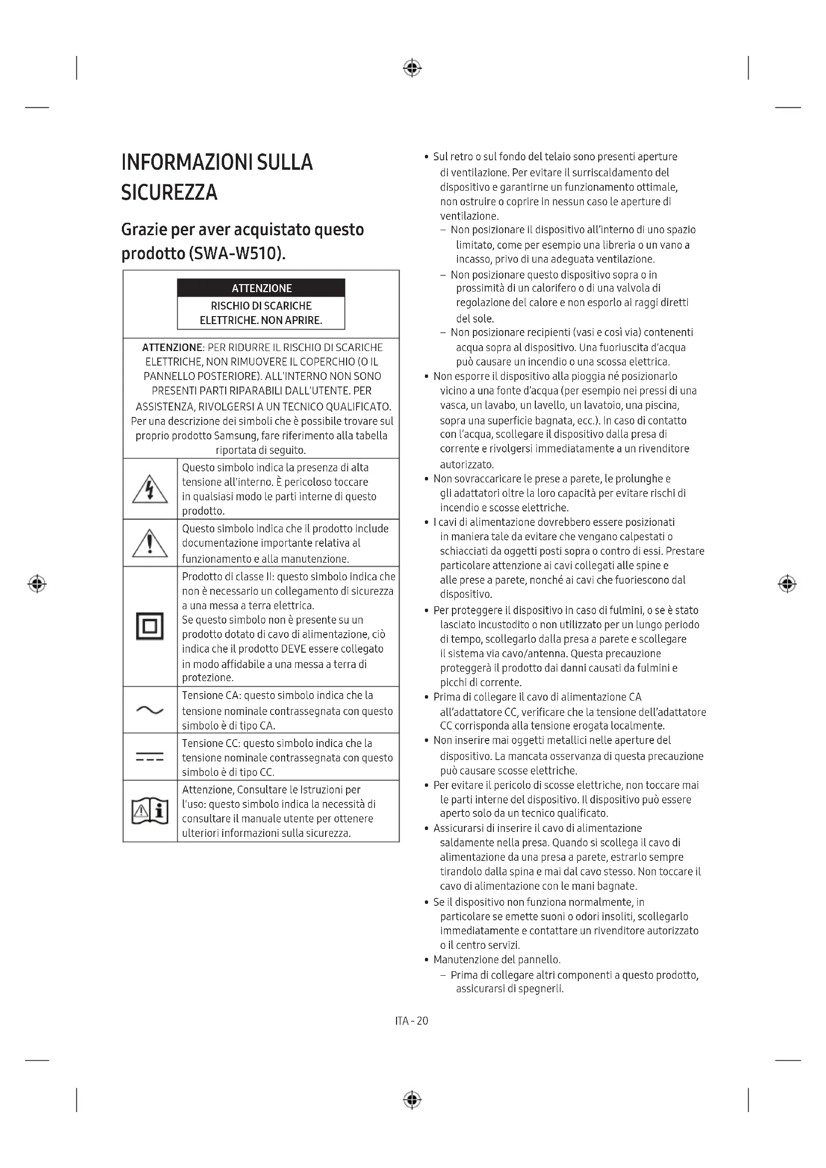 ASSISTENZA, RIVOLGERSI A UN TECNICO QUALIFICATO. Per una descrizione dei simboli che è possibile trovare sul proprio prodotto Samsung, fare riferimento alla tabella riportata di seguito. Questo simbolo indica la presenza di alta tensione all'interno. È pericoloso toccare in qualsiasi modo le parti interne di questo prodotto. Questo simbolo indica che il prodotto include documentazione importante relativa al funzionamento e alla manutenzione. Prodotto di classe II: questo simbolo indica che non è necessario un collegamento di sicurezza a una messa a terra elettrica. Se questo simbolo non è presente su un prodotto dotato di cavo di alimentazione, ciò indica che il prodotto DEVE essere collegato in modo afdabile a una messa a terra di protezione. Tensione CA: questo simbolo indica che la tensione nominale contrassegnata con questo simbolo è di tipo CA. Tensione CC: questo simbolo indica che la tensione nominale contrassegnata con questo simbolo è di tipo CC. Attenzione, Consultare le Istruzioni per l'uso: questo simbolo indica la necessità di consultare il manuale utente per ottenere ulteriori informazioni sulla sicurezza.