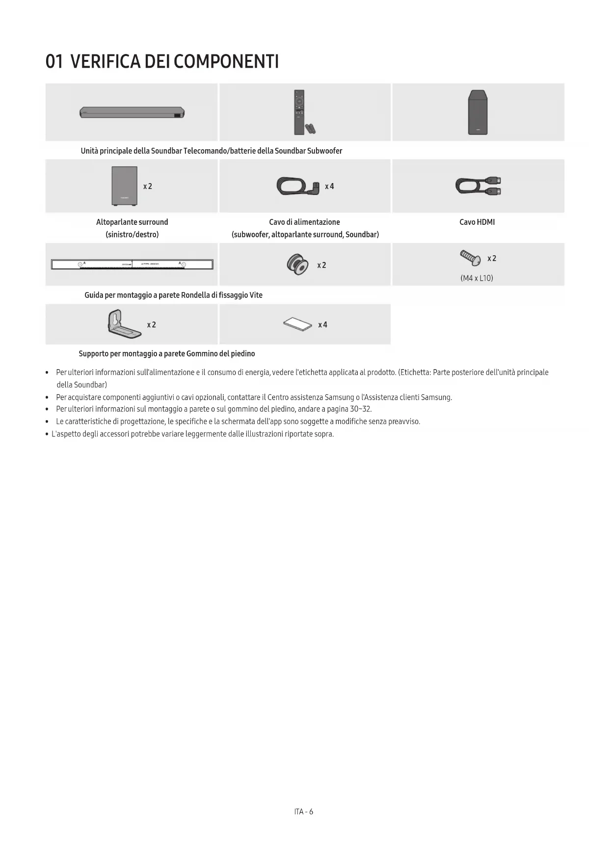 SOUNDBAR Unità principale della Soundbar Telecomando/batterie della Soundbar Subwoofer POWER x 2 x 4 Altoparlante surround (sinistro/destro) Cavo di alimentazione (subwoofer, altoparlante surround, Soundbar) Cavo HDMI A TYPE : 450mm x 2 x 2 (M4 x L10) Guida per montaggio a parete Rondella di ssaggio Vite x 2 x 4 Supporto per montaggio a parete Gommino del piedino