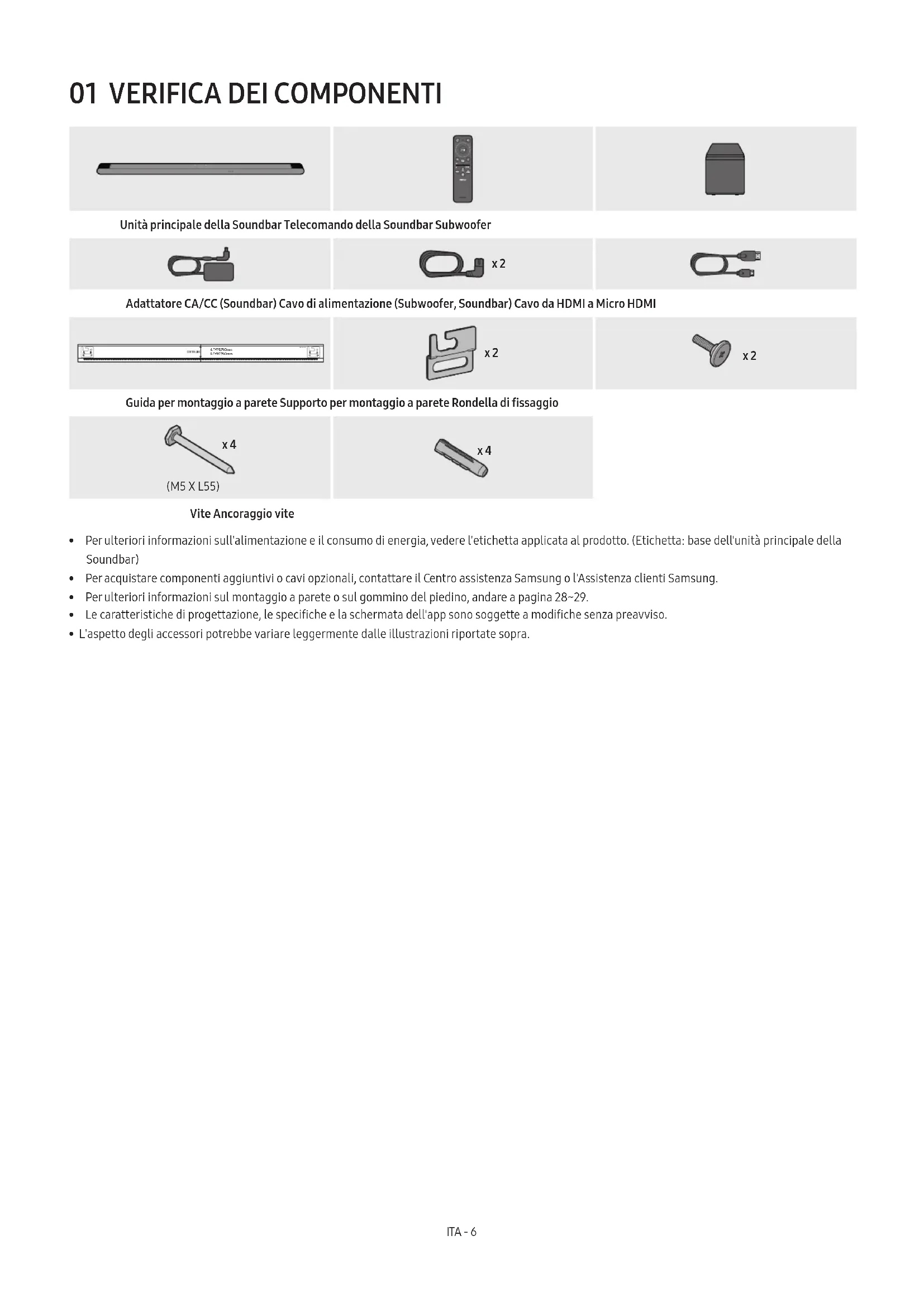 Unità principale della Soundbar Telecomando della Soundbar Subwoofer x 2 Adattatore CA/CC (Soundbar) Cavo di alimentazione (Subwoofer, Soundbar) Cavo da HDMI a Micro HDMI AH81-15127A-01 A TYPE