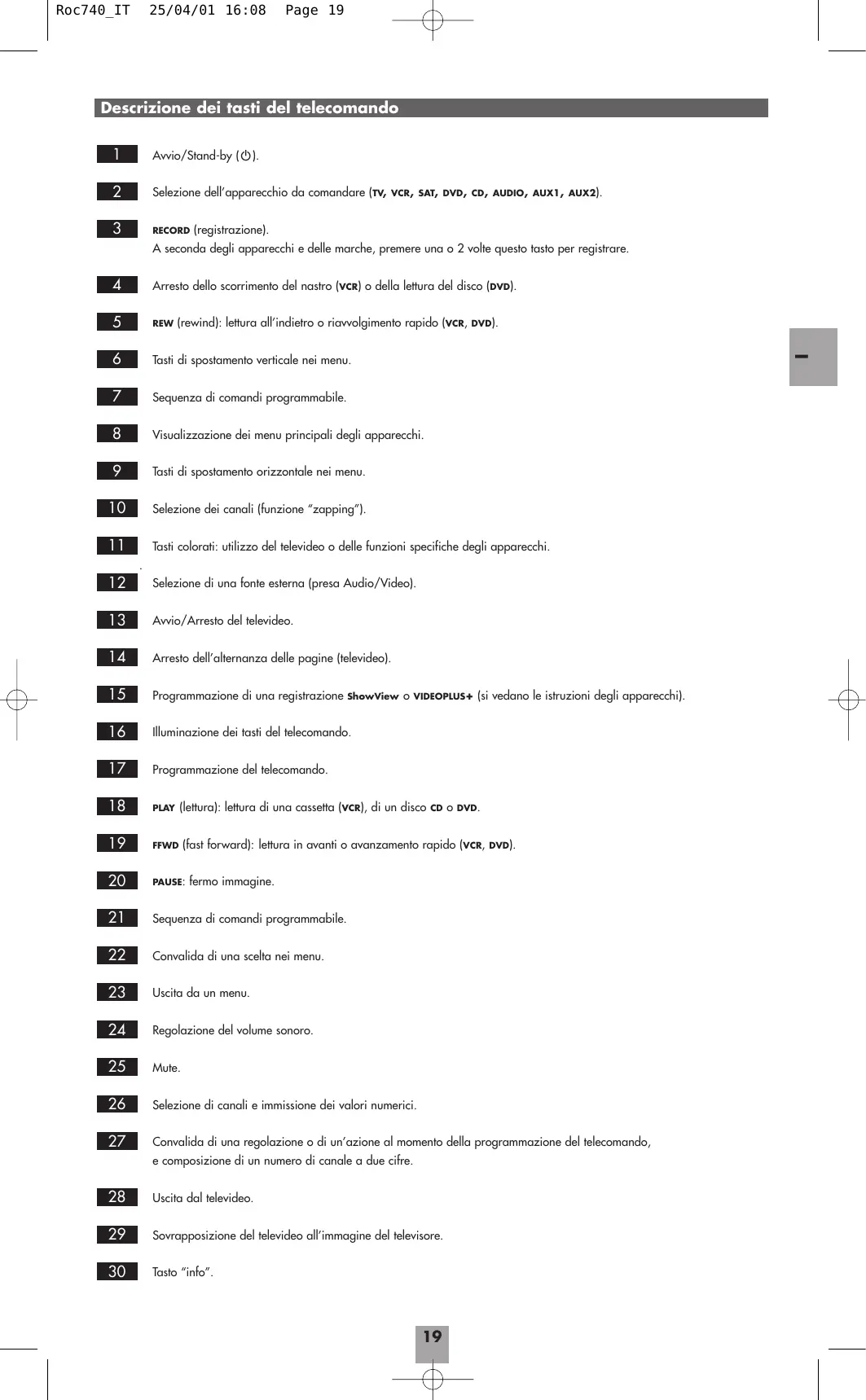 UP (17) Roc740_IT 25/04/01 16:08 Page 19 Descrizione dei tasti del telecomando