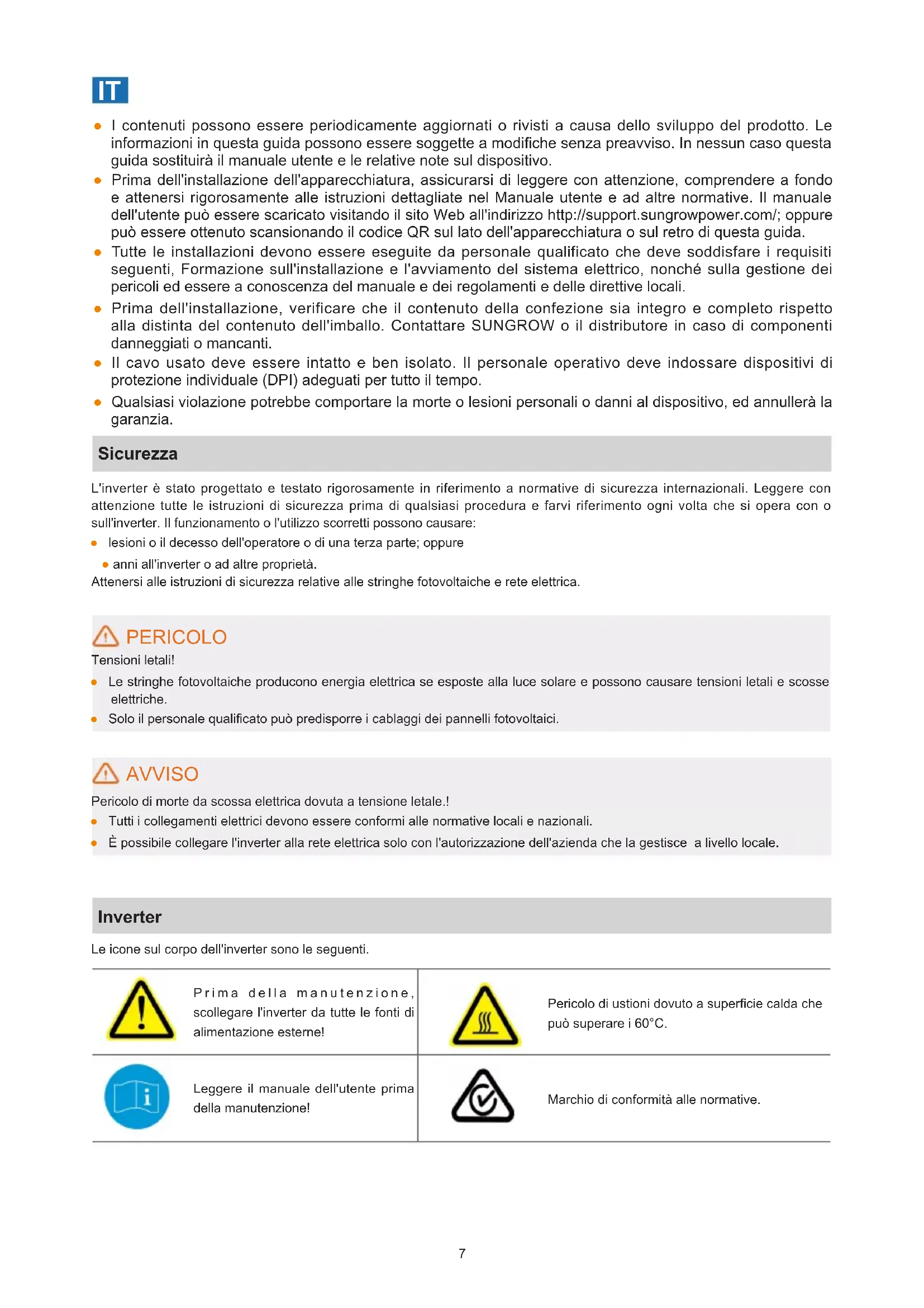 ● I contenuti possono essere periodicamente aggiornati o rivisti a causa dello sviluppo del prodotto. Le informazioni in questa guida possono essere soggette a modiche senza preavviso. In nessun caso questa guida sostituirà il manuale utente e le relative note sul dispositivo. ● Prima dell'installazione dell'apparecchiatura, assicurarsi di leggere con attenzione, comprendere a fondo e attenersi rigorosamente alle istruzioni dettagliate nel Manuale utente e ad altre normative. Il manuale dell'utente può essere scaricato visitando il sito Web all'indirizzo http://support.sungrowpower.com/; oppure può essere ottenuto scansionando il codice QR sul lato dell'apparecchiatura o sul retro di questa guida. ● Tutte le installazioni devono essere eseguite da personale qualificato che deve soddisfare i requisiti seguenti, Formazione sull'installazione e l'avviamento del sistema elettrico, nonché sulla gestione dei pericoli ed essere a conoscenza del manuale e dei regolamenti e delle direttive locali. ● Prima dell'installazione, verificare che il contenuto della confezione sia integro e completo rispetto alla distinta del contenuto dell'imballo. Contattare SUNGROW o il distributore in caso di componenti danneggiati o mancanti. ● Il cavo usato deve essere intatto e ben isolato. Il personale operativo deve indossare dispositivi di protezione individuale (DPI) adeguati per tutto il tempo. ● Qualsiasi violazione potrebbe comportare la morte o lesioni personali o danni al dispositivo, ed annullerà la garanzia. Sicurezza L'inverter è stato progettato e testato rigorosamente in riferimento a normative di sicurezza internazionali. Leggere con attenzione tutte le istruzioni di sicurezza prima di qualsiasi procedura e farvi riferimento ogni volta che si opera con o sull'inverter. Il funzionamento o l'utilizzo scorretti possono causare: ● lesioni o il decesso dell'operatore o di una terza parte; oppure ● anni all'inverter o ad altre proprietà. Attenersi alle istruzioni di sicurezza relative alle stringhe fotovoltaiche e rete elettrica. PERICOLO Tensioni letali! ● Le stringhe fotovoltaiche producono energia elettrica se esposte alla luce solare e possono causare tensioni letali e scosse elettriche. ● Solo il personale qualicato può predisporre i cablaggi dei pannelli fotovoltaici. AVVISO Pericolo di morte da scossa elettrica dovuta a tensione letale.! ● Tutti i collegamenti elettrici devono essere conformi alle normative locali e nazionali. ● È possibile collegare l'inverter alla rete elettrica solo con l'autorizzazione dell'azienda che la gestisce a livello locale. Inverter Le icone sul corpo dell'inverter sono le seguenti. Prima della manutenzione, scollegare l'inverter da tutte le fonti di alimentazione esterne! Pericolo di ustioni dovuto a supercie calda che può superare i 60°C. Leggere il manuale dell'utente prima della manutenzione! Marchio di conformità alle normative.8 Pericolo di morte a causa di tensioni elevate! Solo il personale qualicato può aprire l'inverter e sottoporlo a manutenzione. Pericolo di morte a causa di tension Pericolo di morte a causa di tensioni elevate! Non toccare i componenti in tensione per 10 minuti dopo averli scollegati dalle fonti di alimentazione. Marchio TUV di conformità. Marchio di conformità CE. Importatore UE/SEE. Non smaltire l'inverter insieme ai riuti domestici. L'inverter non è dotato di trasformatore. Punto di messa a terra aggiuntivo. Marchio di conformità UKCA. Etichettatura RoHS Il prodotto è conforme ai requisiti delle direttive UE applicabili. Marchio di conformità CMIM. Gli utenti possono applicare anche altri segnali di avvertenza secondo i requisiti delle norme locali o delle specifiche di installazione. Dichiarazione di sicurezza ● Per dettagli sul processo di risposta alla vulnerabilità della sicurezza di rete del prodotto e sulle comunicazioni relative alla vulnerabilità, scansionare il codice QR sulla destra o visitare il seguente sito web: https://en.sungrowpower.com/security-vulnerability-management ● Per ulteriori informazioni sulla sicurezza della rete, fare riferimento al manuale utente del modulo di comunicazione o del Data Logger fornito con il prodotto. Dichiarazione di conformità UE Direttiva B ssa tensione 2014/35/UE (LVD) ● Compatibilità elettromagnetica 2014/30/UE (EMC) ● Restrizione dell'uso di determinate sostanze pericolose 2011/65/UE e 2015/863/UE (RoHS) ● SUNGROW con la presente conferma che i prodotti descritti nel presente documento sono conformi ai requisiti fondamentali e alle altre disposizioni pertinenti delle direttive summenzionate. La Dichiarazione di conformità UE completa è disponibile all'indirizzo support.sungrowpower.com. ● The manufacturer Sungrow Power Supply Co., Ltd, China hereby conrms that the product SG3.0-20RT&SG5.0-20RT-P2 complies with the essential requirements and other relevant provisions of Directives 2014/35/EU, 2014/30/EU, 2011/65/ EU, 2015/863/EU. The full EU Declaration of Conformity can be found at https://support.sungrowpower.com/PdfDetail? id=1697881433535078402. ● Il modulo di comunicazione fornito con l'inverter e i parametri tecnici della comunicazione wireless sono riportati nella tabella che segue. Il modello del modulo di comunicazione eettivamente consegnato ha la precedenza.La Dichiarazione di conformità UE per il modulo di comunicazione è disponibile all'indirizzo support.sungrowpower.com. WiNet-S/WiNet-S2:9 Tecnologia radio WLAN 802. 802.11b/g/n20/n40 Spettro radio 802.11b/g/n 802.11n40 2412 MHz ~ 2472 MHz 2422 MHz ~ 2462 MHz Potenza massima di trasmissione ≤ 20 dBm I parametri tecnici riportati sopra sono validi soltanto nei Paesi UE. Produttore: Sungrow Power Supply Co., Ltd. No 1699. Xiyou Road, Hefei 230088. R. P. Cinese Solo per l'UE Importatore UE/SEE: Sungrow Deutschland GmbH Balanstraße 59, 81541 Monaco di Baviera, Germania PERICOLO Pericolo di morte a causa di scosse elettriche, dovute a tensione attiva ● Non aprir