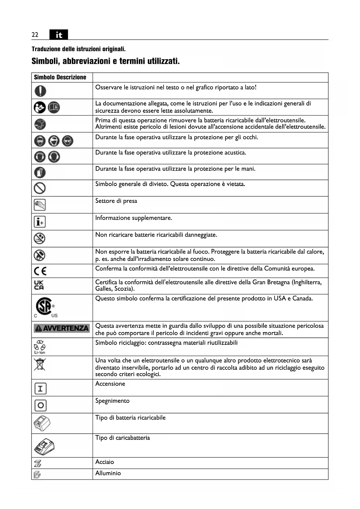 Traduzione delle istruzioni originali. Simboli, abbreviazioni e termini utilizzati. Simbolo Descrizione Osservare le istruzioni nel testo o nel grafico riportato a lato! La documentazione allegata, come le istruzioni per l’uso e le indicazioni generali di sicurezza devono essere lette assolutamente. Prima di questa operazione rimuovere la batteria ricaricabile dall’elettroutensile. Altrimenti esiste pericolo di lesioni dovute all’accensione accidentale dell’elettroutensile. Durante la fase operativa utilizzare la protezione per gli occhi. Durante la fase operativa utilizzare la protezione acustica. Durante la fase operativa utilizzare la protezione per le mani. Simbolo generale di divieto. Questa operazione è vietata. Settore di presa Informazione supplementare. Non ricaricare batterie ricaricabili danneggiate. Non esporre la batteria ricaricabile al fuoco. Proteggere la batteria ricaricabile dal calore, p. es. anche dall’irradiamento solare continuo. Conferma la conformità dell’elettroutensile con le direttive della Comunità europea. Certifica la conformità dell'elettroutensile alle direttive della Gran Bretagna (Inghilterra, Galles, Scozia). Questo simbolo conferma la certificazione del presente prodotto in USA e Canada. Questa avvertenza mette in guardia dallo sviluppo di una possibile situazione pericolosa che può comportare il pericolo di incidenti gravi oppure anche mortali. Simbolo riciclaggio: contrassegna materiali riutilizzabili Una volta che un elettroutensile o un qualunque altro prodotto elettrotecnico sarà diventato inservibile, portarlo ad un centro di raccolta adibito ad un riciclaggio eseguito secondo criteri ecologici. Accensione Spegnimento Tipo di batteria ricaricabile Tipo di caricabatteria Acciaio Alluminio23