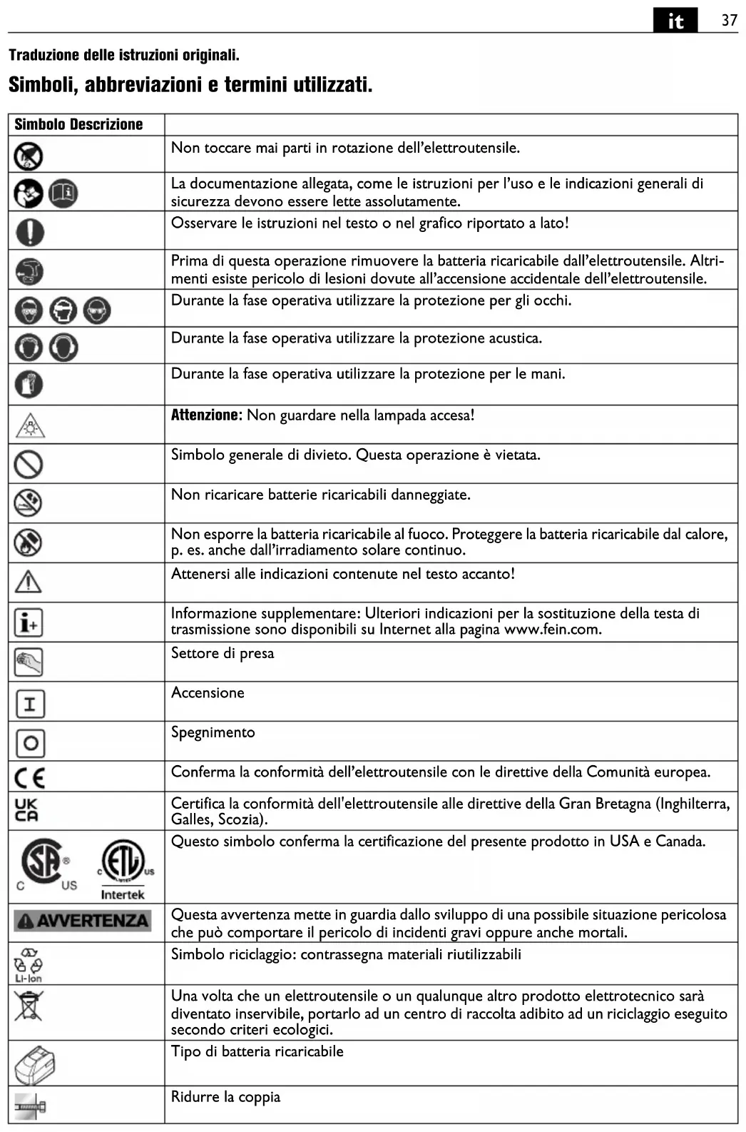 Traduzione delle istruzioni originali. Simboli, abbreviazioni e termini utilizzati. Simbolo Descrizione Non toccare mai parti in rotazione dell’elettroutensile. La documentazione allegata, come le istruzioni per l’uso e le indicazioni generali di sicurezza devono essere lette assolutamente. Osservare le istruzioni nel testo o nel grafico riportato a lato! Prima di questa operazione rimuovere la batteria ricaricabile dall’elettroutensile. Altri- menti esiste pericolo di lesioni dovute all’accensione accidentale dell’elettroutensile. Durante la fase operativa utilizzare la protezione per gli occhi. Durante la fase operativa utilizzare la protezione acustica. Durante la fase operativa utilizzare la protezione per le mani. Attenzione: Non guardare nella lampada accesa! Simbolo generale di divieto. Questa operazione è vietata. Non ricaricare batterie ricaricabili danneggiate. Non esporre la batteria ricaricabile al fuoco. Proteggere la batteria ricaricabile dal calore, p. es. anche dall’irradiamento solare continuo. Attenersi alle indicazioni contenute nel testo accanto! Informazione supplementare: Ulteriori indicazioni per la sostituzione della testa di trasmissione sono disponibili su Internet alla pagina www.fein.com. Settore di presa Accensione Spegnimento Conferma la conformità dell’elettroutensile con le direttive della Comunità europea. Certifica la conformità dell'elettroutensile alle direttive della Gran Bretagna (Inghilterra, Galles, Scozia). Questo simbolo conferma la certificazione del presente prodotto in USA e Canada. Questa avvertenza mette in guardia dallo sviluppo di una possibile situazione pericolosa che può comportare il pericolo di incidenti gravi oppure anche mortali. Simbolo riciclaggio: contrassegna materiali riutilizzabili Una volta che un elettroutensile o un qualunque altro prodotto elettrotecnico sarà diventato inservibile, portarlo ad un centro di raccolta adibito ad un riciclaggio eseguito secondo criteri ecologici. Tipo di batteria ricaricabile Ridurre la coppia38