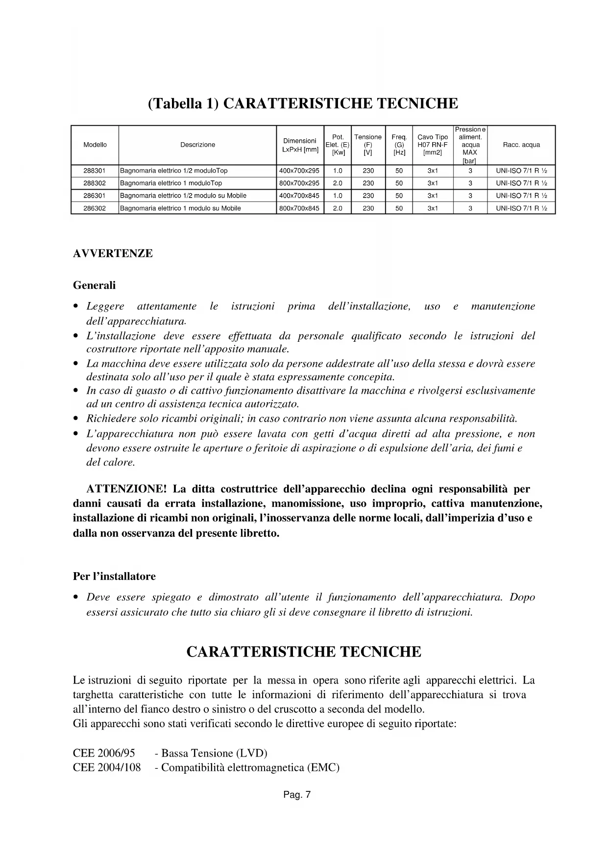 Luogo Si consiglia di installare l’apparecchiatura in un locale ben aerato o sotto una cappa di aspirazione. L’apparecchiatura si può installare singolarmente oppure affiancarla ad altre. Installazione Le operazioni di installazione, la ventilazione e le eventuali manutenzioni devono essere effettuati secondo le istruzioni del costruttore e nel rispetto delle norme in vigore, da parte di personale qualificato, conforme alle disposizioni di seguito riportate: Regolamenti edilizi e disposizioni antincendio locali Norme antinfortunistiche vigenti Le disposizioni CEI vigenti Disposizioni dei VVFFPag. 9 INSTALLAZIONE Operazioni preliminari Togliere l’apparecchiatura dall’imballo, assicurarsi dell’integrità della stessa e, in caso di dubbio, non utilizzarla e rivolgersi a personale professionalmente qualificato. Dopo aver verificato l’integrità si può procedere a togliere la pellicola protettiva di rivestimento. Pulire accuratamente le parti esterne della macchina con acqua tiepida e detersivo utilizzando uno straccio per eliminare tutti i residui rimasti e poi asciugare il tutto con un panno morbido. Se ci fossero ancora tracce residue di collante rimuoverle utilizzando dei solventi adatti (es. acetone). Per nessun motivo utilizzare sostanze abrasive. L’apparecchiatura dopo essere stata posta in opera, dovrà essere livellata utilizzando la regolazione permessa dai piedini. Allacciamento Elettrico Prima di allacciare l’apparecchiatura si deve verificare la corrispondenza tra la tensione di predisposizione della stessa e quella disponibile per l’alimentazione al fine di verificarne l’idoneità. Se non si trova la corrispondenza tra le due si deve variare, se previsto il cambio tensione, il collegamento, come illustrato nello schema elettrico. La morsettiera si trova sul fondo della base, accessibile svitando le viti che fissano la staffa di supporto della morsettiera stessa. Per un più agevole collegamento si consiglia di rimuovere anche il cruscotto. Va verificata inoltre l’efficacia della messa a terra, che il conduttore di terra dal lato allacciamento sia più lungo degli altri conduttori, che il cavo d’allacciamento abbia una sezione adeguata alla potenza assorbita dall’apparecchiatura e che sia almeno di tipo H05 RN-F. Come da disposizioni internazionali, a monte dell’apparecchiatura stessa deve essere installato un dispositivo onnipolare con un’apertura dei contatti di almeno 3 mm, che non deve interrompere il cavo GIALLO- VERDE di terra. Il dispositivo deve essere installato nelle vicinanze dell’apparecchio, deve essere omologato ed avere una portata adatta all’assorbimento dell’apparecchiatura (Vedi caratteristiche tecniche). L’apparecchiatura deve essere collegata al sistema EQUIPOTENZIALE. Il morsetto per il collegamento è situato vicino all’entrata del cavo di alimentazione ed è contraddistinto da un’etichetta con il simbolo riportato in figura 3 (pag. 4). ATTENZIONE! Tutte la parti protette e sigillate dal costruttore non possono essere regolate dall’installatore se non specificatamente indicato. Allacciamento alla rete idrica Collegare la tubazione di entrata dell’acqua alla rete di distribuzione seguendo le disposizioni delle norme vigenti. Per la versione top è necessario effettuare il raccordo direttamente sul rubinetto di carico acqua (fig. 4 - pag. 4 ). Per fare questo si devono togliere le manopole, la leva del rubinetto di scarico ed il cruscotto. Passare il tubo attraverso l’asola (1) posta sul fondo sinistro del bagnomaria e effettuare il collegamento alla valvola di carico acqua (2). Si consiglia di utilizzare un tubo flessibile che per normativa deve resistere a una temperatura di almeno 90 °C.Pag. 10
