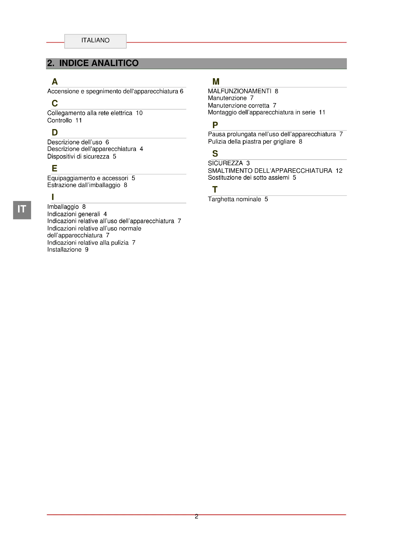 6.2. Manutenzione corretta La manutenzione corretta comprende la pulizia quotidiana di tutti i pezzi che entrano a contatto con i prodotti alimentari, nonché la manutenzione regolare delle condotte di scarico. La manutenzione accurata garantisce il miglior rendimento, una periodo di vita prolungato dell’apparecchiatura, il corretto funzionamento dei dispositivi di sicurezza. Non indirizzare getti d’acqua diretti sull'apparec- chiatura e non usare idro pulitrici. Per la pulizia dell’acciaio inossidabile, non usare lana di acciaio né spazzole con denti in acciaio, poiché possono lasciare molecole di ferro sull’apparecchiatura. Queste ultime, in seguito all’ossidazione, possono provocare la comparsa di ruggine. Per eliminare i residui secchi, usare una spatola in legno, una spatola in plastica o una spugna morbida. In caso di pause prolungate nell’utilizzo dell’apparecchiatura, applicare uno strato di olio di vaselina su tutte le superfici in acciaio inossidabile. Non usare detergenti contenenti sostanze pericolose o dannose per la salute (solventi, benzina ecc.). Al termine della giornata di lavoro pulire: piastra per grigliare apparecchiatura Ordinare regolarmente a dipendenti specializzati l’esecuzione dei seguenti lavori di manutenzione: Controllo del funzionamento dell’impianto elettrico; Controllo del funzionamento dei termostati di sicurezza.8 ITALIANO