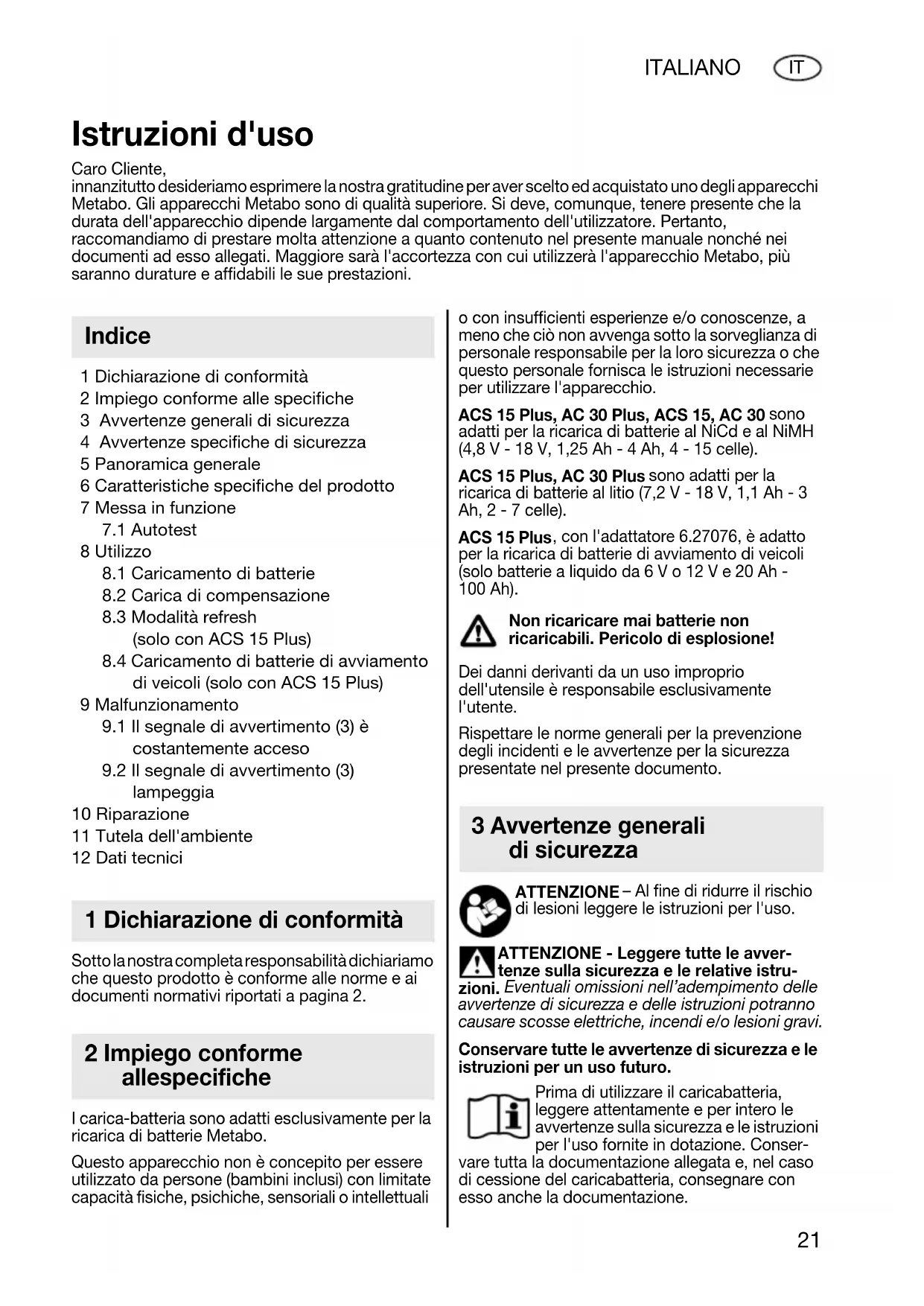 lampeggia 10 Riparazione 11 Tutela dell'ambiente 12 Dati tecnici Sotto la nostra completa responsabilità dichiariamo che questo prodotto è conforme alle norme e ai documenti normativi riportati a pagina 2. I carica-batteria sono adatti esclusivamente per la ricarica di batterie Metabo. Questo apparecchio non è concepito per essere utilizzato da persone (bambini inclusi) con limitate capacità fisiche, psichiche, sensoriali o intellettuali o con insufficienti esperienze e/o conoscenze, a meno che ciò non avvenga sotto la sorveglianza di personale responsabile per la loro sicurezza o che questo personale fornisca le istruzioni necessarie per utilizzare l'apparecchio. ACS 15 Plus, AC 30 Plus, ACS 15, AC 30 sono adatti per la ricarica di batterie al NiCd e al NiMH (4,8 V - 18 V, 1,25 Ah - 4 Ah, 4 - 15 celle). ACS 15 Plus, AC 30 Plus sono adatti per la ricarica di batterie al litio (7,2 V - 18 V, 1,1 Ah - 3 Ah, 2 - 7 celle). ACS 15 Plus , con l'adattatore 6.27076, è adatto per la ricarica di batterie di avviamento di veicoli (solo batterie a liquido da 6 V o 12 V e 20 Ah - 100 Ah). Non ricaricare mai batterie non ricaricabili. Pericolo di esplosione! Dei danni derivanti da un uso improprio dell'utensile è responsabile esclusivamente l'utente. Rispettare le norme generali per la prevenzione degli incidenti e le avvertenze per la sicurezza presentate nel presente documento. ATTENZIONE – Al fine di ridurre il rischio di lesioni leggere le istruzioni per l'uso. ATTENZIONE - Leggere tutte le avver- tenze sulla sicurezza e le relative istru- zioni. Eventuali omissioni nell’adempimento delle avvertenze di sicurezza e delle istruzioni potranno causare scosse elettriche, incendi e/o lesioni gravi. Conservare tutte le avvertenze di sicurezza e le istruzioni per un uso futuro. Prima di utilizzare il caricabatteria, leggere attentamente e per intero le avvertenze sulla sicurezza e le istruzioni per l'uso fornite in dotazione. Conser- vare tutta la documentazione allegata e, nel caso di cessione del caricabatteria, consegnare con esso anche la documentazione. Istruzioni d'uso Caro Cliente, innanzitutto desideriamo esprimere la nostra gratitudine per aver scelto ed acquistato uno degli apparecchi Metabo. Gli apparecchi Metabo sono di qualità superiore. Si deve, comunque, tenere presente che la durata dell'apparecchio dipende largamente dal comportamento dell'utilizzatore. Pertanto, raccomandiamo di prestare molta attenzione a quanto contenuto nel presente manuale nonché nei documenti ad esso allegati. Maggiore sarà l'accortezza con cui utilizzerà l'apparecchio Metabo, più saranno durature e affidabili le sue prestazioni. Indice 1 Dichiarazione di conformità 2 Impiego conforme allespecifiche 3 Avvertenze generali di sicurezza 17024963_0309 ACS 15 AC 30.book Seite 21 Mittwoch, 4. März 2009 4:29 1622 ITALIANO