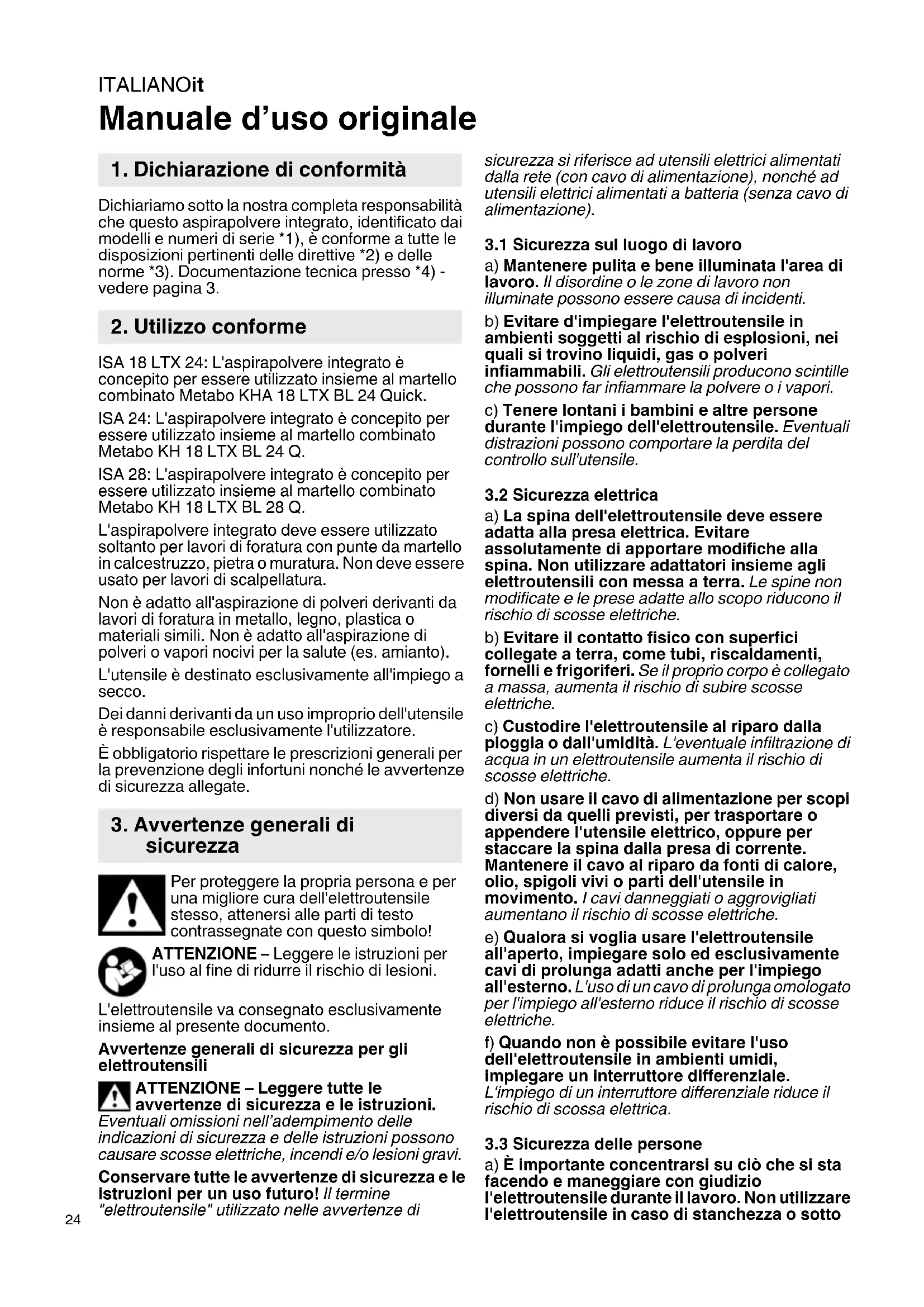 Manuale d’uso originale Dichiariamo sotto la nostra completa responsabilità che questo aspirapolvere integrato, identificato dai modelli e numeri di serie *1), è conforme a tutte le disposizioni pertinenti delle direttive *2) e delle norme *3). Documentazione tecnica presso *4) - vedere pagina 3. ISA 18 LTX 24: L'aspirapolvere integrato è concepito per essere utilizzato insieme al martello combinato Metabo KHA 18 LTX BL 24 Quick. ISA 24: L'aspirapolvere integrato è concepito per essere utilizzato insieme al martello combinato Metabo KH 18 LTX BL 24 Q. ISA 28: L'aspirapolvere integrato è concepito per essere utilizzato insieme al martello combinato Metabo KH 18 LTX BL 28 Q. L'aspirapolvere integrato deve essere utilizzato soltanto per lavori di foratura con punte da martello in calcestruzzo, pietra o muratura. Non deve essere usato per lavori di scalpellatura. Non è adatto all'aspirazione di polveri derivanti da lavori di foratura in metallo, legno, plastica o materiali simili. Non è adatto all'aspirazione di polveri o vapori nocivi per la salute (es. amianto). L'utensile è destinato esclusivamente all'impiego a secco. Dei danni derivanti da un uso improprio dell'utensile è responsabile esclusivamente l'utilizzatore. È obbligatorio rispettare le prescrizioni generali per la prevenzione degli infortuni nonché le avvertenze di sicurezza allegate. Per proteggere la propria persona e per una migliore cura dell'elettroutensile stesso, attenersi alle parti di testo contrassegnate con questo simbolo! ATTENZIONE – Leggere le istruzioni per l'uso al fine di ridurre il rischio di lesioni. L'elettroutensile va consegnato esclusivamente insieme al presente documento. Avvertenze generali di sicurezza per gli elettroutensili ATTENZIONE – Leggere tutte le avvertenze di sicurezza e le istruzioni. Eventuali omissioni nell’adempimento delle indicazioni di sicurezza e delle istruzioni possono causare scosse elettriche, incendi e/o lesioni gravi. Conservare tutte le avvertenze di sicurezza e le istruzioni per un uso futuro! Il termine "elettroutensile" utilizzato nelle avvertenze di sicurezza si riferisce ad utensili elettrici alimentati dalla rete (con cavo di alimentazione), nonché ad utensili elettrici alimentati a batteria (senza cavo di alimentazione).