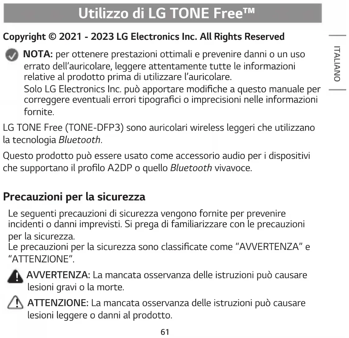Copyright © 2021 - 2023 LG Electronics Inc. All Rights Reserved NOTA: per ottenere prestazioni ottimali e prevenire danni o un uso errato dell’auricolare, leggere attentamente tutte le informazioni relative al prodotto prima di utilizzare l’auricolare. Solo LG Electronics Inc. può apportare modiche a questo manuale per correggere eventuali errori tipograci o imprecisioni nelle informazioni fornite. LG TONE Free (TONE-DFP3) sono auricolari wireless leggeri che utilizzano la tecnologia Bluetooth. Questo prodotto può essere usato come accessorio audio per i dispositivi che supportano il prolo A2DP o quello Bluetooth vivavoce. Precauzioni per la sicurezza Le seguenti precauzioni di sicurezza vengono fornite per prevenire incidenti o danni imprevisti. Si prega di familiarizzare con le precauzioni per la sicurezza. Le precauzioni per la sicurezza sono classicate come “AVVERTENZA” e “ATTENZIONE”.
