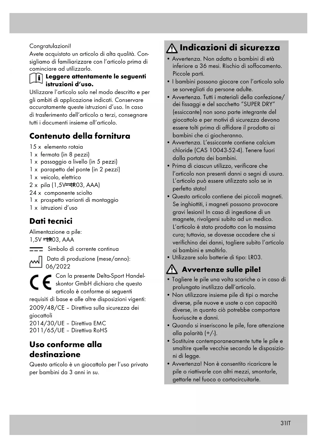 Simbolo di corrente continua Data di produzione (mese/anno): 06/2022 Con la presente Delta-Sport Handel- skontor GmbH dichiara che questo articolo è conforme ai seguenti requisiti di base e alle altre disposizioni vigenti: 2009/48/CE – Direttiva sulla sicurezza dei giocattoli 2014/30/UE – Direttiva EMC 2011/65/UE – Direttiva RoHS Uso conforme alla destinazione Questo articolo è un giocattolo per l’uso privato per bambini da 3 anni in su. Indicazioni di sicurezza