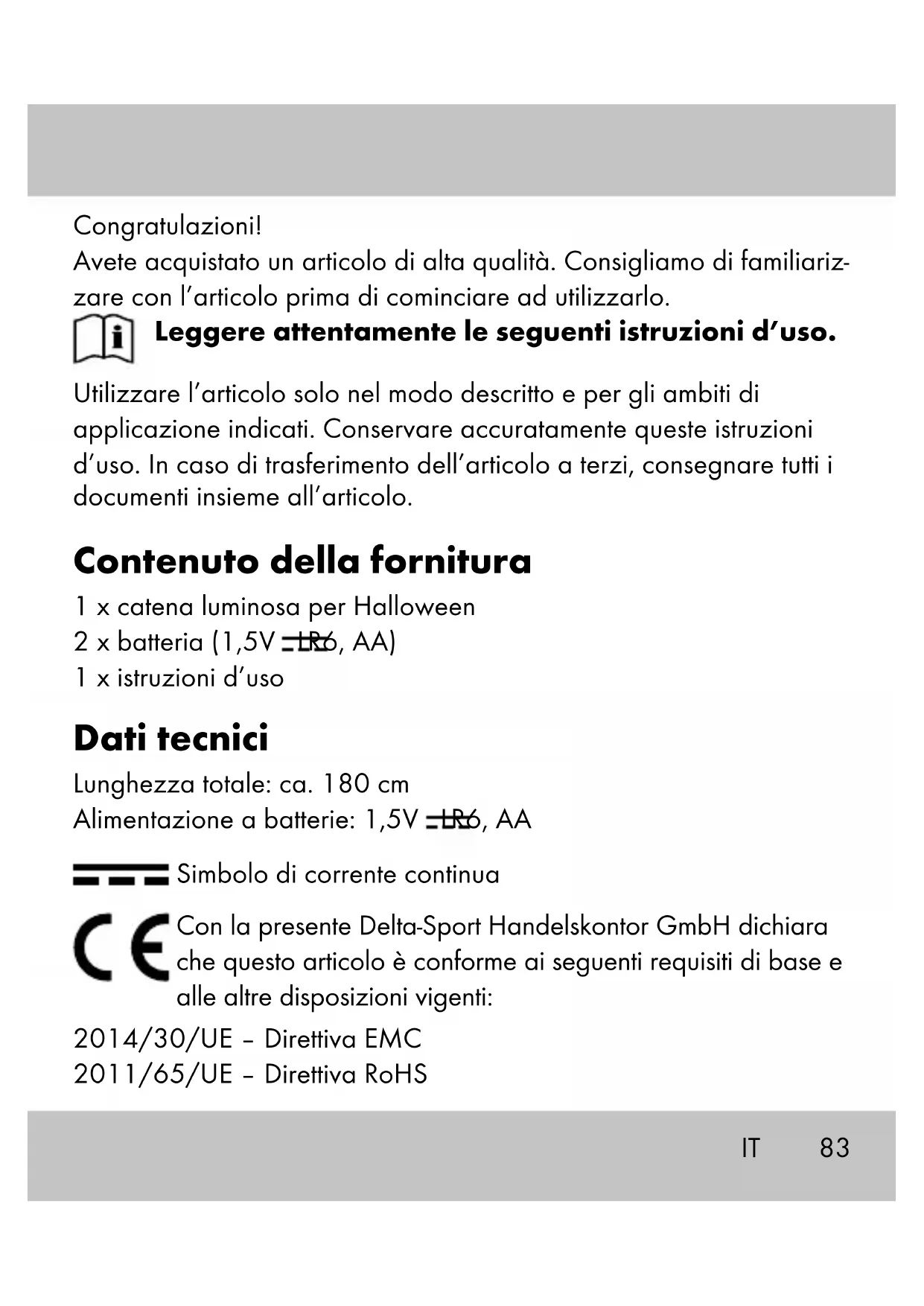 - Non cortocircuitare i morsetti. Inserire/sostituire le batterie (imm. A) AVVERTENZA! Osservare le seguenti indicazioni per evitare danni meccanici ed elettrici. Per inserire e sostituire le batterie (2), procedere come mostrato nell’imm. A. Indicazione: Fare attenzione alla polarità più/meno delle batterie e ad inserirle correttamente. Le batterie devono essere inserite com- pletamente nel sostegno. Accensione e spegnimento della luce (fig. B) Usare l’interruttore (1a) per accendere (ON) e spegnere l’articolo (OFF). Spostare l’interruttore (1a) su TIMER per attivare la funzione timer dell’articolo. Nota: con la funzione timer, la luce si accende per sei ore e rimane spenta per 18 ore. Il ritmo si ripete quotidianamente. IT88 Uso L’articolo può essere appeso in interni. Conservazione, pulizia In caso di mancato utilizzo, riporre l’articolo a temperatura ambiente senza batterie in un luogo asciutto e pulito. Pulire solo con un panno umido e quindi asciugare. IMPORTANTE! Non utilizzare mai detergenti aggressivi. Smaltimento Il simbolo accanto indica che questa apparecchiatura è soggetta alla Direttiva 2012/19/UE. Questa direttiva prevede che alla fine del suo periodo di impiego non sia consentito smaltire questa apparecchiatura insieme ai normali rifiuti domestici, bensì presso centri di raccolta appositamen- te allestiti, presso strutture di riciclaggio dei materiali oppure presso aziende di smaltimento. Rispettate l’ambiente e smaltite i rifiuti correttamente. Le batterie non devono essere smaltite come rifiuti domestici. Possono contenere metalli pesanti tossici e sono soggetti a un trattamento speciale dei rifiuti. I simboli chimici dei metalli pesanti sono i seguen- ti: Cd = cadmio, Hg = mercurio, Pb = piombo. Pertanto, restituire le batterie usate in un punto di raccolta comunale. IT89 Presso la propria amministrazione comunale o cittadina è possibile ottenere ulteriori informazioni sullo smaltimento dell’apparecchiatura usata. Smaltire l’apparecchiatura e la confezione nel rispetto dell’ambiente. Conservare i materiali della confezione (come ad es. i sacchetti) in modo che non siano raggiungibili per i bambini. Si noti la marcatura dei materiali di imballaggio durante la separazione dei rifiuti, questi sono contrassegnati da abbreviazioni (a) e numeri (b) con il seguente significato: 1-7: materiali plastici / 20-22: carta e cartone / 80-98: materiali compositi. L’articolo e i materiali di imballaggio sono riciclabili, smaltirli separa- tamente per una migliore gestione dei rifiuti. Il logo Triman è valido solo per la Francia. Avvertenze sulla garanzia e sulla gestione dei servizi di assistenza L’articolo è stato prodotto con la massima cura e sotto un continuo controllo. DELTA-SPORT HANDELSKONTOR GmbH concede ai clienti finali privati, su questo articolo, tre anni di garanzia dalla data di acquisto (termine di garanzia) sulla base delle seguenti disposizio- ni. La garanzia vale solo per i vizi di materiale e di lavorazione. IT90 La garanzia non si estende alle parti soggette ad un normale degra- damento e che siano quindi da considerarsi come pezzi soggetti ad usura (ad es. le batterie) né ai pezzi fragili come ad es. interruttori, batterie ricaricabili oppure pezzi in vetro. Dalla presente garanzia sono escluse le richieste legate a casi di utilizzo non conforme oppu- re di abuso dell’articolo, oppure di utilizzo avvenuto non nell’ambito delle condizioni previste oppure del campo di impiego previsto, oppure in caso di non osservanza delle direttive riportate nelle istru- zioni d’uso, a meno che il cliente non dimostri che sussista un vizio di materiale o di lavorazione che non sia riconducibile ad una delle circostanze riportate sopra. Le richieste di garanzia possono essere avanzate solo entro il relativo termine, su presentazione dello scon- trino originale di acquisto. Si prega quindi di conservare lo scontrino originale. Il termine di garanzia non sarà prolungato a seguito di eventuali riparazioni effettuate sulla base della garanzia, della ga- ranzia obbligatoria prevista per legge oppure di accondiscendenza. Ciò vale anche per le parti sostituite oppure riparate. In caso di contestazione rivolgersi dapprima alla hotline di assi- stenza sotto indicata oppure mettersi in contatto con noi via e-mail. Laddove sussista un caso coperto dalla garanzia, l’articolo sarà – a nostra discrezione – da noi riparato gratuitamente, sostituito oppure sarà rimborsato il prezzo di acquisto. Non sussistono ulteriori diritti derivanti dalla garanzia. IT91 I vostri diritti giuridici, in particolare i diritti di garanzia obbligatoria prevista dalla legge nei confronti del relativo venditore, non sono limitati dalla presente garanzia. IAN: 390888_2201 Assistenza Italia Tel.: 800781188 E-Mail: deltasport@lidl.it IT92 Szívből gratulálunk! Vásárlásával kiváló minőségű terméket választott. Használatba vétele előtt ismerkedjen meg a termékkel. Figyelmesen olvassa el az alábbi használati útmutatót. A terméket kizárólag az itt ismertetett módon, a rendeltetésének megfe- lelően használja. Gondosan őrizze meg a használati útmutatót. A ter- mék továbbadásakor adja át az összes kapcsolódó dokumentumot is. Csomag tartalma 1 x halloween fényfüzér 2 x elem (1,5V LR6, AA) 1 x használati útmutató Műszaki adatok Teljes hossz: kb. 180 cm Elemes energiaellátás: 1,5V LR6, AA Egyenfeszültség jele A Delta-Sport Handelskontor GmbH kijelenti, hogy a termék megfelel az alábbi általános követelményeknek és az egyéb vonatkozó rendelkezéseknek: 2014/30/EU – Elektromagneses osszeferhetősegi Iranyelv 2011/65/EU – ROHS irányelv HU93HU Rendeltetésszerű használat A terméket beltéri, privát használatra terveztük, az céges, kereske- delmi célú használatra nem alkalmas. A termék dekorációs célokra alkalmas. KIZÁRÓLAG BELTÉREN HASZNÁLJA. Nem alkalmas általános háztartási helyiségvilágításra