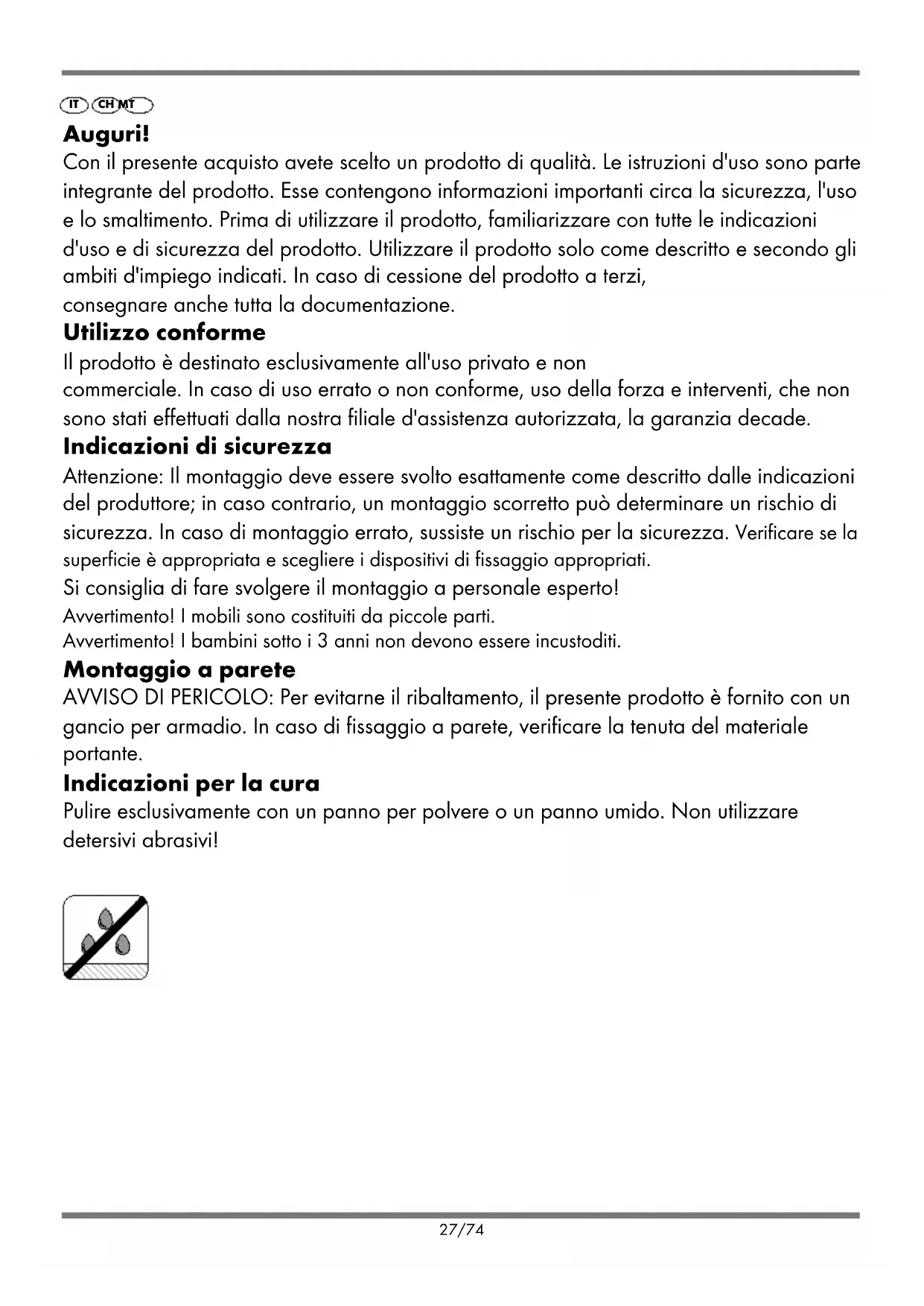 26/74IT Auguri! Con il presente acquisto avete scelto un prodotto di qualità. Le istruzioni d'uso sono parte integrante del prodotto. Esse contengono informazioni importanti circa la sicurezza, l'uso e lo smaltimento. Prima di utilizzare il prodotto, familiarizzare con tutte le indicazioni d'uso e di sicurezza del prodotto. Utilizzare il prodotto solo come descritto e secondo gli ambiti d'impiego indicati. In caso di cessione del prodotto a terzi, consegnare anche tutta la documentazione. Utilizzo conforme Il prodotto è destinato esclusivamente all'uso privato e non commerciale. In caso di uso errato o non conforme, uso della forza e interventi, che non sono stati effettuati dalla nostra filiale d'assistenza autorizzata, la garanzia decade. Indicazioni di sicurezza Attenzione: Il montaggio deve essere svolto esattamente come descritto dalle indicazioni del produttore; in caso contrario, un montaggio scorretto può determinare un rischio di sicurezza. In caso di montaggio errato, sussiste un rischio per la sicurezza. Verificare se la superficie è appropriata e scegliere i dispositivi di fissaggio appropriati. Si consiglia di fare svolgere il montaggio a personale esperto! Avvertimento! I mobili sono costituiti da piccole parti. Avvertimento! I bambini sotto i 3 anni non devono essere incustoditi. Montaggio a parete AVVISO DI PERICOLO: Per evitarne il ribaltamento, il presente prodotto è fornito con un gancio per armadio. In caso di fissaggio a parete, verificare la tenuta del materiale portante. Indicazioni per la cura Pulire esclusivamente con un panno per polvere o un panno umido. Non utilizzare detersivi abrasivi! CH MT 27/74IT Periodo di garanzia e richieste legali di garanzia Il periodo di garanzia non viene prolungato dalle prestazioni in garanzia. Lo stesso si applica a parti sostituite o riparate. I danni o difetti presenti già all'acquisto devono essere comunicati immediatamente dopo l'apertura dell'imballaggio. I costi delle riparazioni svolte dopo la decorrenza del periodo garanzia sono a carico del consumatore. Livello di garanzia Il prodotto è stato accuratamente realizzato secondo rigidi criteri di qualità e coscienziosamente testato prima della consegna. Le prestazioni di garanzia coprono gli errori di materiale e di fabbricazione. La garanzia non copre le parti di prodotto soggette ad usura normale, che, pertanto, sono considerate pezzi soggetti ad usura, o il danneggiamento di parti delicate, come interruttori o parti di vetro. La garanzia decade in caso di danneggiamento del prodotto, uso non conforme o mancata manutenzione. Per un uso conforme è necessario rispettare con attenzione tutte le indicazioni contenute nel manuale d'uso. Gli scopi d'impiego e gli usi, che vengono sconsigliati o da cui si viene ammoniti nelle istruzioni per l'uso, devono essere evitati a tutti i costi. Garanzia Gentili clienti, Il prodotto da voi acquistato è coperto da una garanzia triennale a decorrere dalla data d'acquisto. In caso di difetti di questo prodotto, vi sono garantiti dei diritti legali nei confronti del venditore del prodotto. Questi diritti legali non vengono limitati dalla nostra garanzia descritta al seguito. Condizioni di garanzia Il periodo di garanzia decorre dalla data d'acquisto. Si prega di conservare con cautela lo scontrino originale. Quest'ultimo è necessario per attestare l'acquisto. Se un difetto di materiale o di fabbricazione si verifica entro tre anni dalla data di acquisto di questo prodotto, a nostra discrezione, ripareremo o sostituiremo il prodotto senza alcun costo per voi, o vi rimborseremo il prezzo di acquisto. Al fine di potere usufruire delle prestazioni di garanzia entro il periodo dei tre anni, è necessario che il prodotto difettoso e lo scontrino fiscale vengano consegnati, unitamente a una breve descrizione in cui si indica il difetto e il momento in cui si è presentato. Se il difetto è coperto dalla nostra garanzia, provvederemo a restituirvi il prodotto riparato o un nuovo prodotto. La riparazione o la sostituzione del prodotto non determina la decorrenza di un nuovo periodo di garanzia. La prestazione in garanzia vale per difetti del materiale o di fabbricazione. Questa garanzia non si estende a componenti del prodotto esposti a normale CH MT 28/74logorio, che possono pertanto essere considerati come componenti soggetti a usura (esempio capacità della batteria, calcificazione, lampade, pneumatici, filtri, spazzole…). La garanzia non si estende altresì a danni che si verificano su componenti delicati (esempio interruttori, batterie, parti realizzate in vetro, schermi, accessori vari) nonché danni derivanti dal trasporto o altri incidenti. Smaltimento Al termine del loro utilizzo, il prodotto e l'imballaggio devono essere smaltiti secondo le norme ambientali. 29/74