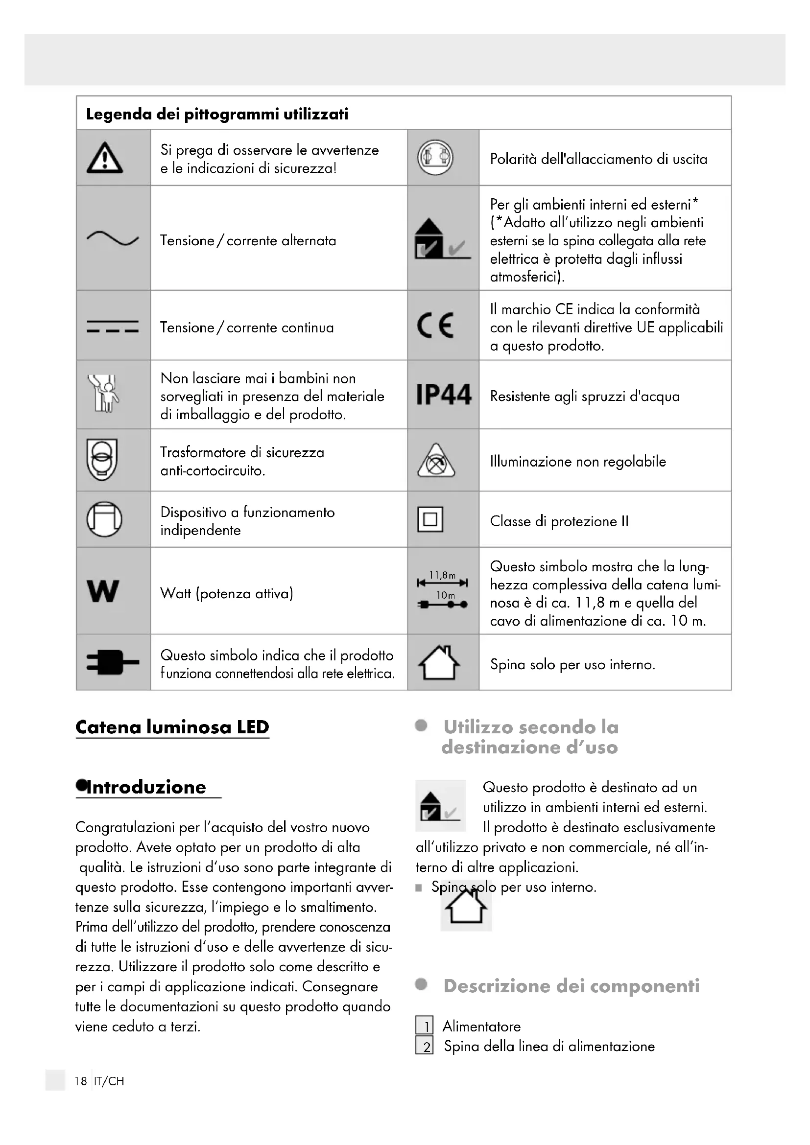 unziona connettendosi alla rete elett rica. Spina solo per uso interno. Catena luminosa LED Introduzione Congratulazioni per l‘acquisto del vostro nuovo prodotto. Avete optato per un prodotto di alta qualità. Le istruzioni d‘uso sono parte integrante di questo prodotto. Esse contengono importanti avver- tenze sulla sicurezza, l‘impiego e lo smaltimento. Prima dell‘utilizzo del prodotto, prendere conoscenza di tutte le istruzioni d‘uso e delle avvertenze di sicu- rezza. Utilizzare il prodotto solo come descritto e per i campi di applicazione indicati. Consegnare tutte le documentazioni su questo prodotto quando viene ceduto a terzi. Utilizzo secondo la destinazione d’uso Questo prodotto è destinato ad un utilizzo in ambienti interni ed esterni. Il prodotto è destinato esclusivamente all‘utilizzo privato e non commerciale, né all‘in- terno di altre applicazioni. Spina solo per uso interno. Descrizione dei componenti