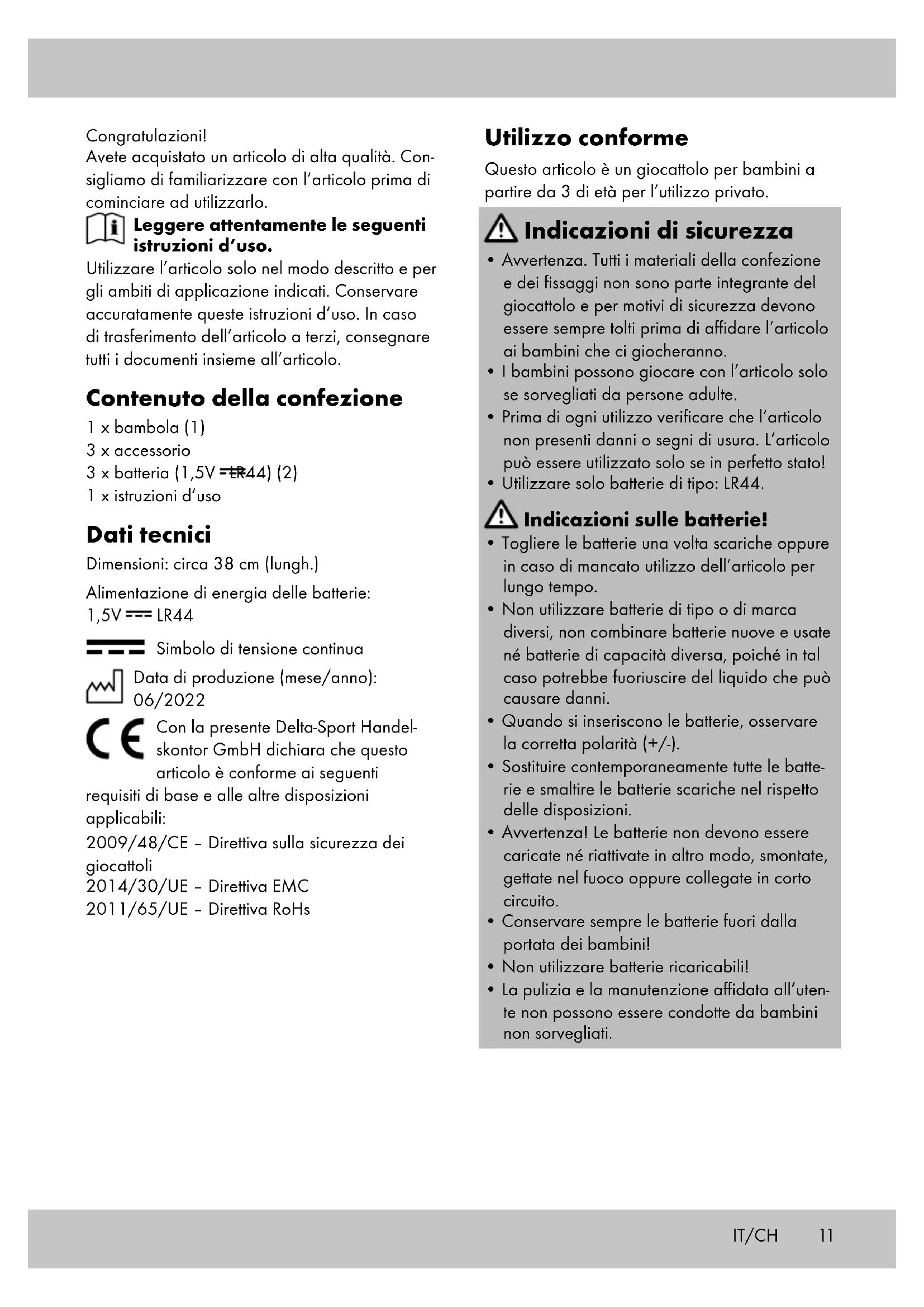 nell’imm. C. Indicazione: È necessario un adeguato cac- ciavite (non fornito in dotazione). Indicazione: Fare attenzione alla polarità più/ meno delle batterie e ad inserirle correttamente. Le batterie devono essere inserite completamen- te nel sostegno. Conservazione, pulizia In caso di mancato utilizzo, riporre l’articolo a temperatura ambiente senza batterie in un luogo asciutto e pulito. Pulire solo con un panno umido e quindi asciu- gare. IMPORTANTE! Non utilizzare mai detergenti aggressivi. Tutina, berretto: Lavaggio per delicati a 30 °C Smaltimento Una volta che l’articolo diventa inutilizzabile, non gettarlo nei rifiuti domestici, ma smaltirlo correttamente nel pieno rispetto dell’ambiente. È possibile ottenere informazioni sui punti di raccolta e sui loro orari di apertura presso l’ufficio amministra- tivo competente. Le batterie difettose o usate devono essere rici- clate in conformità alla direttiva 2006/66/CE e successive modifiche. IT/CH13IT/CH Restituire le batterie e/o l’articolo attraverso i centri di raccolta offerti. I materiali di imballag- gio, ad es. i sacchetti, non devono giungere nelle mani dei bambini. Tenere il materiale di imballaggio fuori dalla portata dei bambini. Danni ambientali dovuti a un errato smaltimento delle batterie! Le batterie non devono essere smaltite come rifiuti domestici. Possono contenere metalli pesanti tossici e sono soggetti a un trattamento speciale dei rifiuti. I simboli chimici dei metalli pesanti sono i seguenti: Cd = cadmio, Hg = mercurio, Pb = piombo. Pertanto, restituire le batterie usate in un punto di raccolta comunale. Smaltire l’articolo e il materiale di imballaggio nel pieno rispetto dell’am- biente. Si noti la marcatura dei materiali di imballaggio durante la separazione dei rifiuti, questi sono contrassegnati da abbreviazioni (a) e numeri (b) con il seguente significato: 1-7: materiali plastici/20-22: carta e cartone/80-98: materiali compositi. L’articolo e i materiali di imballaggio sono rici- clabili, smaltirli separatamente per una migliore gestione dei rifiuti. Il logo Triman è valido solo per la Francia. Per informazioni su come smaltire l’articolo non più utilizzabile, rivolgersi alle autorità locali o comunali. Avvertenze sulla garanzia e sulla gestione dei servizi di assistenza L’articolo è stato prodotto con la massima cura e sotto un continuo controllo. DELTA-SPORT HAN- DELSKONTOR GmbH concede ai clienti finali privati, su questo articolo, tre anni di garanzia dalla data di acquisto (termine di garanzia) sul- la base delle seguenti disposizioni. La garanzia vale solo per i vizi di materiale e di lavorazione. La garanzia non si estende alle parti soggette ad un normale degradamento e che siano quindi da considerarsi come pezzi soggetti ad usura (ad es. le batterie) né ai pezzi fragili come ad es. interruttori, batterie ricaricabili oppure pezzi in vetro. Dalla presente garanzia sono escluse le richieste legate a casi di utilizzo non conforme oppure di abuso dell’articolo, oppure di utilizzo avvenuto non nell’ambito delle condizioni previste oppure del campo di impiego previsto, oppure in caso di non osservanza delle direttive riportate nelle istruzioni d’uso, a meno che il cliente non dimostri che sussista un vizio di materiale o di lavorazione che non sia riconducibile ad una delle circostanze riportate sopra. Le richieste di garanzia possono essere avanza- te solo entro il relativo termine, su presentazione dello scontrino originale di acquisto. Si prega quindi di conservare lo scontrino originale. Il ter- mine di garanzia non sarà prolungato a seguito di eventuali riparazioni effettuate sulla base della garanzia, della garanzia obbligatoria prevista per legge oppure di accondiscendenza. Ciò vale anche per le parti sostituite oppure riparate. In caso di contestazione rivolgersi dapprima alla hotline di assistenza sotto indicata oppure mettersi in contatto con noi via e-mail. Laddove sussista un caso coperto dalla garanzia, l’artico- lo sarà – a nostra discrezione – da noi riparato gratuitamente, sostituito oppure sarà rimborsato il prezzo di acquisto. Non sussistono ulteriori diritti derivanti dalla garanzia. I vostri diritti giuridici, in particolare i diritti di garanzia obbligatoria prevista dalla legge nei confronti del relativo venditore, non sono limitati dalla presente garanzia. IAN: 403702_2201 Assistenza Svizzera Tel.: 0800 56 44 33 E-Mail: deltasport@lidl.ch14 Congratulations! You have chosen to purchase a high-quality product. Familiarise yourself with the product before using it for the first time. Read the following instructions for use carefully. Use the product only as described and only for the given areas of application. Store these instructions for use carefully. When passing the product on to third parties, please also hand over all accompanying documents. Scope of delivery 1 x doll (1) 3 x accessory 3 x battery (1.5V LR44) (2) 1 x instructions for use Technical data Dimensions: approx. 38cm (l) Battery power supply: 1.5V LR44 Symbol for DC voltage Date of manufacture (month/year): 06/2022 Delta-Sport Handelskontor GmbH hereby declares that this product conforms to the following basic requirements and other applicable regulations: 2009/48/EC – Toy Safety Directive 2014/30/EU – EMC Directive 2011/65/EU – RoHS Directive UK Conformity Assessed Delta-Sport Handelskontor GmbH hereby declares that this product meets the following basic requirements, as well as other important regulations: Toys (Safety) Regulations 2011 Electromagnetic Compatibility Regulations 2016 The Restriction of the Use of Certain Hazardous Substances in Electrical and Electronic Equip- ment Regulations 2012 Intended use This product is intended for private use as a toy for children over the age of 3. Safety instructions