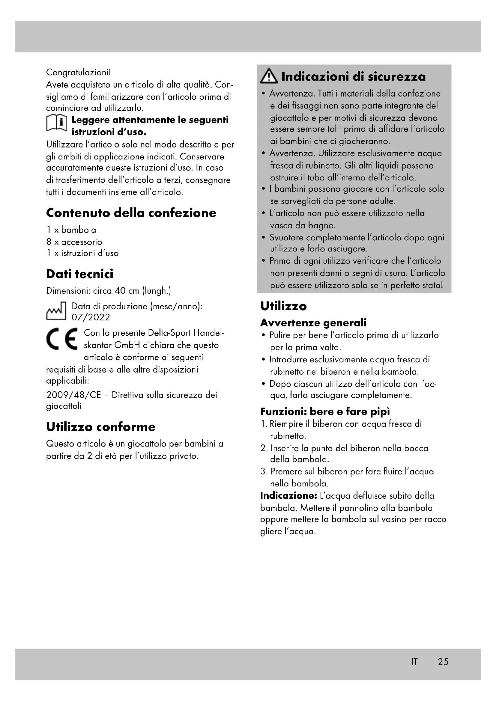 nella bambola. Indicazione: L’acqua defluisce subito dalla bambola. Mettere il pannolino alla bambola oppure mettere la bambola sul vasino per racco- gliere l’acqua. IT26 IT Conservazione, pulizia In caso di mancato utilizzo, riporre l’articolo a temperatura ambiente in un luogo asciutto e pulito. Pulire solo con un panno umido e quindi asciu- gare. Svuotare l’articolo dopo ciascun utilizzo e farlo asciugare completamente per evitare la formazione di muffa. Lavare la bambola e il biberon ogni due settima- ne circa con acqua e detersivo per stoviglie. Dopo il lavaggio, sciacquare perlomeno due volte con acqua di rubinetto per garantire che non rimangano residui di detersivo nella bambo- la o nel biberon. IMPORTANTE! Non utilizzare mai detergenti aggressivi. Body, berretto e pannolino: Lavaggio per delica- ti a 30 °C Smaltimento Smaltire l‘articolo e i materiali dell‘imballaggio in conformità con le direttive locali in vigore. I materiali di imballaggio, come ad esempio le pellicole, non devono essere alla portata dei bambini. Conservare i materiali di imballaggio in un luogo non raggiungibile per i bambini. Smaltire i prodotti e gli imballaggi in modo ecologico. Il codice di riciclaggio ha lo scopo di contrassegnare i diversi materiali al fine di introdurli nel ciclo di riutilizzo (recycling). Il codice è composto dal simbolo del riciclo, che dovrebbe rappresentare il ciclo del riutilizzo, e un numero che indica di che materiale si tratta. Avvertenze sulla garanzia e sulla gestione dei servizi di assistenza L’articolo è stato prodotto con la massima cura e sotto un continuo controllo. DELTA-SPORT HAN- DELSKONTOR GmbH concede ai clienti finali privati, su questo articolo, tre anni di garanzia dalla data di acquisto (termine di garanzia) sul- la base delle seguenti disposizioni. La garanzia vale solo per i vizi di materiale e di lavorazione. La garanzia non si estende alle parti soggette ad un normale degradamento e che siano quindi da considerarsi come pezzi soggetti ad usura (ad es. le batterie) né ai pezzi fragili come ad es. interruttori, batterie ricaricabili oppure pezzi in vetro. Dalla presente garanzia sono escluse le richieste legate a casi di utilizzo non conforme oppure di abuso dell’articolo, oppure di utilizzo avvenuto non nell’ambito delle condizioni previste oppure del campo di impiego previsto, oppure in caso di non osservanza delle direttive riportate nelle istruzioni d’uso, a meno che il cliente non dimostri che sussista un vizio di materiale o di lavorazione che non sia riconducibile ad una delle circostanze riportate sopra. Le richieste di garanzia possono essere avanza- te solo entro il relativo termine, su presentazione dello scontrino originale di acquisto. Si prega quindi di conservare lo scontrino originale. Il ter- mine di garanzia non sarà prolungato a seguito di eventuali riparazioni effettuate sulla base della garanzia, della garanzia obbligatoria prevista per legge oppure di accondiscendenza. Ciò vale anche per le parti sostituite oppure riparate.27IT In caso di contestazione rivolgersi dapprima alla hotline di assistenza sotto indicata oppure mettersi in contatto con noi via e-mail. Laddove sussista un caso coperto dalla garanzia, l’artico- lo sarà – a nostra discrezione – da noi riparato gratuitamente, sostituito oppure sarà rimborsato il prezzo di acquisto. Non sussistono ulteriori diritti derivanti dalla garanzia. I vostri diritti giuridici, in particolare i diritti di garanzia obbligatoria prevista dalla legge nei confronti del relativo venditore, non sono limitati dalla presente garanzia. IAN: 403705_2201 Assistenza Italia Tel.: 800781188 E-Mail: deltasport@lidl.it28 Szívből gratulálunk! Vásárlásával kiváló minőségű terméket válasz- tott. Használatba vétele előtt ismerkedjen meg a termékkel. Figyelmesen olvassa el az alábbi használati útmutatót. A terméket kizárólag az itt ismertetett módon, a rendeltetésének megfelelően használja. Gondo- san őrizze meg a használati útmutatót. A termék továbbadásakor adja át az összes kapcsolódó dokumentumot is. A csomag tartalma 1 x baba 8 x tartozék 1 x használati útmutató Műszaki adatok Méretek: kb. 40 cm (ho) Gyártás dátuma (hónap/év): 07/2022 A Delta-Sport Handelskontor GmbH ezennel kijelenti, hogy ez a termék megfelel a következő alapvető követelményeknek és egyéb, vonatkozó rendelkezéseknek: 2009/48/EK – játékokra vonatkozó irányelv Rendeltetésszerű használat 2 éven felüli gyermekeknek ajánlott játék szemé- lyes használatra. Biztonsági utasítások