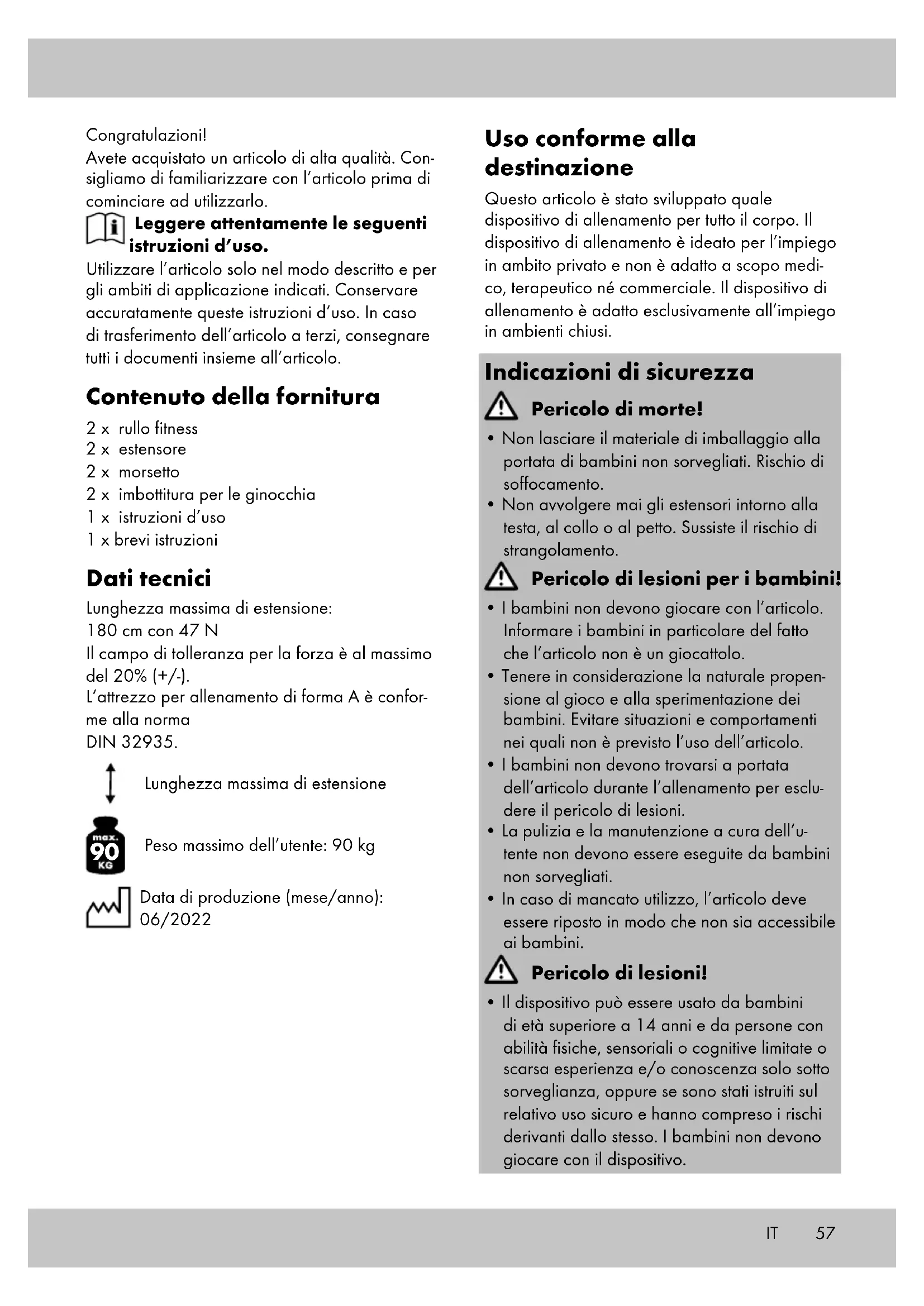 Peso massimo dell’utente: 90 kg Data di produzione (mese/anno): 06/2022 Uso conforme alla destinazione Questo articolo è stato sviluppato quale dispositivo di allenamento per tutto il corpo. Il dispositivo di allenamento è ideato per l’impiego in ambito privato e non è adatto a scopo medi- co, terapeutico né commerciale. Il dispositivo di allenamento è adatto esclusivamente all’impiego in ambienti chiusi. Indicazioni di sicurezza Pericolo di morte!