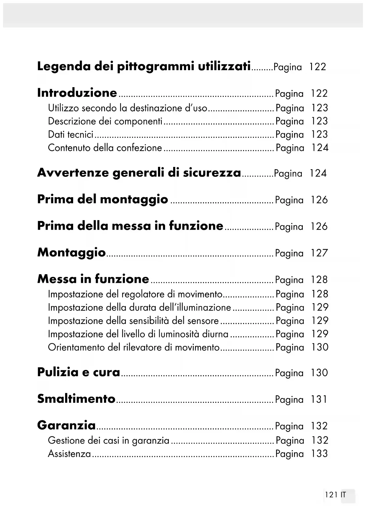 non reagisce ai movimenti all’interno dell’area di rilevazione. Pulizia e cura Prima di eseguire la pulizia nella scatola dei fusibili, rimuovere il fusibile oppure disattivare l‘interruttore di sicurezza. Non immergere mai il prodotto in acqua o in altri liquidi. In caso contrario il prodotto potrebbe subire danni.131 IT Pulire il prodotto con un panno leggermente inumidito e privo di peli, insieme a un detergente delicato. Dopo la pulizia e prima della rimessa in funzione reinserire il fusi- bile oppure attivare nuovamente l‘interruttore di sicurezza nella scatola dei fusibili. Smaltimento L’imballaggio è composto da materiali ecologici che possono essere smaltiti presso i siti di raccolta locali per il riciclo.