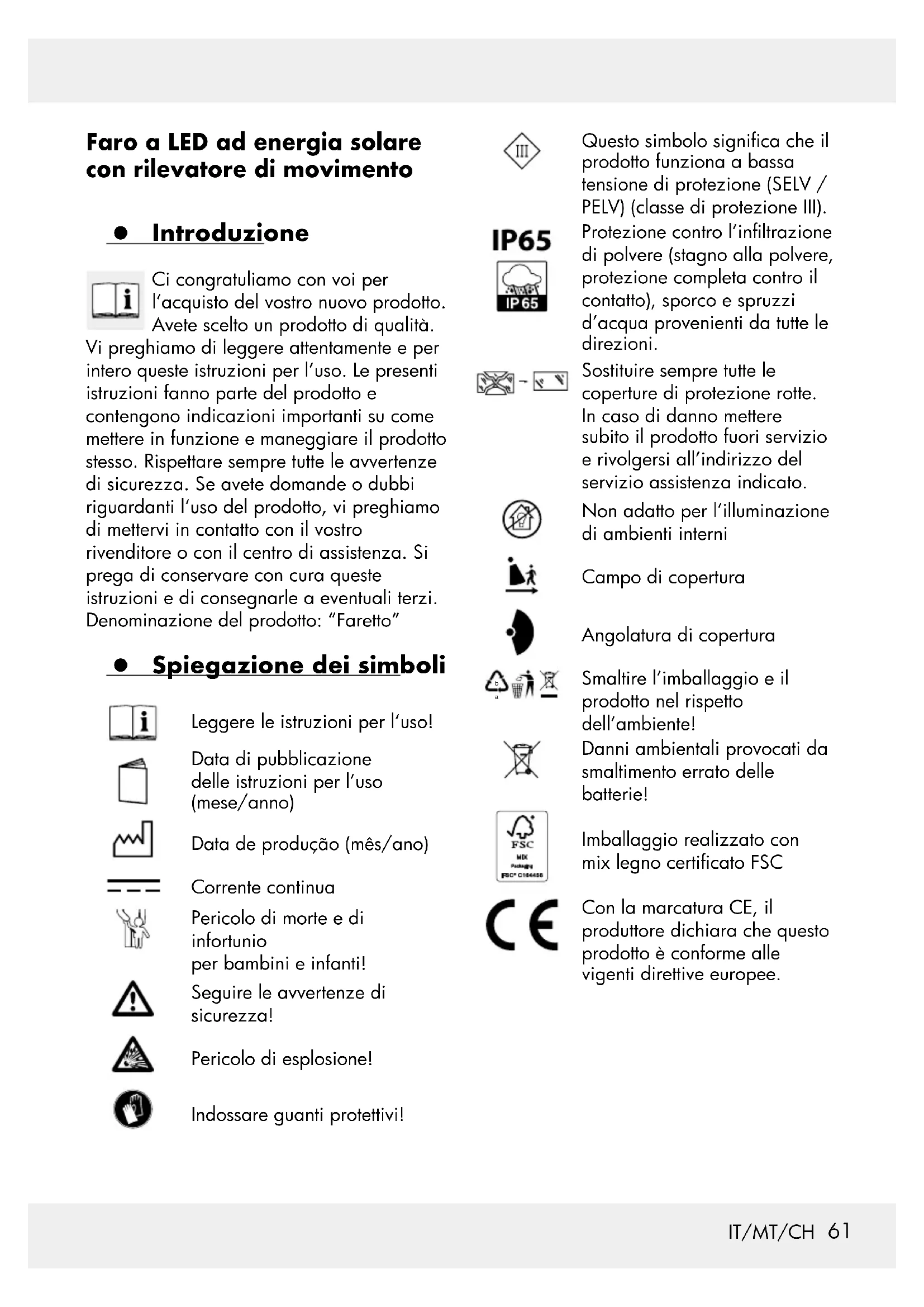 www.lidl-service.com oldalról ezt és sok további kézikönyvet, termékvideót és telepítő szoftvert tölthet le. A címoldalon lévő QR kód beolvasásával közvetlenül a Lidl szervizoldalára (www.lidl-service.com) jut és a cikkszám (IAN) 123456_7890 megadásával megnyithatja a teljes kezelési útmutatót.61 IT/MT/CH Faro a LED ad energia solare con rilevatore di movimento z Introduzione Ci congratuliamo con voi per l‘acquisto del vostro nuovo prodotto. Avete scelto un prodotto di qualità. Vi preghiamo di leggere attentamente e per intero queste istruzioni per l‘uso. Le presenti istruzioni fanno parte del prodotto e contengono indicazioni importanti su come mettere in funzione e maneggiare il prodotto stesso. Rispettare sempre tutte le avvertenze di sicurezza. Se avete domande o dubbi riguardanti l‘uso del prodotto, vi preghiamo di mettervi in contatto con il vostro rivenditore o con il centro di assistenza. Si prega di conservare con cura queste istruzioni e di consegnarle a eventuali terzi. Denominazione del prodotto: “Faretto” z Spiegazione dei simboli Leggere le istruzioni per l‘uso! Data di pubblicazione delle istruzioni per l’uso (mese/anno) Data de produção (mês/ano) Corrente continua Pericolo di morte e di infortunio per bambini e infanti! Seguire le avvertenze di sicurezza! Pericolo di esplosione! Indossare guanti protettivi! Questo simbolo signica che il prodotto funziona a bassa tensione di protezione (SELV / PELV) (classe di protezione III). Protezione contro l’inltrazione di polvere (stagno alla polvere, protezione completa contro il contatto), sporco e spruzzi d’acqua provenienti da tutte le direzioni. Sostituire sempre tutte le coperture di protezione rotte. In caso di danno mettere subito il prodotto fuori servizio e rivolgersi all’indirizzo del servizio assistenza indicato. Non adatto per l‘illuminazione di ambienti interni Campo di copertura Angolatura di copertura