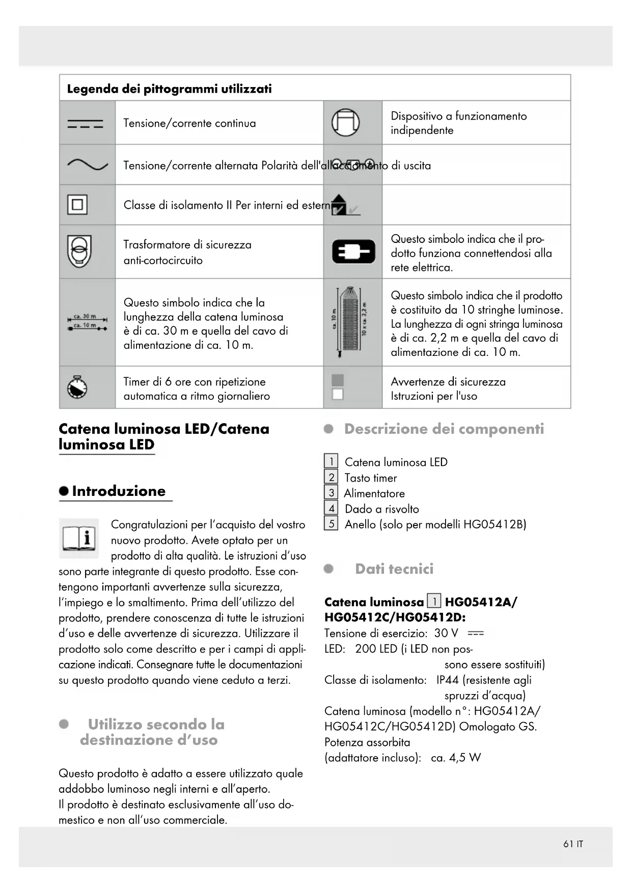 HG05412A/ HG05412C/HG05412D: Tensione nominale primaria: 220–240 V∼, 50/60 Hz Tensione nominale secondaria: 30 V , 6 W Classe di isolamento: Classe IP: IP44 (resistente agli spruzzi d‘acqua) Alimentatore (modello n° 22S0600G300W8D) Omologato GS. HG05412B: Tensione nominale primaria: 220–240 V∼, 50/60 Hz Tensione nominale secondaria: 30 V , 3,6 W Classe di protezione: Classe IP: IP44 (resistente agli spruzzi d‘acqua) Adattatore di rete (modello n° 22S0360G300W8D) Omologato GS. SELV: bassissima tensione di sicurezza (Safety extra low voltage) Ta: temperatura ambiente massima Tc: temperatura dell’alloggia- mento nel punto indicato HG05412A: bianco caldo HG05412B: bianco caldo HG05412C: multicolore HG05412D: bianco freddo Contenuto della confezione 1 catena luminosa LED 1 alimentatore 1 manuale di istruzioni per l‘uso Avvertenze in materia di sicurezza