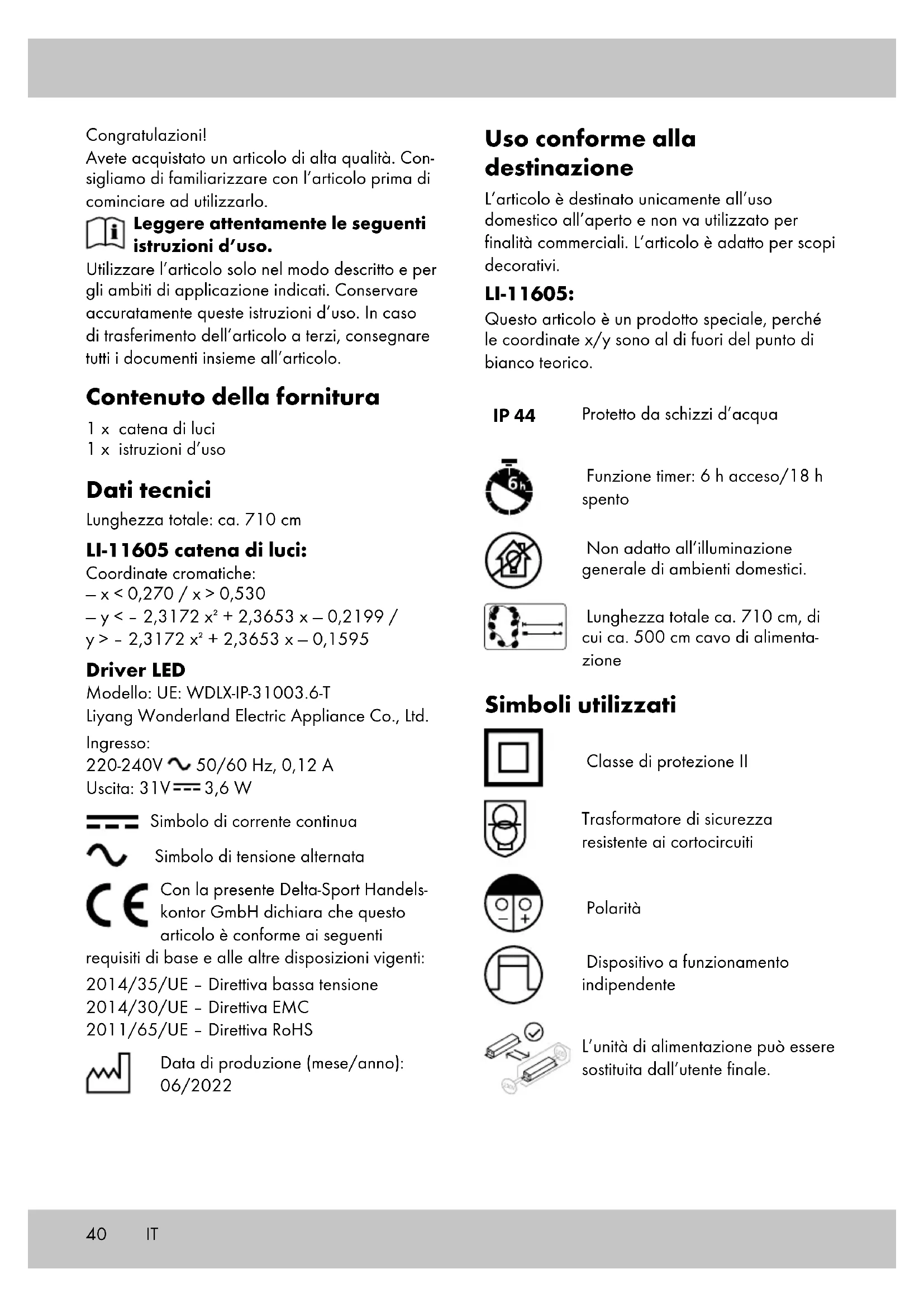 Mulighed for dæmpning af lyskilder Funktionsenheden er ikke egnet til dæmpning af lyskilder Funktionsenhedens udvendige mål Model: EU: WDLX-IP-31003.6-T – 102 x 41 x 41 mm Model BS WDLX- 31003.6-T – 106 x 49 x 46 mm Funktionsenhedens vægt Model: EU: WDLX-IP-31003.6-T: 50 g Model BS WDLX- 31003.6-T: 56 g Afmontering af funktionsenheden fra artiklen Træk funktionsenheden ud af stikkontakten, og adskil den fra artiklen Mulighed for kompatible dæmpbare lyskilder Funktionsenheden er ikke egnet til dæmpning af lyskilder40 Congratulazioni! Avete acquistato un articolo di alta qualità. Con- sigliamo di familiarizzare con l’articolo prima di cominciare ad utilizzarlo. Leggere attentamente le seguenti istruzioni d’uso. Utilizzare l’articolo solo nel modo descritto e per gli ambiti di applicazione indicati. Conservare accuratamente queste istruzioni d’uso. In caso di trasferimento dell’articolo a terzi, consegnare tutti i documenti insieme all’articolo. Contenuto della fornitura 1 x catena di luci 1 x istruzioni d’uso Dati tecnici Lunghezza totale: ca. 710 cm LI-11605 catena di luci: Coordinate cromatiche: — x < 0,270 / x > 0,530 — y < – 2,3172 x + 2,3653 x — 0,2199 / y > – 2,3172 x + 2,3653 x — 0,1595 Driver LED Modello: UE: WDLX-IP-31003.6-T Liyang Wonderland Electric Appliance Co., Ltd. Ingresso: 220-240V 50/60 Hz, 0,12 A Uscita: 31V 3,6 W Simbolo di corrente continua Simbolo di tensione alternata Con la presente Delta-Sport Handels- kontor GmbH dichiara che questo articolo è conforme ai seguenti requisiti di base e alle altre disposizioni vigenti: 2014/35/UE – Direttiva bassa tensione 2014/30/UE – Direttiva EMC 2011/65/UE – Direttiva RoHS Data di produzione (mese/anno): 06/2022 Uso conforme alla destinazione L’articolo è destinato unicamente all’uso domestico all’aperto e non va utilizzato per finalità commerciali. L’articolo è adatto per scopi decorativi. LI-11605: Questo articolo è un prodotto speciale, perché le coordinate x/y sono al di fuori del punto di bianco teorico. IP 44 Protetto da schizzi d’acqua Funzione timer: 6 h acceso/18 h spento Non adatto all’illuminazione generale di ambienti domestici. Lunghezza totale ca. 710 cm, di cui ca. 500 cm cavo di alimenta- zione Simboli utilizzati Classe di protezione II Trasformatore di sicurezza resistente ai cortocircuiti Polarità Dispositivo a funzionamento indipendente L’unità di alimentazione può essere sostituita dall’utente finale. IT41IT Indicazioni di sicurezza Importante: leggere attentamente le istruzioni d’uso e conservarle con cura. Pericolo di morte!
