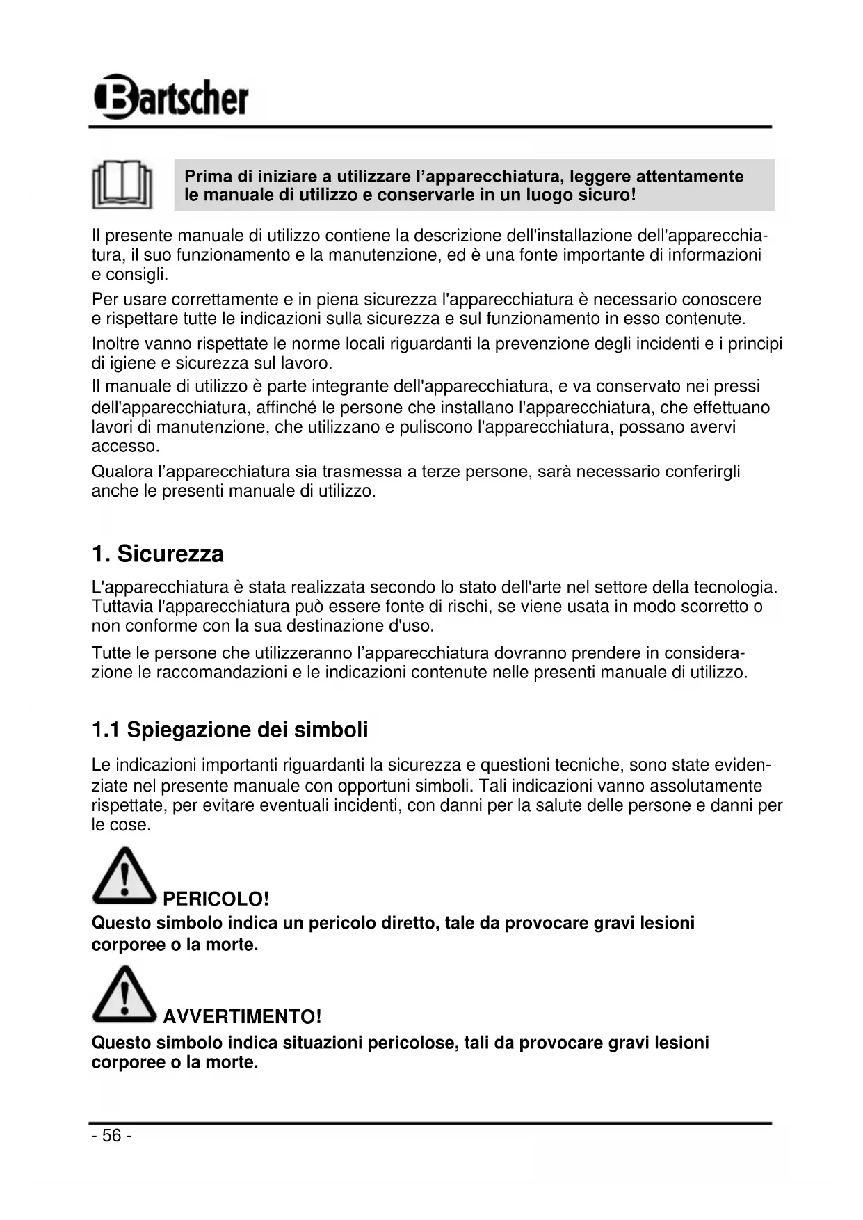 Il presente manuale di utilizzo contiene la descrizione dell'installazione dell'apparecchia- tura, il suo funzionamento e la manutenzione, ed è una fonte importante di informazioni e consigli. Per usare correttamente e in piena sicurezza l'apparecchiatura è necessario conoscere e rispettare tutte le indicazioni sulla sicurezza e sul funzionamento in esso contenute. Inoltre vanno rispettate le norme locali riguardanti la prevenzione degli incidenti e i principi di igiene e sicurezza sul lavoro. Il manuale di utilizzo è parte integrante dell'apparecchiatura, e va conservato nei pressi dell'apparecchiatura, affinché le persone che installano l'apparecchiatura, che effettuano lavori di manutenzione, che utilizzano e puliscono l'apparecchiatura, possano avervi accesso. Qualora l’apparecchiatura sia trasmessa a terze persone, sarà necessario conferirgli anche le presenti manuale di utilizzo.