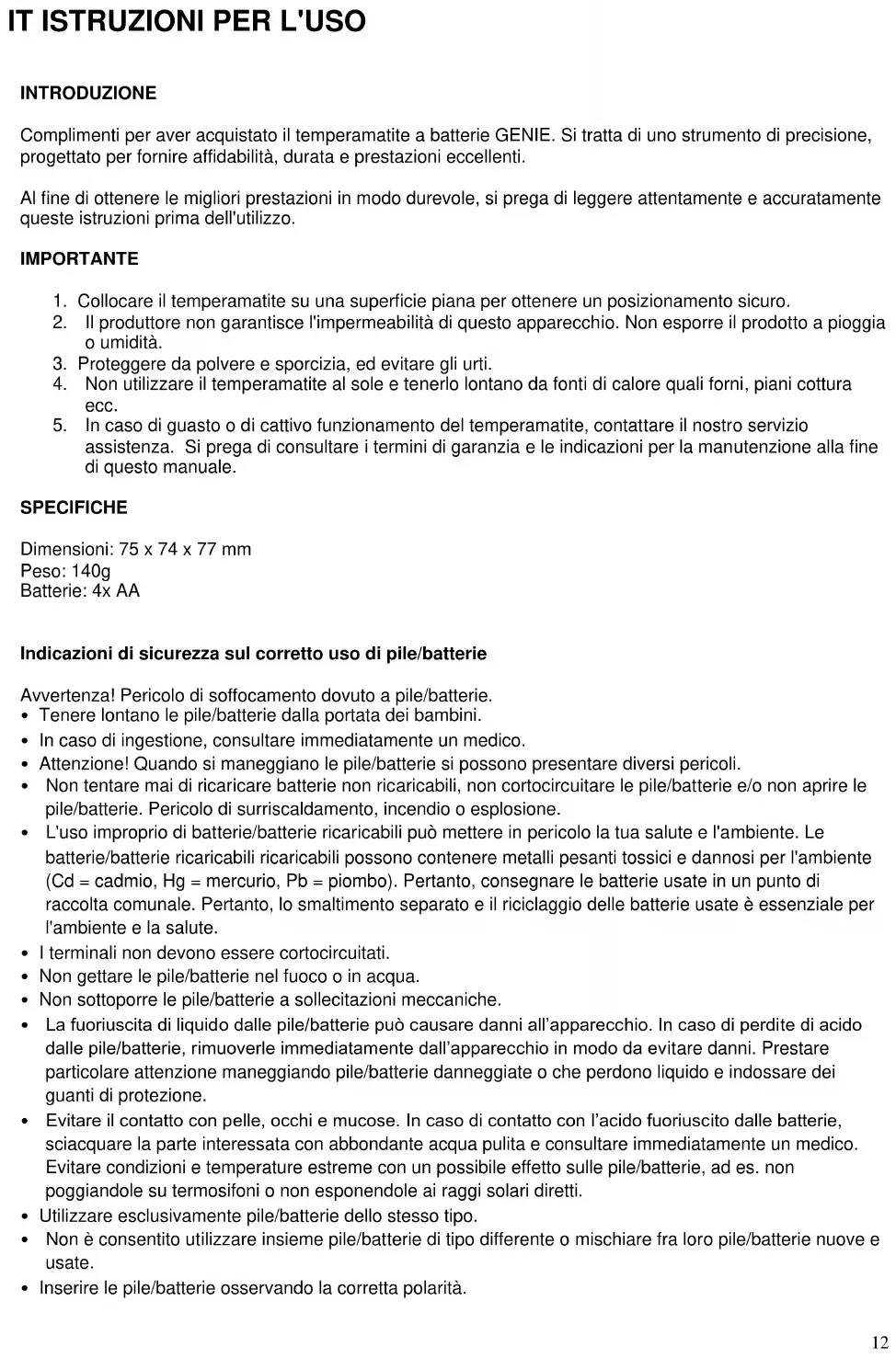 - Tenere lontano le pile/batterie dalla portata dei bambini.
