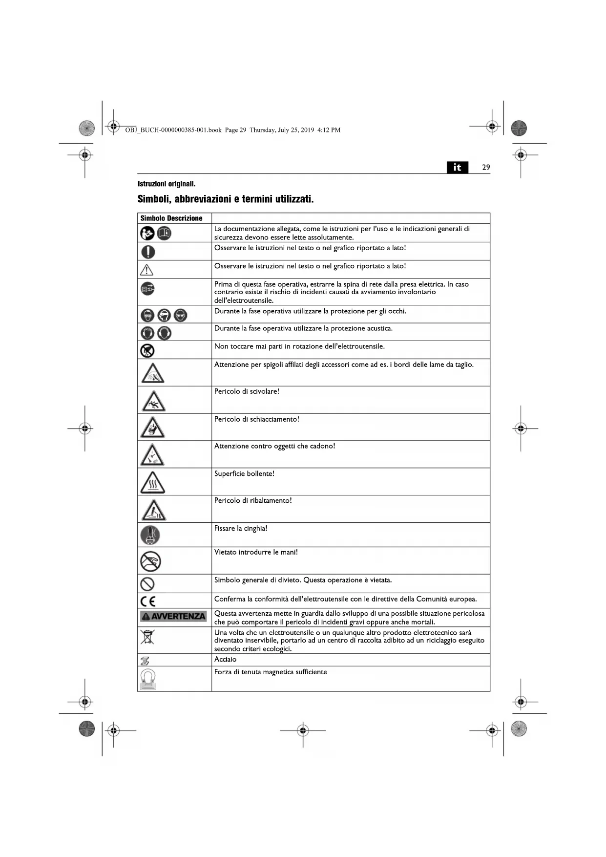 Istruzioni originali. Simboli, abbreviazioni e termini utilizzati. Simbolo Descrizione La documentazione allegata, come le istruzioni per l’uso e le indicazioni generali di sicurezza devono essere lette assolutamente. Osservare le istruzioni nel testo o nel grafico riportato a lato! Osservare le istruzioni nel testo o nel grafico riportato a lato! Prima di questa fase operativa, estrarre la spina di rete dalla presa elettrica. In caso contrario esiste il rischio di incidenti causati da avviamento involontario dell’elettroutensile. Durante la fase operativa utilizzare la protezione per gli occhi. Durante la fase operativa utilizzare la protezione acustica. Non toccare mai parti in rotazione dell’elettroutensile. Attenzione per spigoli affilati degli accessori come ad es. i bordi delle lame da taglio. Pericolo di scivolare! Pericolo di schiacciamento! Attenzione contro oggetti che cadono! Superficie bollente! Pericolo di ribaltamento! Fissare la cinghia! Vietato introdurre le mani! Simbolo generale di divieto. Questa operazione è vietata. Conferma la conformità dell’elettroutensile con le direttive della Comunità europea. Questa avvertenza mette in guardia dallo sviluppo di una possibile situazione pericolosa che può comportare il pericolo di incidenti gravi oppure anche mortali. Una volta che un elettroutensile o un qualunque altro prodotto elettrotecnico sarà diventato inservibile, portarlo ad un centro di raccolta adibito ad un riciclaggio eseguito secondo criteri ecologici. Acciaio Forza di tenuta magnetica sufficiente OBJ_BUCH-0000000385-001.book Page 29 Thursday, July 25, 2019 4:12 PM30