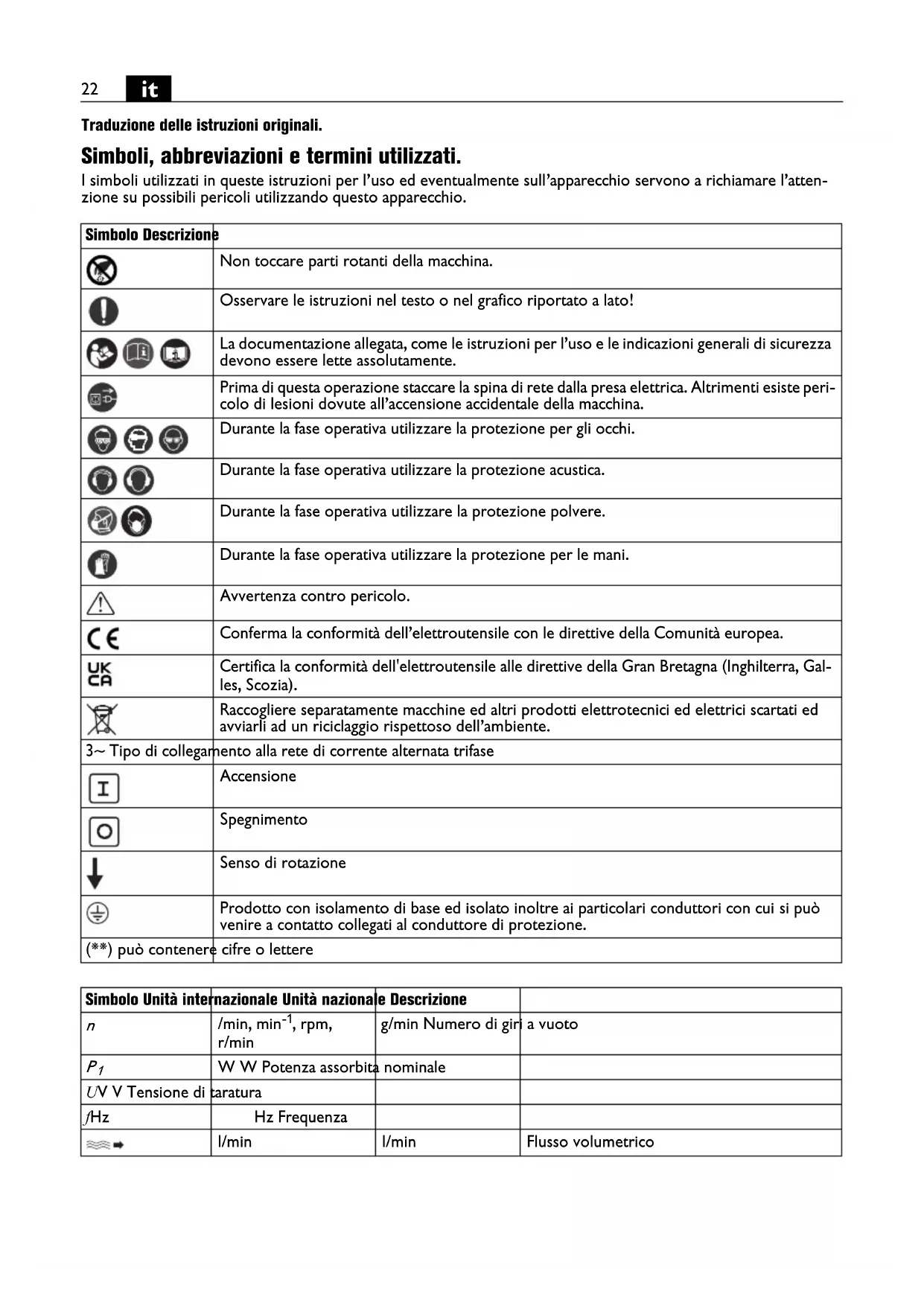 Traduzione delle istruzioni originali. Simboli, abbreviazioni e termini utilizzati. I simboli utilizzati in queste istruzioni per l’uso ed eventualmente sull’apparecchio servono a richiamare l’atten- zione su possibili pericoli utilizzando questo apparecchio. Simbolo Descrizione Non toccare parti rotanti della macchina. Osservare le istruzioni nel testo o nel grafico riportato a lato! La documentazione allegata, come le istruzioni per l’uso e le indicazioni generali di sicurezza devono essere lette assolutamente. Prima di questa operazione staccare la spina di rete dalla presa elettrica. Altrimenti esiste peri- colo di lesioni dovute all’accensione accidentale della macchina. Durante la fase operativa utilizzare la protezione per gli occhi. Durante la fase operativa utilizzare la protezione acustica. Durante la fase operativa utilizzare la protezione polvere. Durante la fase operativa utilizzare la protezione per le mani. Avvertenza contro pericolo. Conferma la conformità dell’elettroutensile con le direttive della Comunità europea. Certifica la conformità dell'elettroutensile alle direttive della Gran Bretagna (Inghilterra, Gal- les, Scozia). Raccogliere separatamente macchine ed altri prodotti elettrotecnici ed elettrici scartati ed avviarli ad un riciclaggio rispettoso dell’ambiente. 3~ Tipo di collegamento alla rete di corrente alternata trifase Accensione Spegnimento Senso di rotazione Prodotto con isolamento di base ed isolato inoltre ai particolari conduttori con cui si può venire a contatto collegati al conduttore di protezione. (**) può contenere cifre o lettere Simbolo Unità internazionale Unità nazionale Descrizione