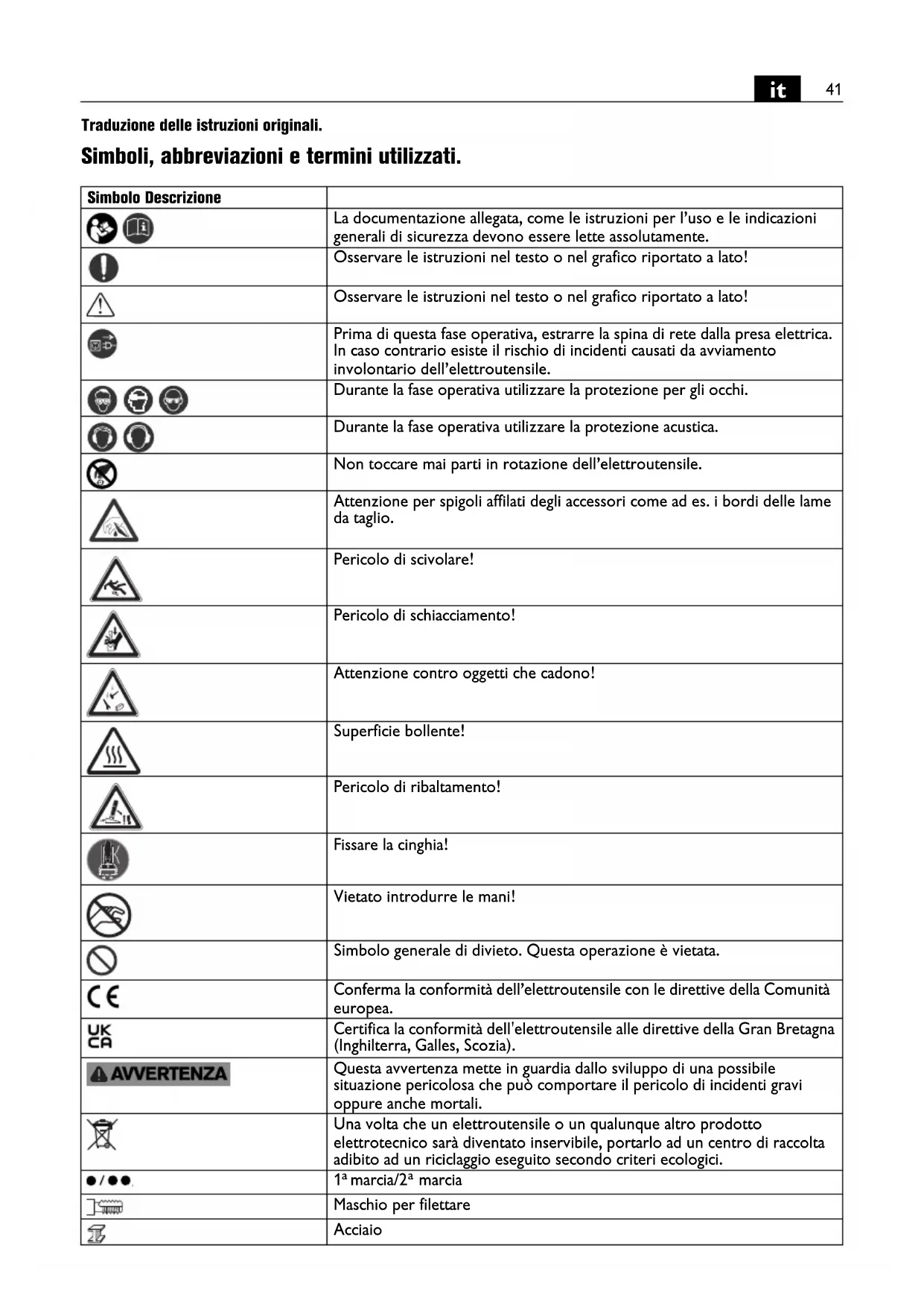 Traduzione delle istruzioni originali. Simboli, abbreviazioni e termini utilizzati. Simbolo Descrizione La documentazione allegata, come le istruzioni per l’uso e le indicazioni generali di sicurezza devono essere lette assolutamente. Osservare le istruzioni nel testo o nel grafico riportato a lato! Osservare le istruzioni nel testo o nel grafico riportato a lato! Prima di questa fase operativa, estrarre la spina di rete dalla presa elettrica. In caso contrario esiste il rischio di incidenti causati da avviamento involontario dell’elettroutensile. Durante la fase operativa utilizzare la protezione per gli occhi. Durante la fase operativa utilizzare la protezione acustica. Non toccare mai parti in rotazione dell’elettroutensile. Attenzione per spigoli affilati degli accessori come ad es. i bordi delle lame da taglio. Pericolo di scivolare! Pericolo di schiacciamento! Attenzione contro oggetti che cadono! Superficie bollente! Pericolo di ribaltamento! Fissare la cinghia! Vietato introdurre le mani! Simbolo generale di divieto. Questa operazione è vietata. Conferma la conformità dell’elettroutensile con le direttive della Comunità europea. Certifica la conformità dell'elettroutensile alle direttive della Gran Bretagna (Inghilterra, Galles, Scozia). Questa avvertenza mette in guardia dallo sviluppo di una possibile situazione pericolosa che può comportare il pericolo di incidenti gravi oppure anche mortali. Una volta che un elettroutensile o un qualunque altro prodotto elettrotecnico sarà diventato inservibile, portarlo ad un centro di raccolta adibito ad un riciclaggio eseguito secondo criteri ecologici.