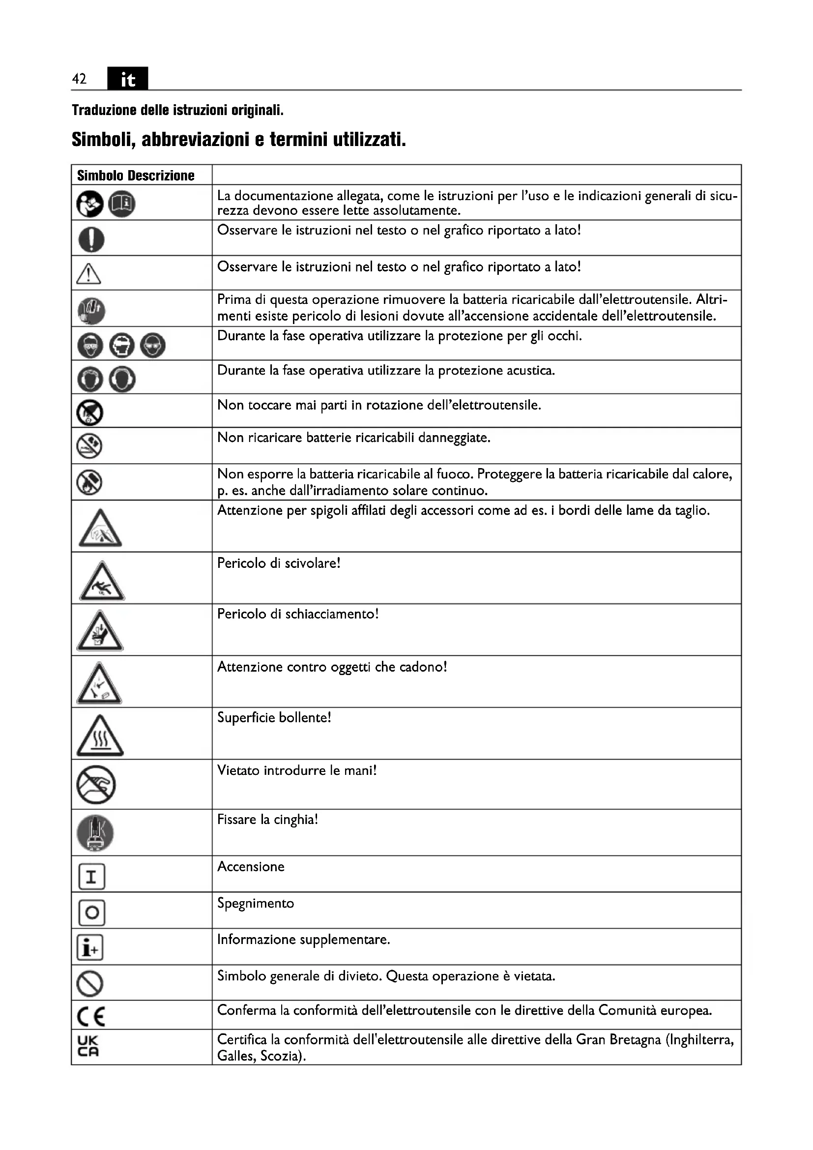 Traduzione delle istruzioni originali. Simboli, abbreviazioni e termini utilizzati. Simbolo Descrizione La documentazione allegata, come le istruzioni per l’uso e le indicazioni generali di sicu- rezza devono essere lette assolutamente. Osservare le istruzioni nel testo o nel grafico riportato a lato! Osservare le istruzioni nel testo o nel grafico riportato a lato! Prima di questa operazione rimuovere la batteria ricaricabile dall’elettroutensile. Altri- menti esiste pericolo di lesioni dovute all’accensione accidentale dell’elettroutensile. Durante la fase operativa utilizzare la protezione per gli occhi. Durante la fase operativa utilizzare la protezione acustica. Non toccare mai parti in rotazione dell’elettroutensile. Non ricaricare batterie ricaricabili danneggiate. Non esporre la batteria ricaricabile al fuoco. Proteggere la batteria ricaricabile dal calore, p. es. anche dall’irradiamento solare continuo. Attenzione per spigoli affilati degli accessori come ad es. i bordi delle lame da taglio. Pericolo di scivolare! Pericolo di schiacciamento! Attenzione contro oggetti che cadono! Superficie bollente! Vietato introdurre le mani! Fissare la cinghia! Accensione Spegnimento Informazione supplementare. Simbolo generale di divieto. Questa operazione è vietata. Conferma la conformità dell’elettroutensile con le direttive della Comunità europea. Certifica la conformità dell'elettroutensile alle direttive della Gran Bretagna (Inghilterra, Galles, Scozia).43