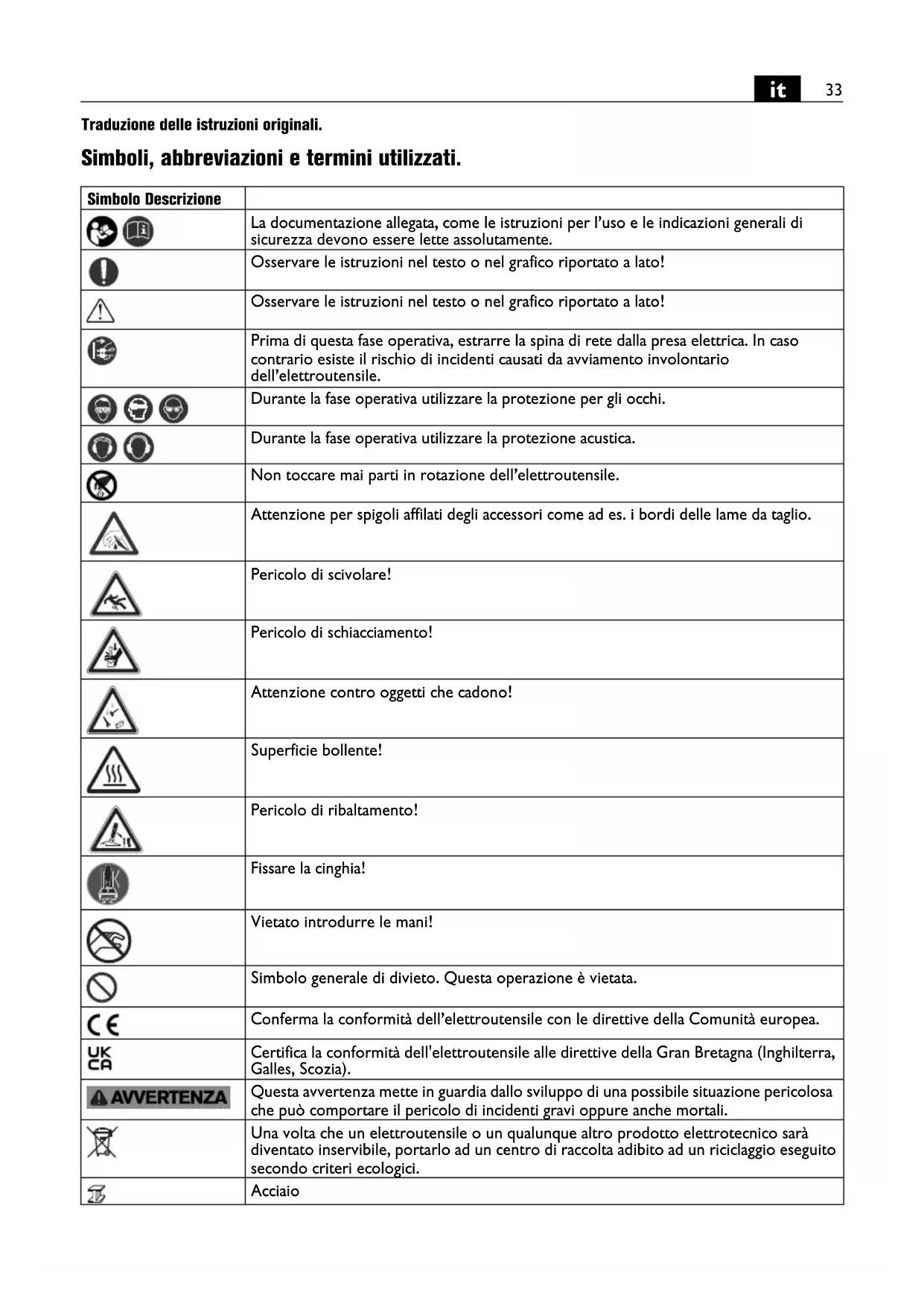 Traduzione delle istruzioni originali. Simboli, abbreviazioni e termini utilizzati. Simbolo Descrizione La documentazione allegata, come le istruzioni per l’uso e le indicazioni generali di sicurezza devono essere lette assolutamente. Osservare le istruzioni nel testo o nel grafico riportato a lato! Osservare le istruzioni nel testo o nel grafico riportato a lato! Prima di questa fase operativa, estrarre la spina di rete dalla presa elettrica. In caso contrario esiste il rischio di incidenti causati da avviamento involontario dell’elettroutensile. Durante la fase operativa utilizzare la protezione per gli occhi. Durante la fase operativa utilizzare la protezione acustica. Non toccare mai parti in rotazione dell’elettroutensile. Attenzione per spigoli affilati degli accessori come ad es. i bordi delle lame da taglio. Pericolo di scivolare! Pericolo di schiacciamento! Attenzione contro oggetti che cadono! Superficie bollente! Pericolo di ribaltamento! Fissare la cinghia! Vietato introdurre le mani! Simbolo generale di divieto. Questa operazione è vietata. Conferma la conformità dell’elettroutensile con le direttive della Comunità europea. Certifica la conformità dell'elettroutensile alle direttive della Gran Bretagna (Inghilterra, Galles, Scozia). Questa avvertenza mette in guardia dallo sviluppo di una possibile situazione pericolosa che può comportare il pericolo di incidenti gravi oppure anche mortali. Una volta che un elettroutensile o un qualunque altro prodotto elettrotecnico sarà diventato inservibile, portarlo ad un centro di raccolta adibito ad un riciclaggio eseguito secondo criteri ecologici. Acciaio34