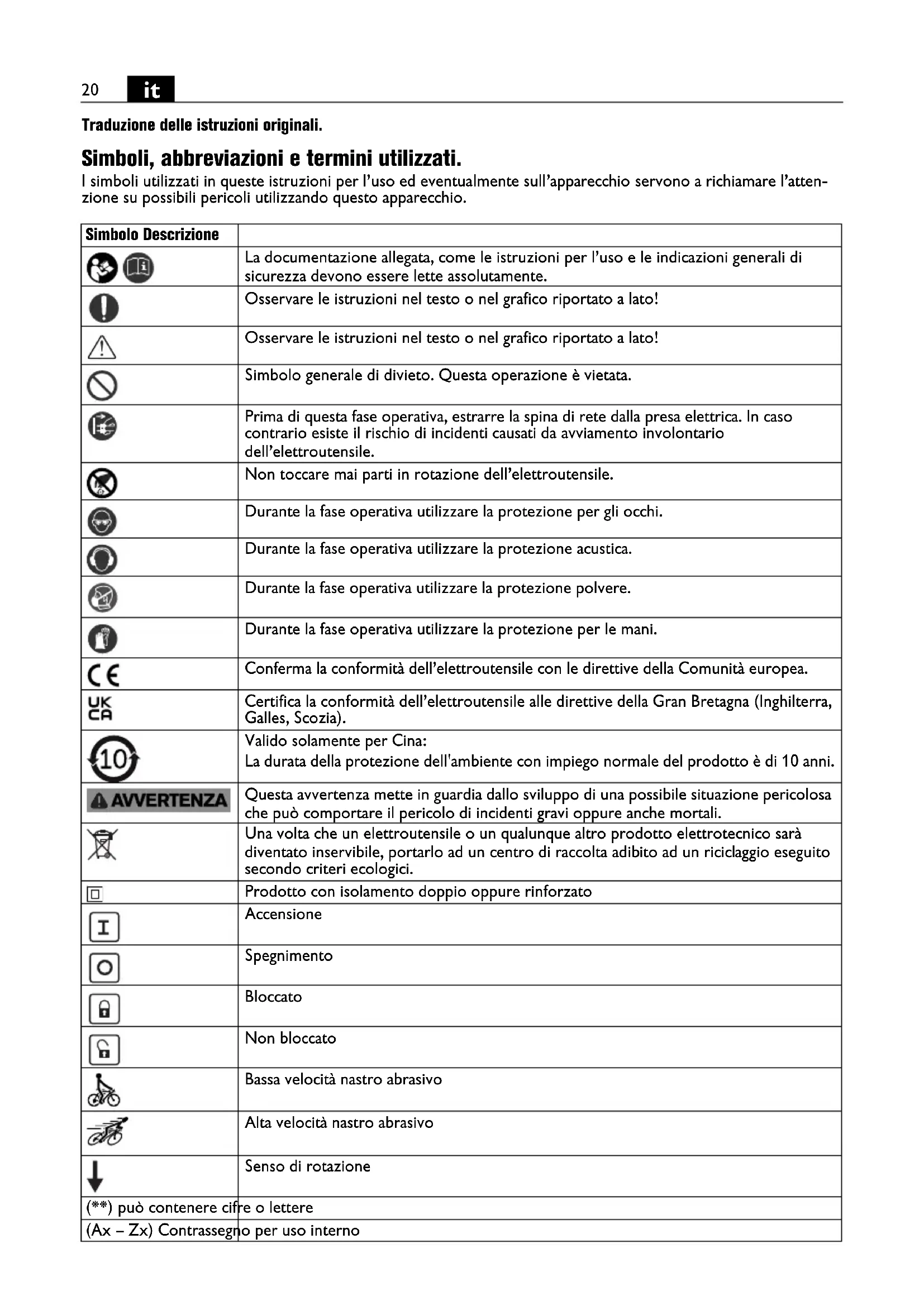 Traduzione delle istruzioni originali. Simboli, abbreviazioni e termini utilizzati. I simboli utilizzati in queste istruzioni per l’uso ed eventualmente sull’apparecchio servono a richiamare l’atten- zione su possibili pericoli utilizzando questo apparecchio. Simbolo Descrizione La documentazione allegata, come le istruzioni per l’uso e le indicazioni generali di sicurezza devono essere lette assolutamente. Osservare le istruzioni nel testo o nel grafico riportato a lato! Osservare le istruzioni nel testo o nel grafico riportato a lato! Simbolo generale di divieto. Questa operazione è vietata. Prima di questa fase operativa, estrarre la spina di rete dalla presa elettrica. In caso contrario esiste il rischio di incidenti causati da avviamento involontario dell’elettroutensile. Non toccare mai parti in rotazione dell’elettroutensile. Durante la fase operativa utilizzare la protezione per gli occhi. Durante la fase operativa utilizzare la protezione acustica. Durante la fase operativa utilizzare la protezione polvere. Durante la fase operativa utilizzare la protezione per le mani. Conferma la conformità dell’elettroutensile con le direttive della Comunità europea. Certifica la conformità dell’elettroutensile alle direttive della Gran Bretagna (Inghilterra, Galles, Scozia). Valido solamente per Cina: La durata della protezione dell'ambiente con impiego normale del prodotto è di 10 anni. Questa avvertenza mette in guardia dallo sviluppo di una possibile situazione pericolosa che può comportare il pericolo di incidenti gravi oppure anche mortali. Una volta che un elettroutensile o un qualunque altro prodotto elettrotecnico sarà diventato inservibile, portarlo ad un centro di raccolta adibito ad un riciclaggio eseguito secondo criteri ecologici. Prodotto con isolamento doppio oppure rinforzato Accensione Spegnimento Bloccato Non bloccato Bassa velocità nastro abrasivo Alta velocità nastro abrasivo Senso di rotazione (**) può contenere cifre o lettere (Ax – Zx) Contrassegno per uso interno21