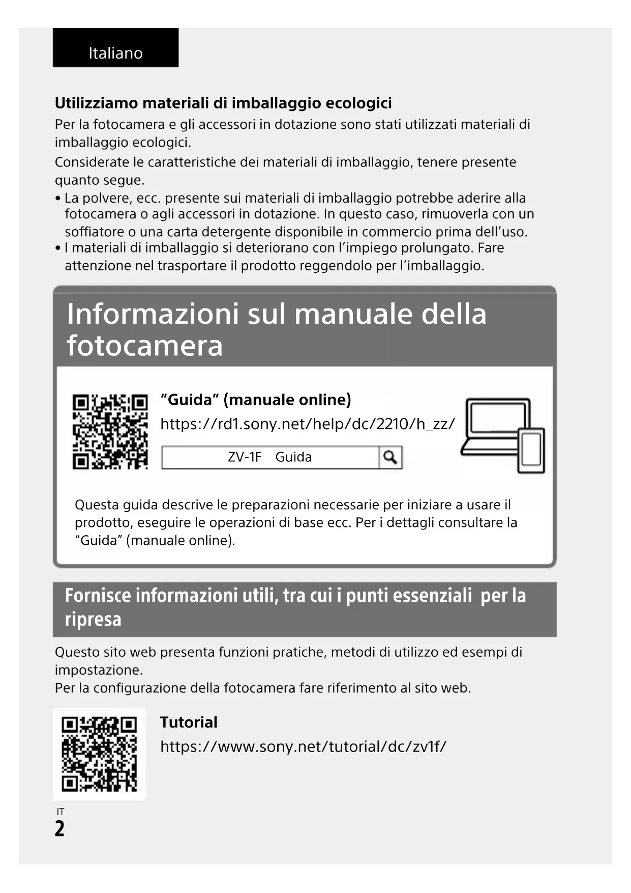 \\win-473\CAMERA\CX64700(YT)_SG\Multi\04_Compose\5041855311_17lang_STT\5041855311ZV1FCE3\04IT-ZV1FCE3\04IT.indd DTP data saved: 2022/07/06 12:11 PDF file created: 2022/07/06 12:12 Italiano Utilizziamo materiali di imballaggio ecologici Per la fotocamera e gli accessori in dotazione sono stati utilizzati materiali di imballaggio ecologici.Considerate le caratteristiche dei materiali di imballaggio, tenere presente quanto segue.• La polvere, ecc. presente sui materiali di imballaggio potrebbe aderire alla fotocamera o agli accessori in dotazione. In questo caso, rimuoverla con un soffiatore o una carta detergente disponibile in commercio prima dell’uso.• I materiali di imballaggio si deteriorano con l’impiego prolungato. Fare attenzione nel trasportare il prodotto reggendolo per l’imballaggio. Informazioni sul manuale della fotocamera https://rd1.sony.net/help/dc/2210/h_zz/ “Guida” (manuale online) ZV-1F GuidaQuesta guida descrive le preparazioni necessarie per iniziare a usare il prodotto, eseguire le operazioni di base ecc. Per i dettagli consultare la “Guida” (manuale online). Fornisce informazioni utili, tra cui i punti essenziali per la ripresa Questo sito web presenta funzioni pratiche, metodi di utilizzo ed esempi di impostazione.Per la configurazione della fotocamera fare riferimento al sito web. https://www.sony.net/tutorial/dc/zv1f/ TutorialZV-1F 5-041-855-31(1)