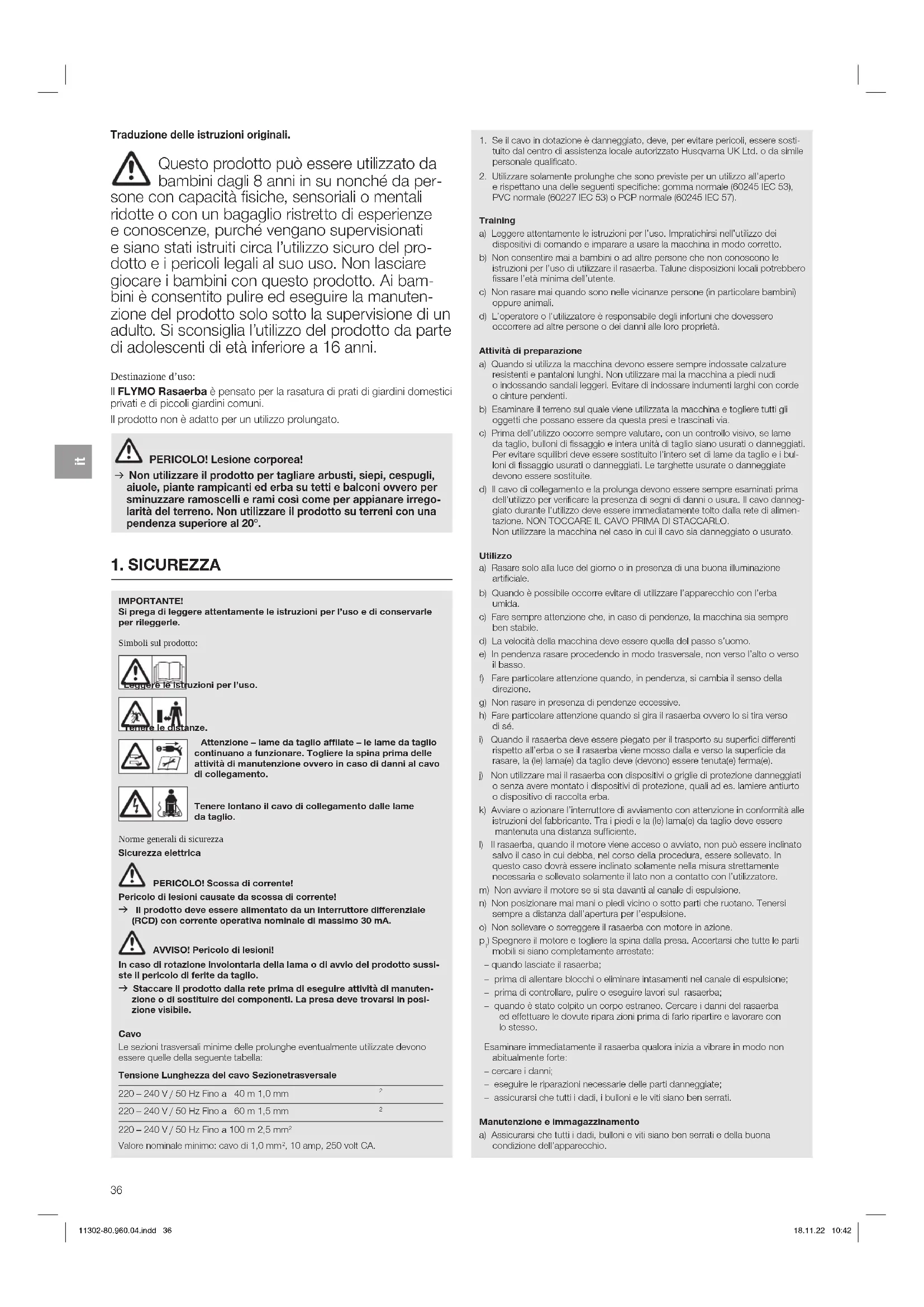 ) Spegnere il motore e togliere la spina dalla presa. Accertarsi che tutte le parti mobili si siano completamente arrestate: – quando lasciate il rasaerba; – prima di allentare blocchi o eliminare intasamenti nel canale di espulsione; – prima di controllare, pulire o eseguire lavori sul rasaerba; – quando è stato colpito un corpo estraneo. Cercare i danni del rasaerba ed effettuare le dovute ripara zioni prima di farlo ripartire e lavorare con lo stesso. Esaminare immediatamente il rasaerba qualora inizia a vibrare in modo non abitualmente forte: – cercare i danni; – eseguire le riparazioni necessarie delle parti danneggiate; – assicurarsi che tutti i dadi, i bulloni e le viti siano ben serrati. Manutenzione e immagazzinamento a) Assicurarsi che tutti i dadi, bulloni e viti siano ben serrati e della buona condizione dell’apparecchio. Traduzione delle istruzioni originali. Questo prodotto può essere utilizzato da bambini dagli 8 anni in su nonché da per- sone con capacità fisiche, sensoriali o mentali ridotte o con un bagaglio ristretto di esperienze econoscenze, purché vengano supervisionati esiano stati istruiti circa l’utilizzo sicuro del pro- dotto e i pericoli legali al suo uso. Non lasciare giocare i bambini con questo prodotto. Ai bam- biniè consentito pulire ed eseguire la manuten- zione del prodotto solo sotto la supervisione di un adulto. Si sconsiglia l’utilizzo del prodotto da parte di adolescenti di età inferiore a 16 anni. Destinazione d’uso: Il FLYMO Rasaerba è pensato per la rasatura di prati di giardini domestici privati e di piccoli giardini comuni. Il prodotto non è adatto per un utilizzo prolungato. PERICOLO! Lesione corporea! v Non utilizzare il prodotto per tagliare arbusti, siepi, cespugli, aiuole, piante rampicanti ed erba su tetti e balconi ovvero per sminuzzare ramoscelli e rami così come per appianare irrego- larità del terreno. Non utilizzare il prodotto su terreni con una pendenza superiore al 20°. 11302-80.960.04.indd 3611302-80.960.04.indd 36 18.11.22 10:4218.11.22 10:4237
