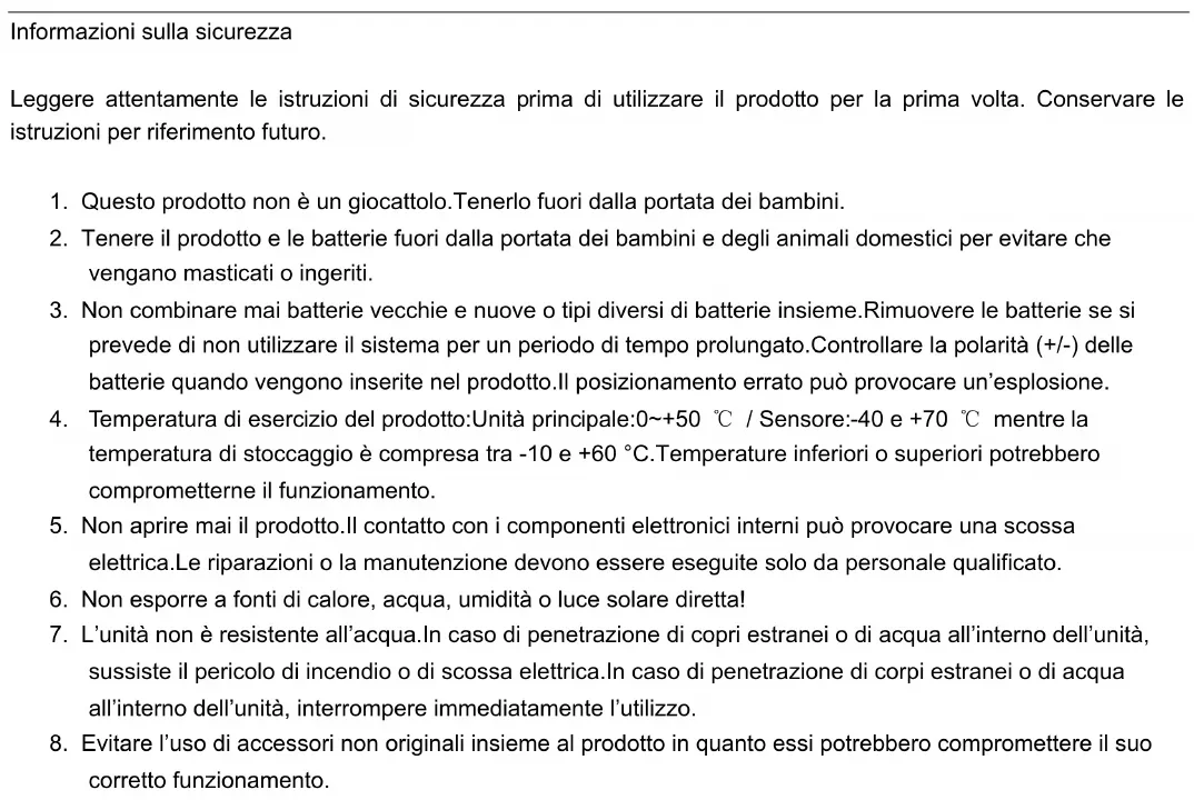 - Temperatura di esercizio del prodotto: Unità principale: 0 +50^ C / Sensore: -40 e + 70^ C perché la temperatura di stoccaggio è compresa tra -10 e + 60^ C . Temperature inferiori o superiori potrebbero comprometerne il funzionamento.